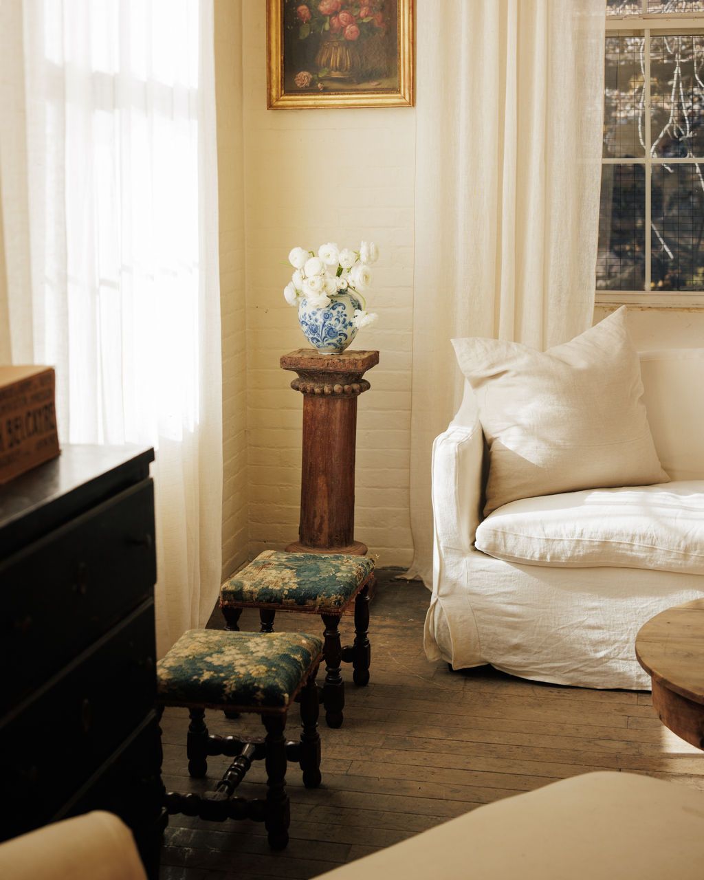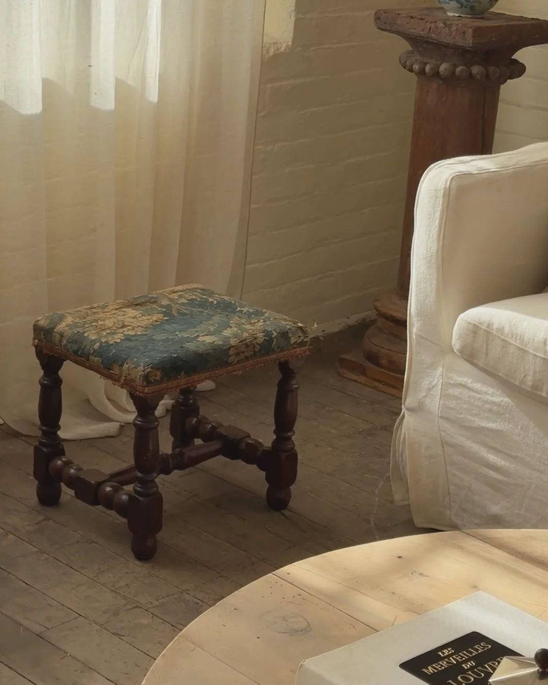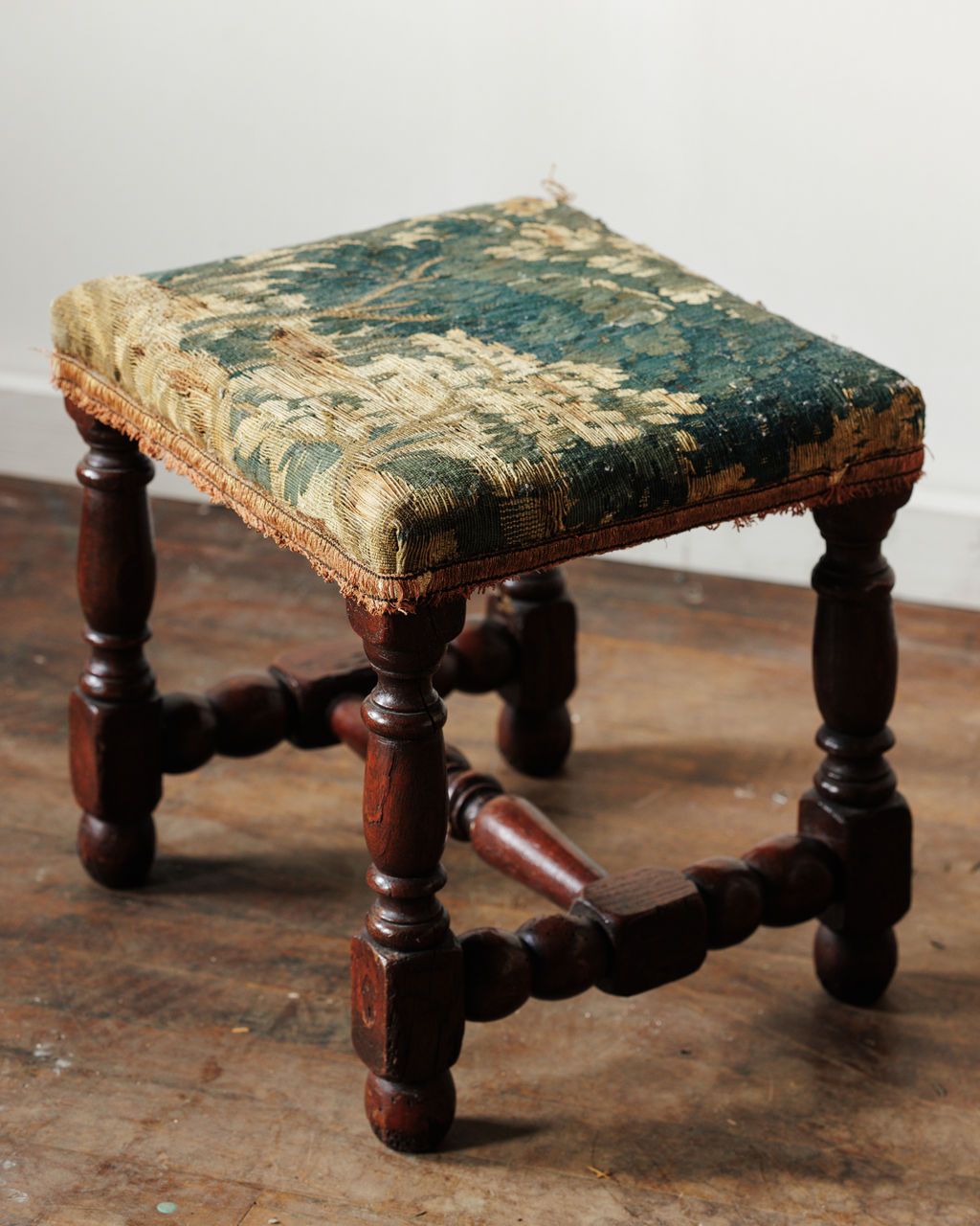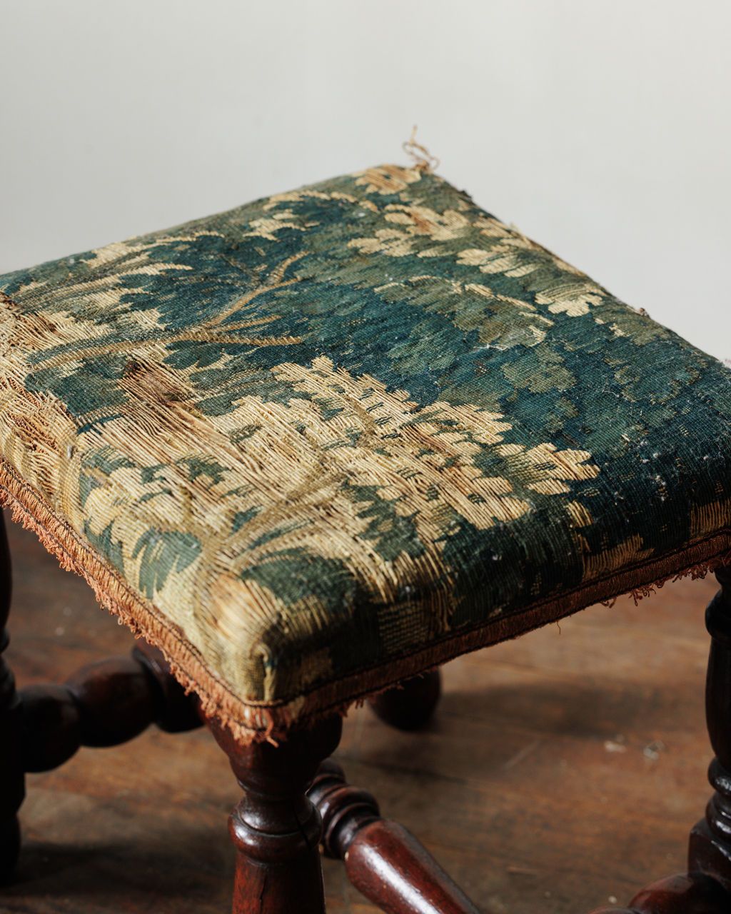 There’s something magnetic about a stool that’s been upholstered in true 17th-century tapestry. Workshops of the time treated these textiles like small artworks, weaving sturdy wool blends that could handle being sat on while still showing off intricate patterns and dye work. Sylvie loves it as an accent seat, a spot for a stack of books, or a small companion to a favorite armchair.