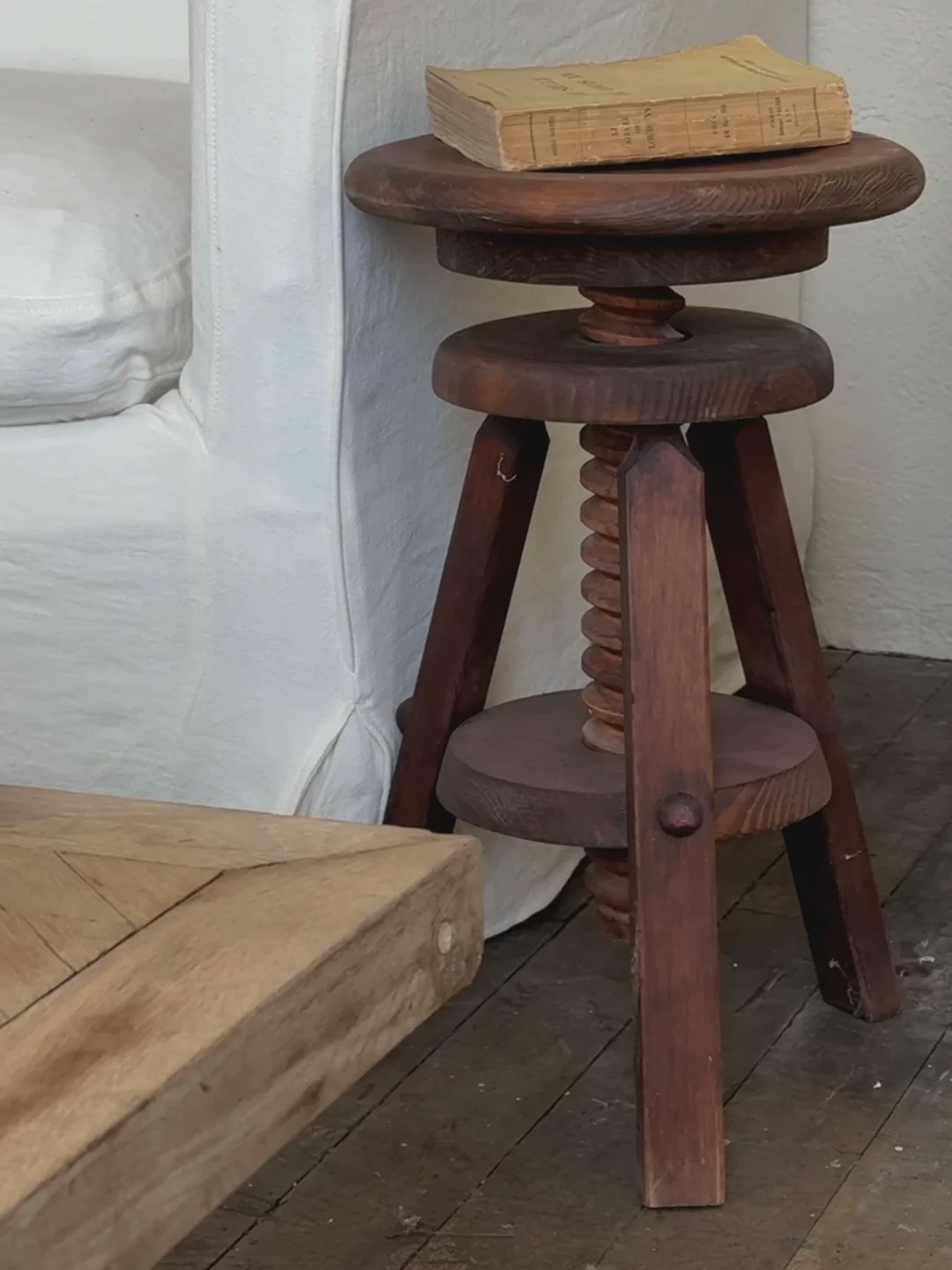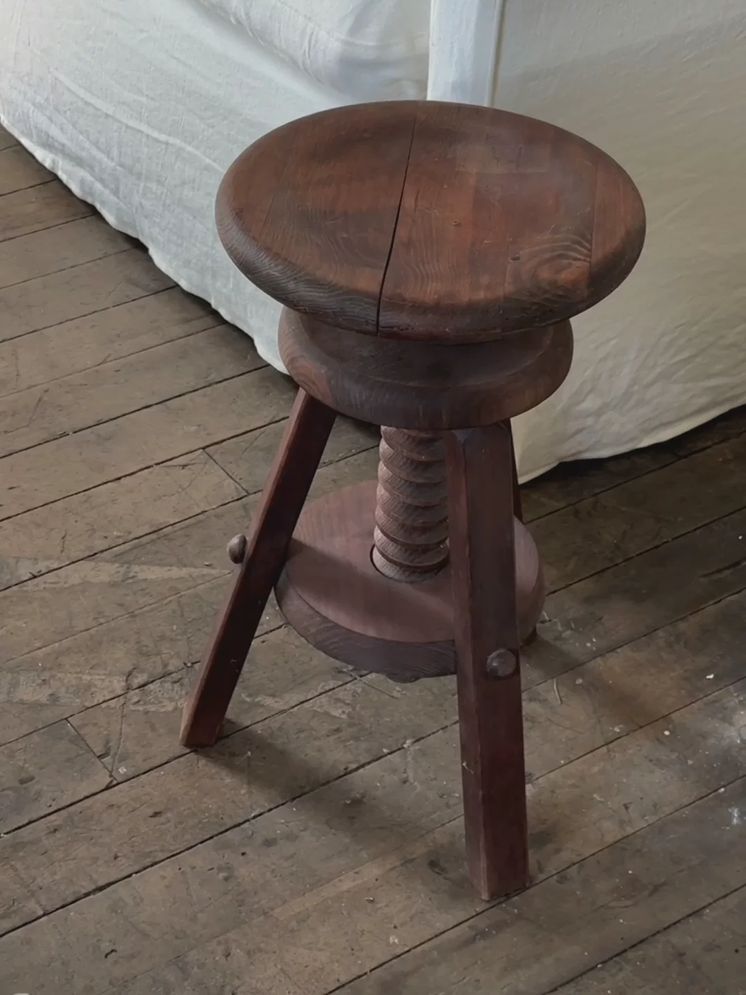 This 1920s adjustable wooden stool has a seat that rotates to move up or down, resting on three sturdy tripod legs. Perfect for your sofa's side table, bathroom pedestal or entry way moment.