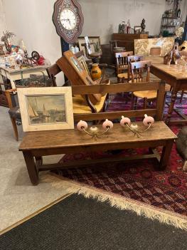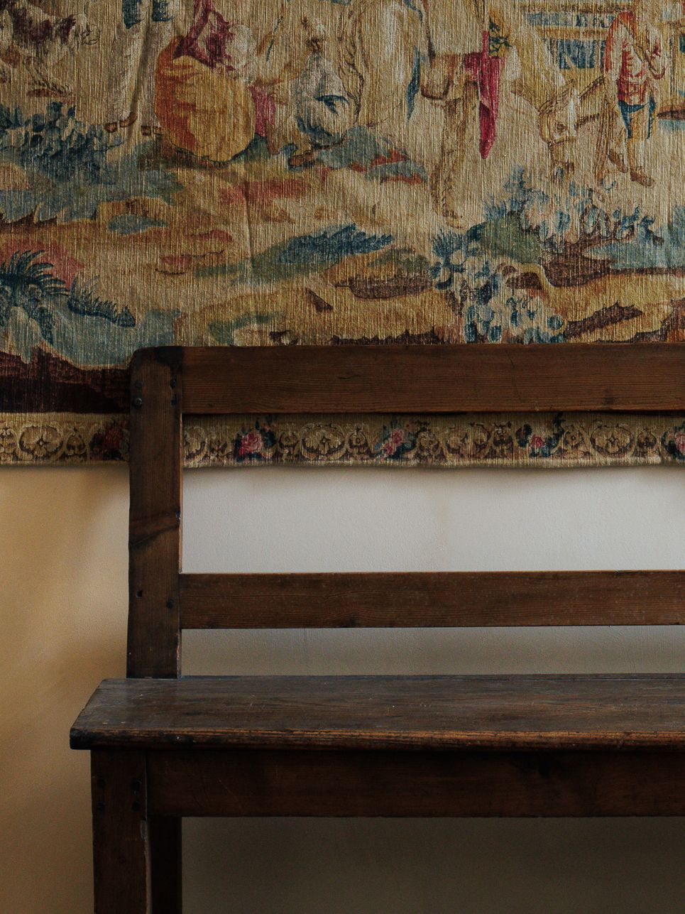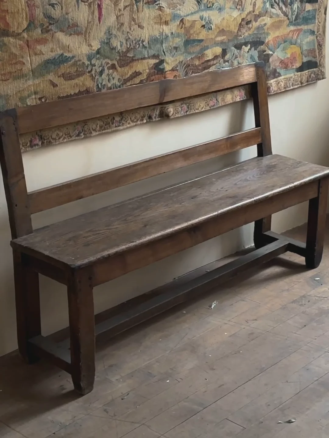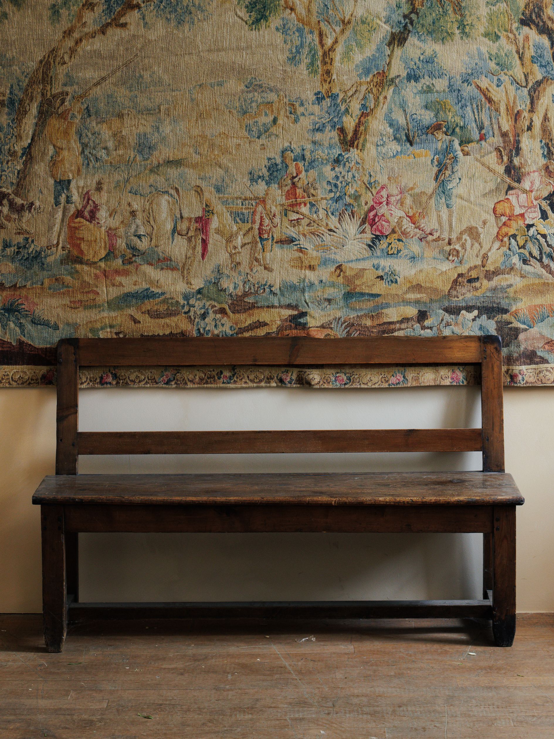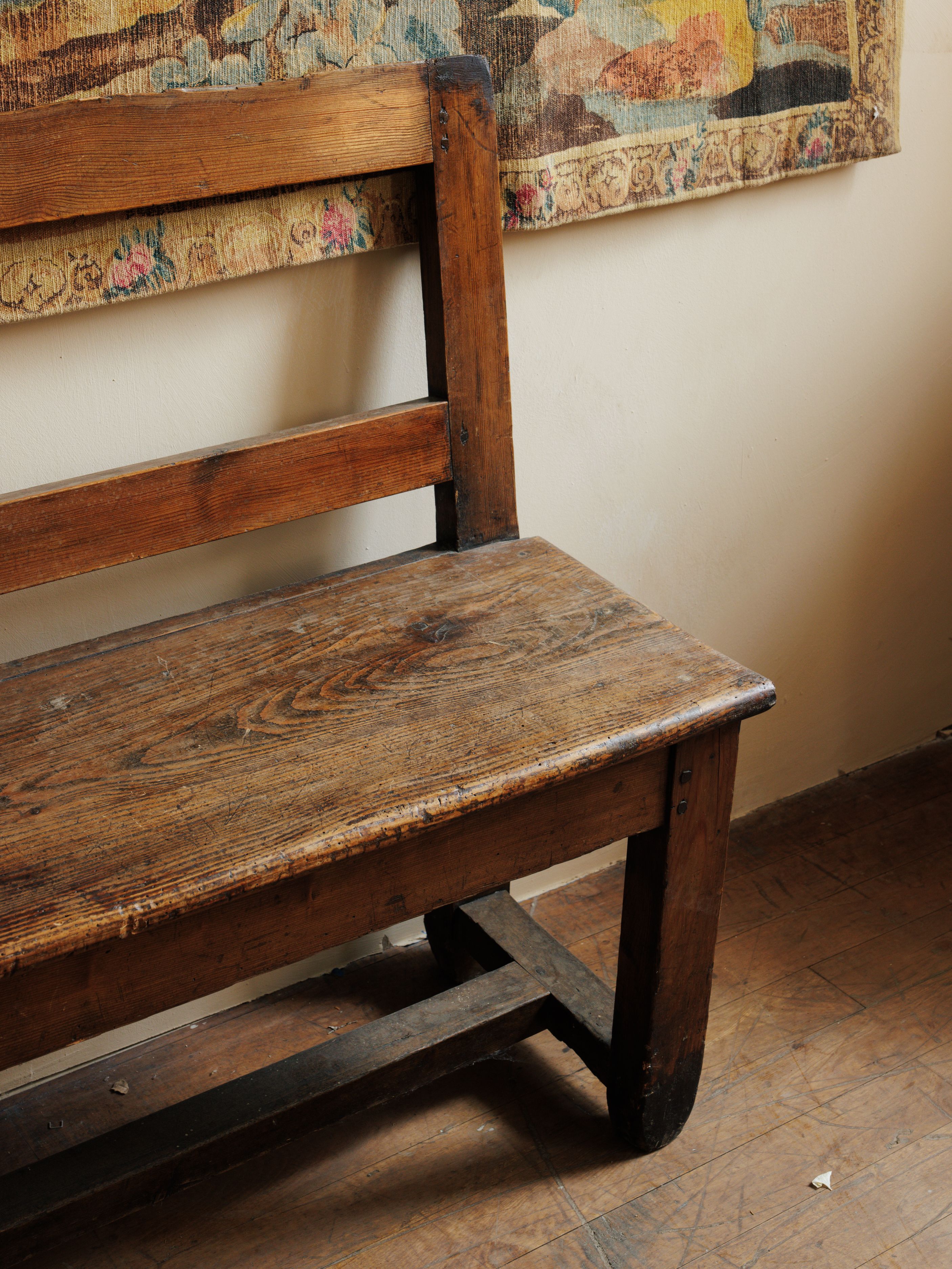 This 19th-century solid wood bench, originally used in a church, features a live-edge wood detail along the seat back. With all its years of use its got a slight wobble, but still completely functional as a hallway bench for taking on and off your high heels, or sneakers.