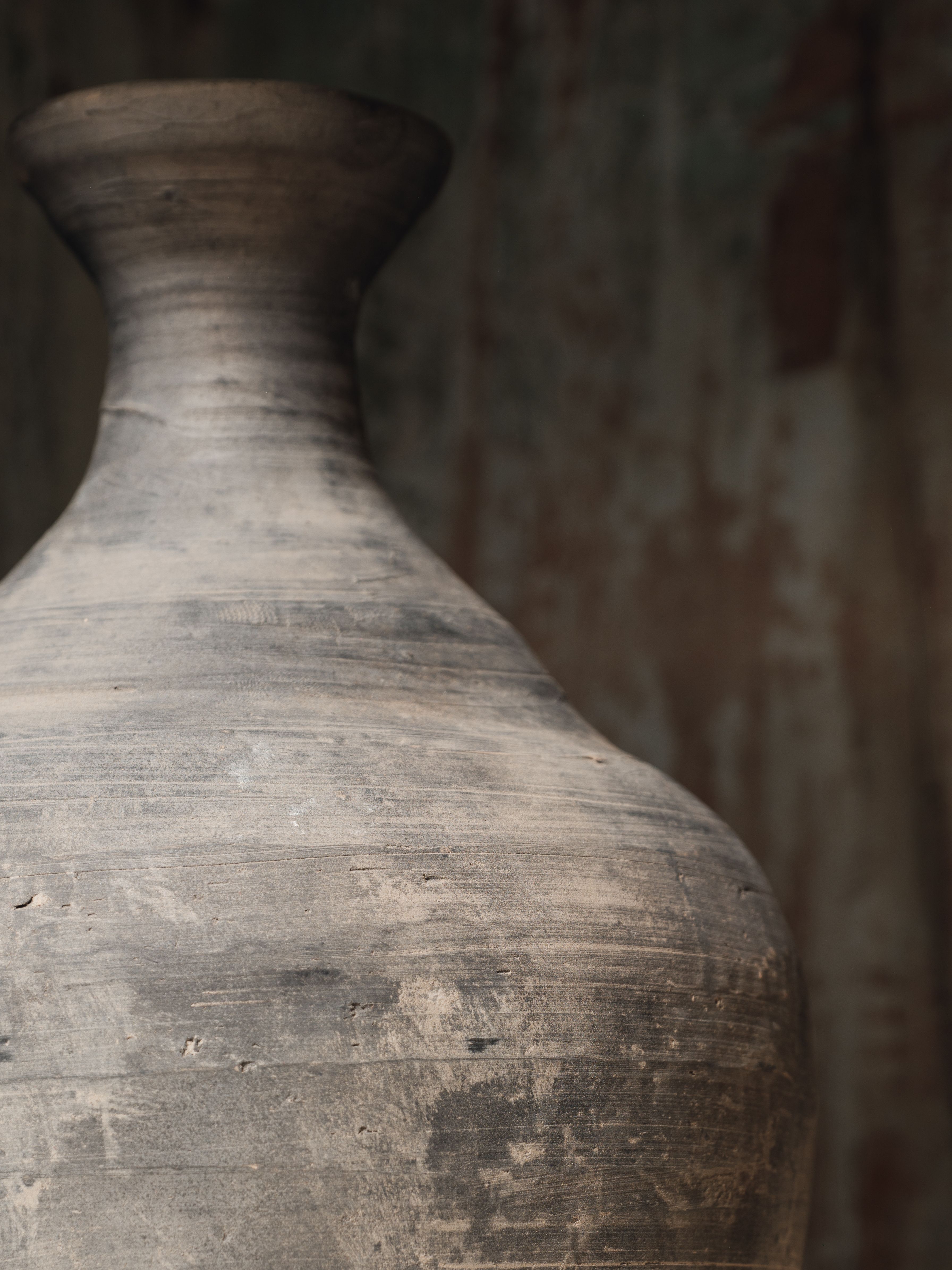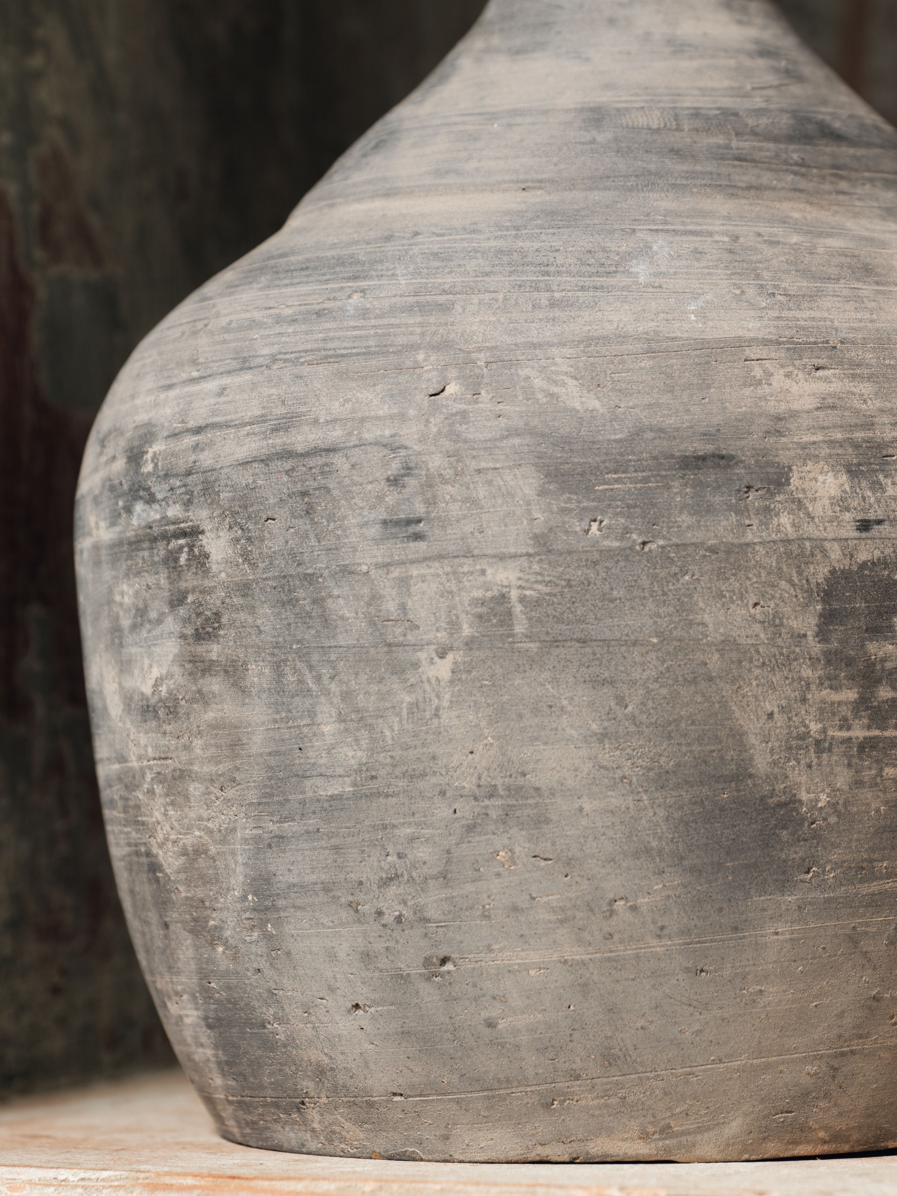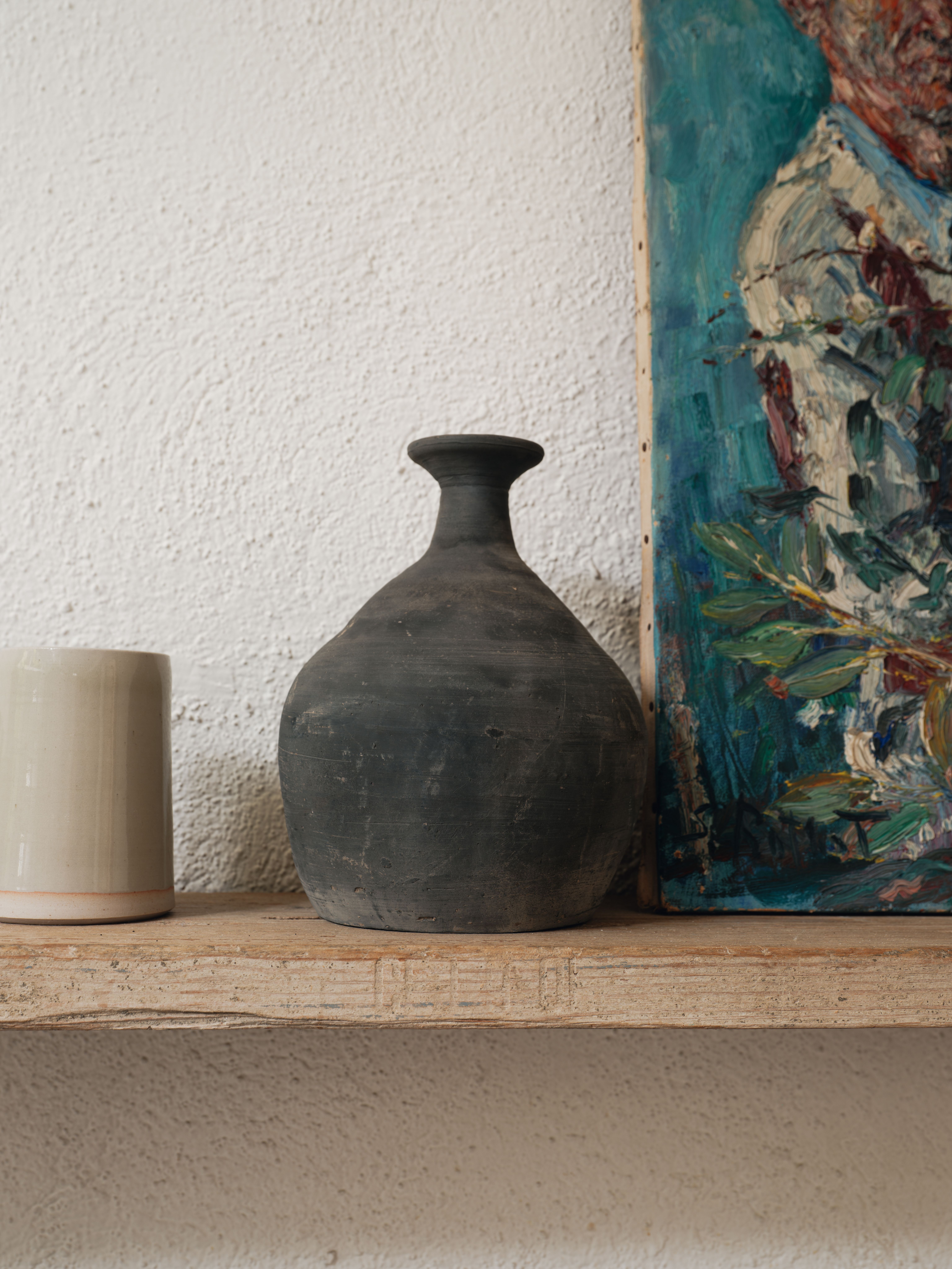 This vintage black pinch-neck water jar from rural China is a stunning example of utilitarian design reimagined as art. Once used to carry and serve water in villages, its gracefully pinched neck and matte black finish speak to both function and beauty. Though no longer water-safe, this piece is perfect for displaying dried florals or as a striking standalone accent.