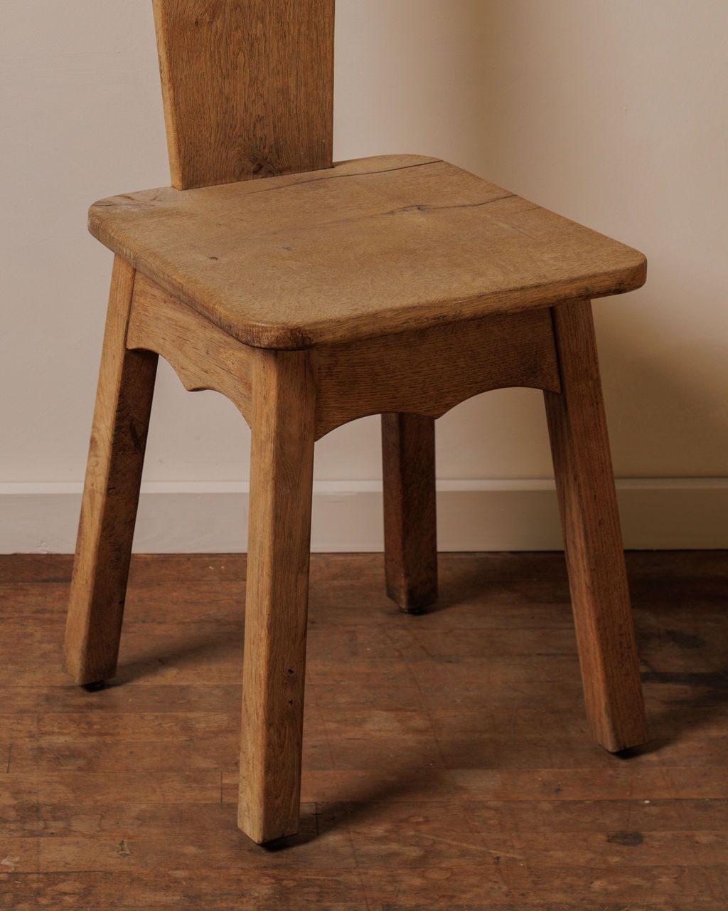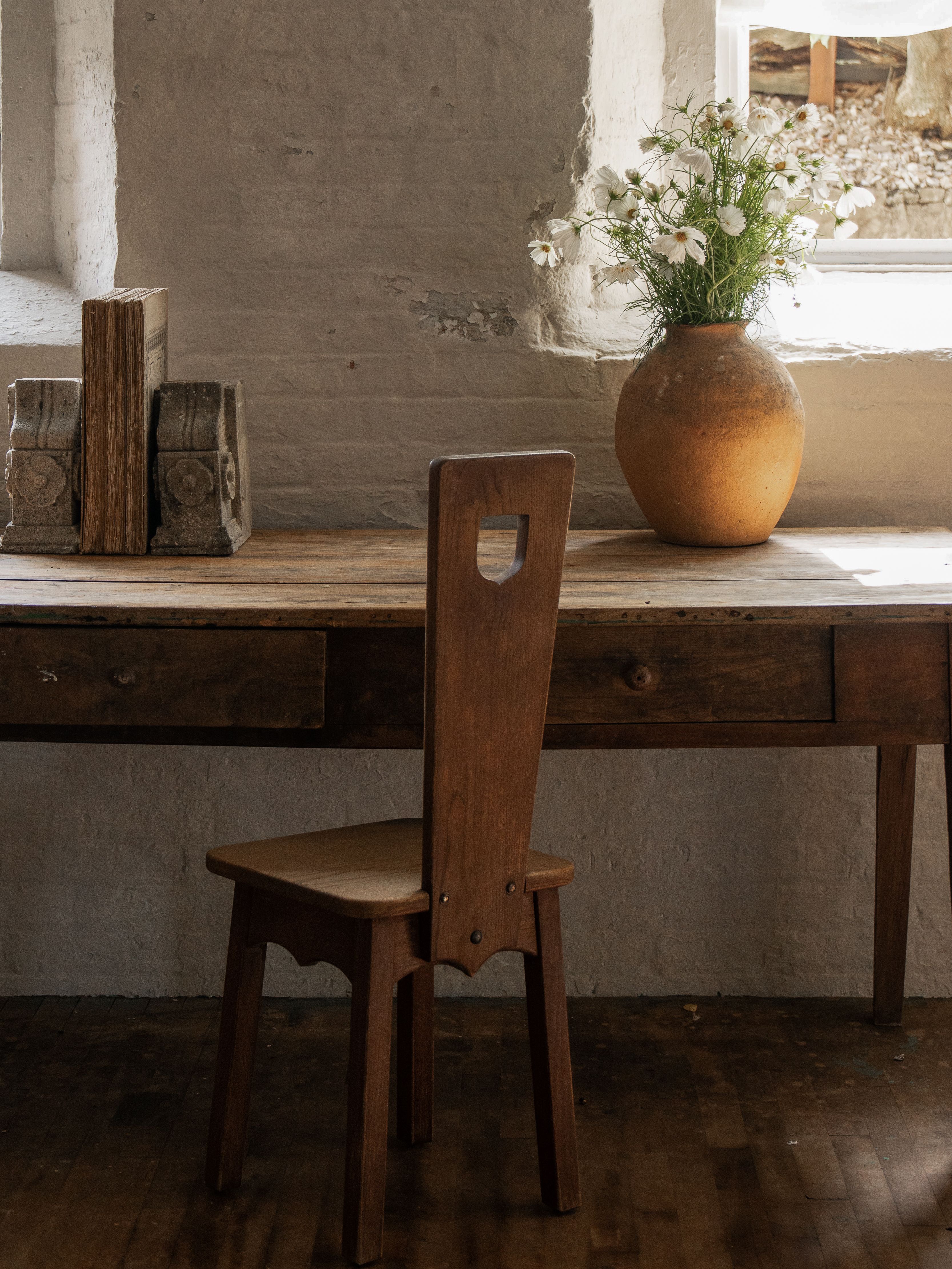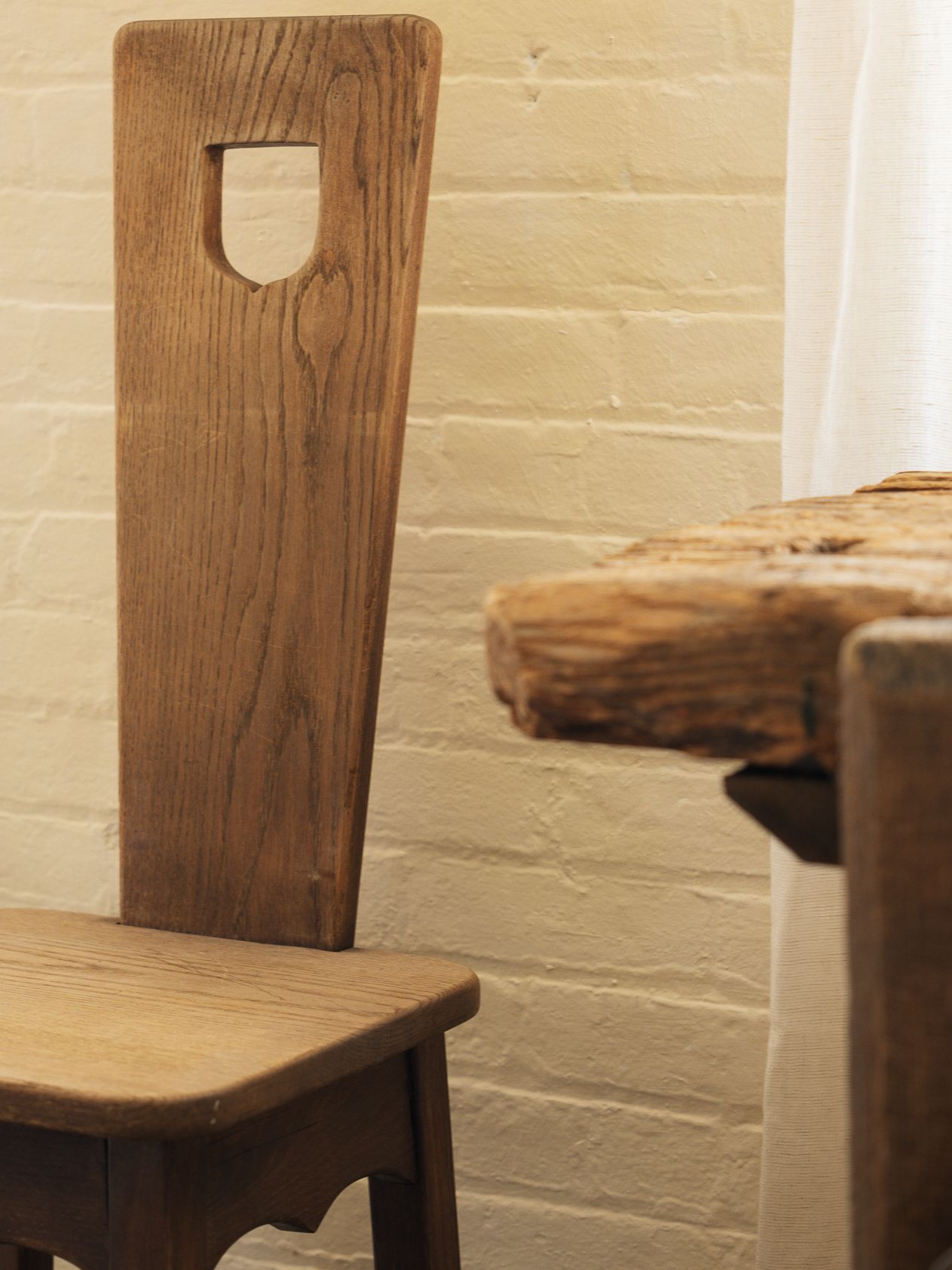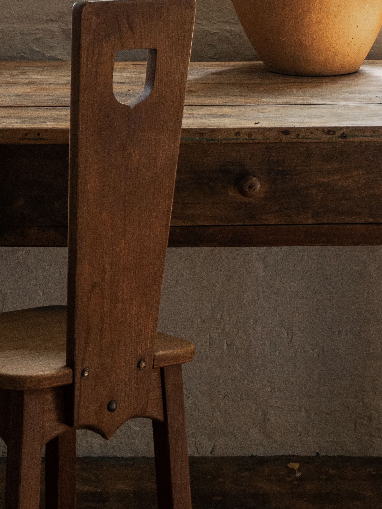 Let's get to the point. These are unbelievably chic and well, a shining example of brutalist design perfection. These 1940's Brutalist dining chairs feature bold lines and a unique cutout design in the backrest, crafted from solid oak with a sturdy, minimalist silhouette. We have two available, so they could be a pair adding a striking, sculptural edge to an intimate dining room moment, or a statement chair in any room.