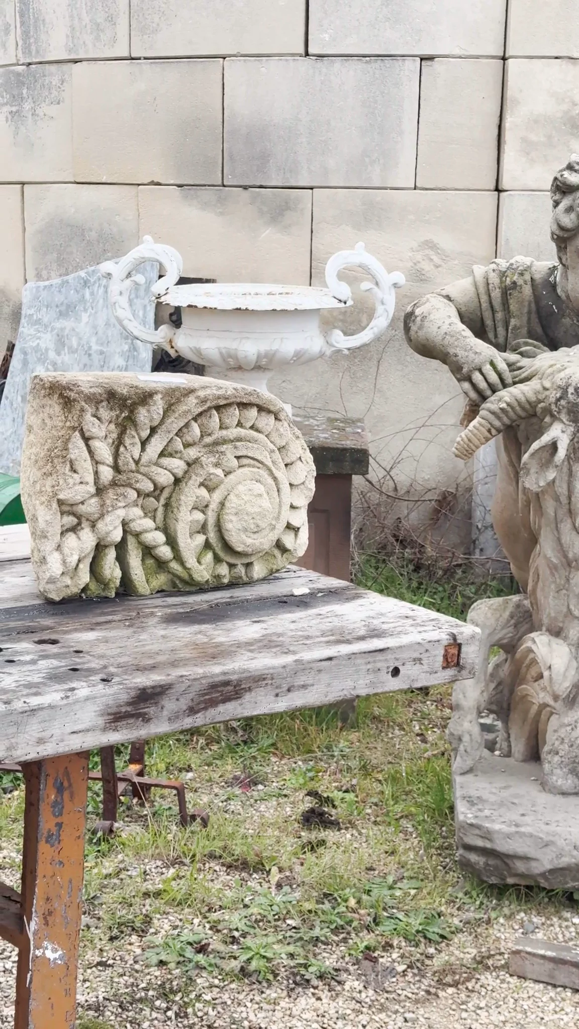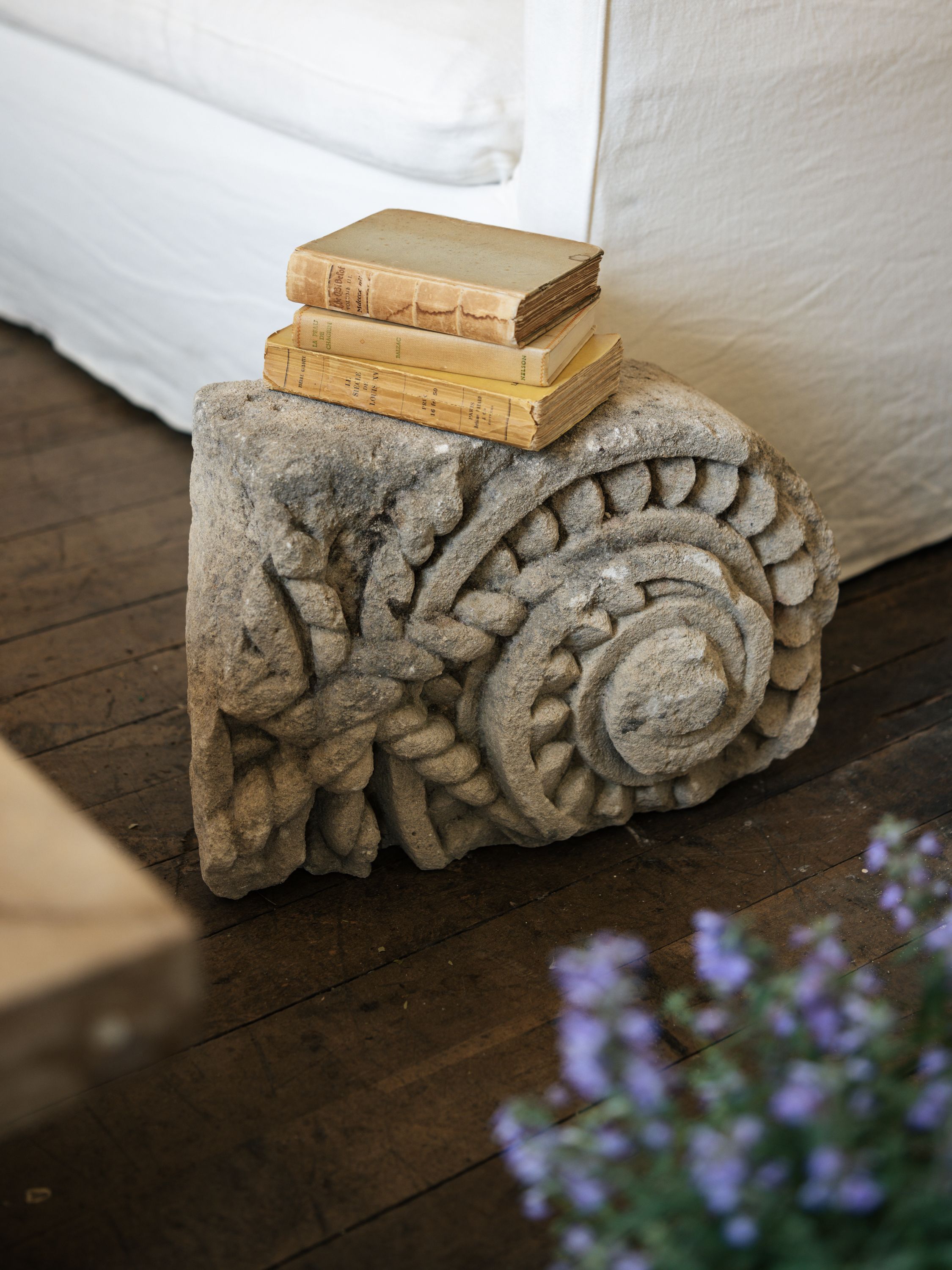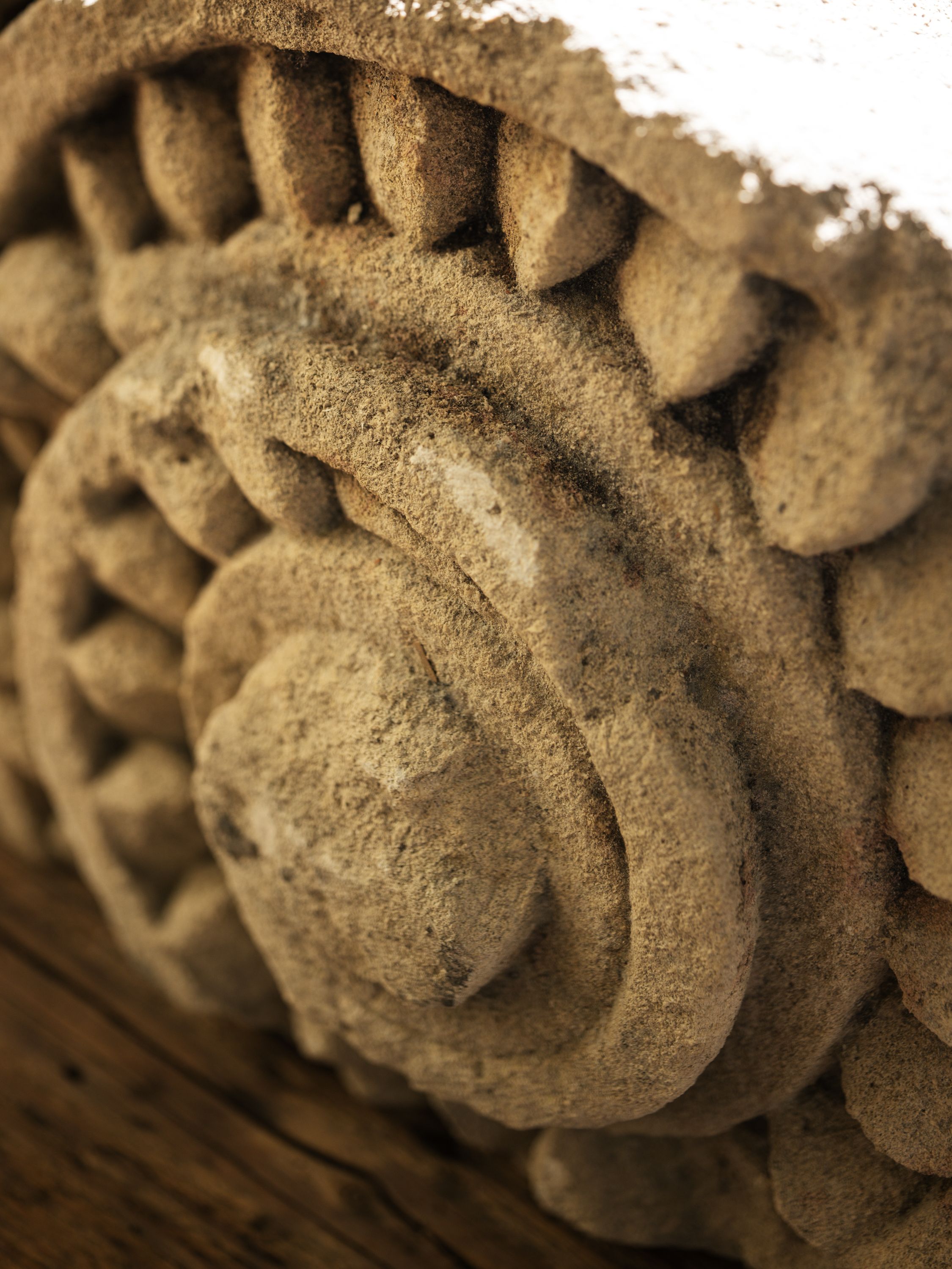 A fragment of what once was Château Valmousse, this rare braided leaf-patterned stone sculpture graced the grand facade of the historic estate before being severed from its foundation by an earthquake. Now bearing a soft patina that only centuries of age can create, it stands as a relic of French neoclassical design. Its substantial weight and bold, intricate carving make it a stunning statement piece to sit on a console, entryway or side table.