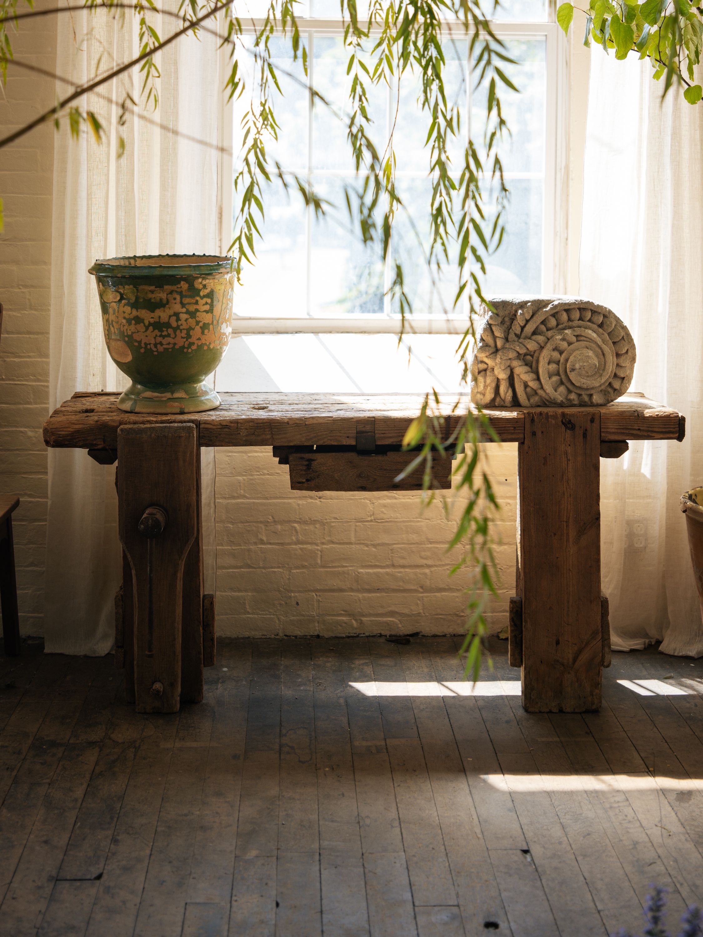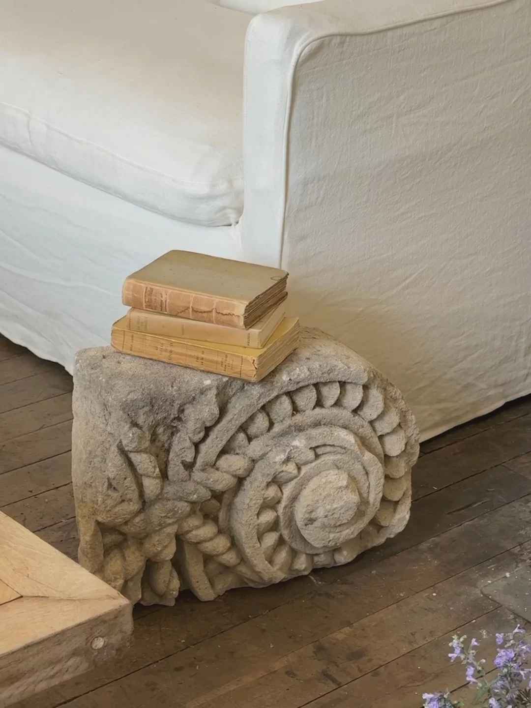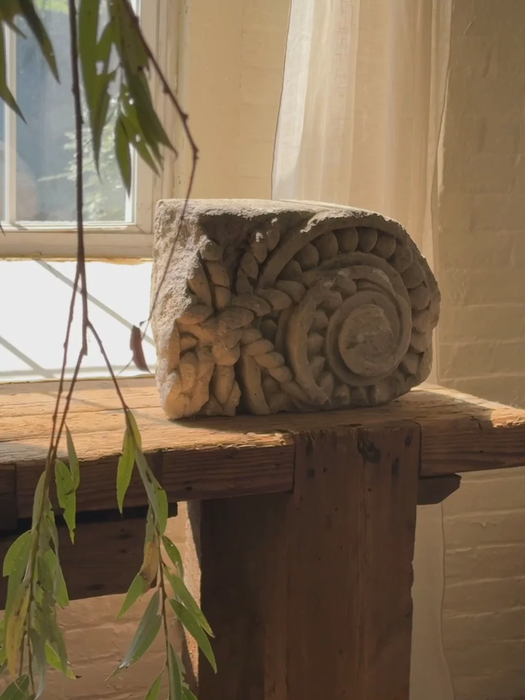 A fragment of what once was Château Valmousse, this rare braided leaf-patterned stone sculpture graced the grand facade of the historic estate before being severed from its foundation by an earthquake. Now bearing a soft patina that only centuries of age can create, it stands as a relic of French neoclassical design. Its substantial weight and bold, intricate carving make it a stunning statement piece to sit on a console, entryway or side table.