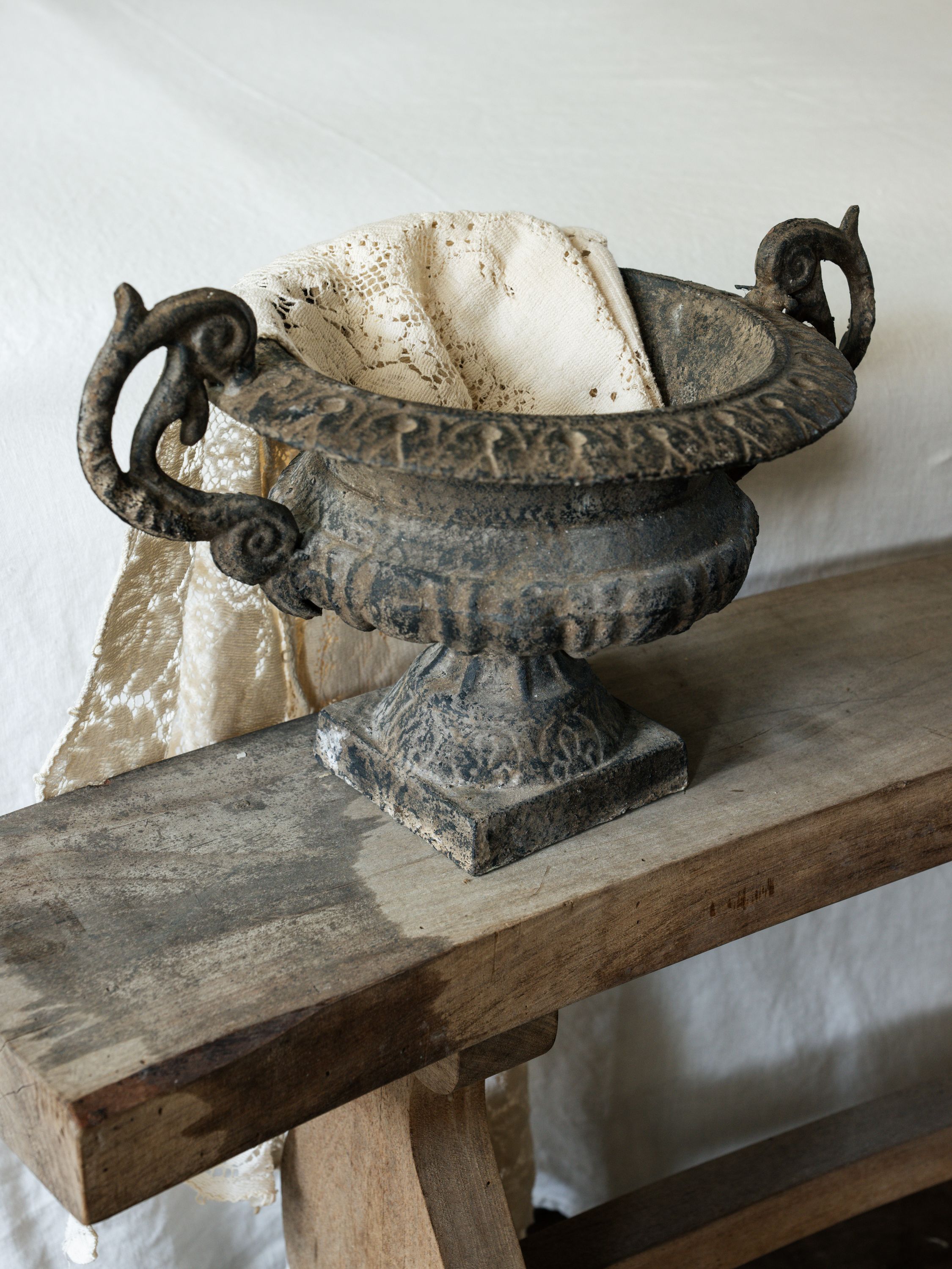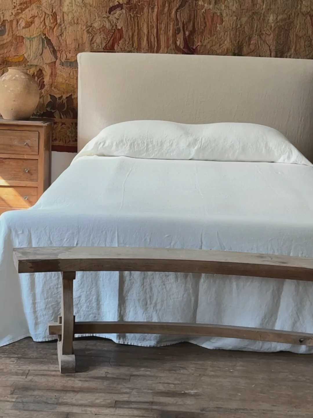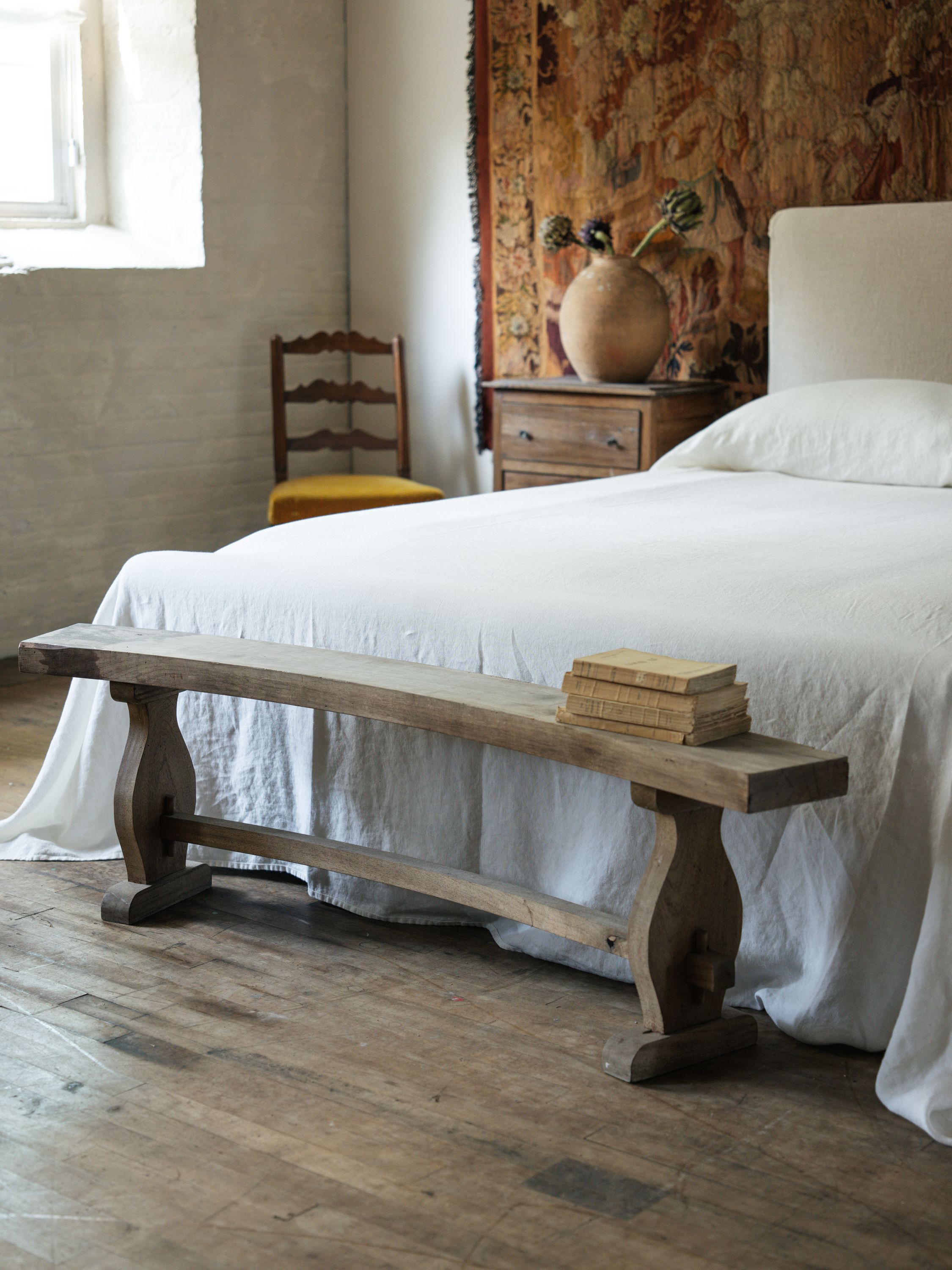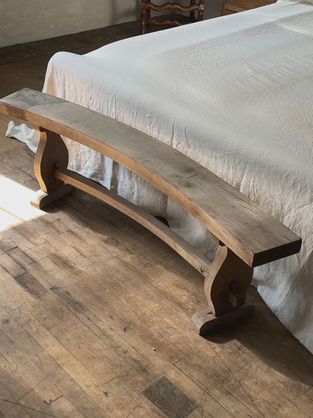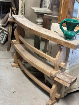 She's got curves in all the right places. This early 20th-century curved wood bench boasts raw wood showing wear and minor staining that add to its well-loved character. Place it at the foot of your bed or in an entryway to invite a bit of French slow living into your home.