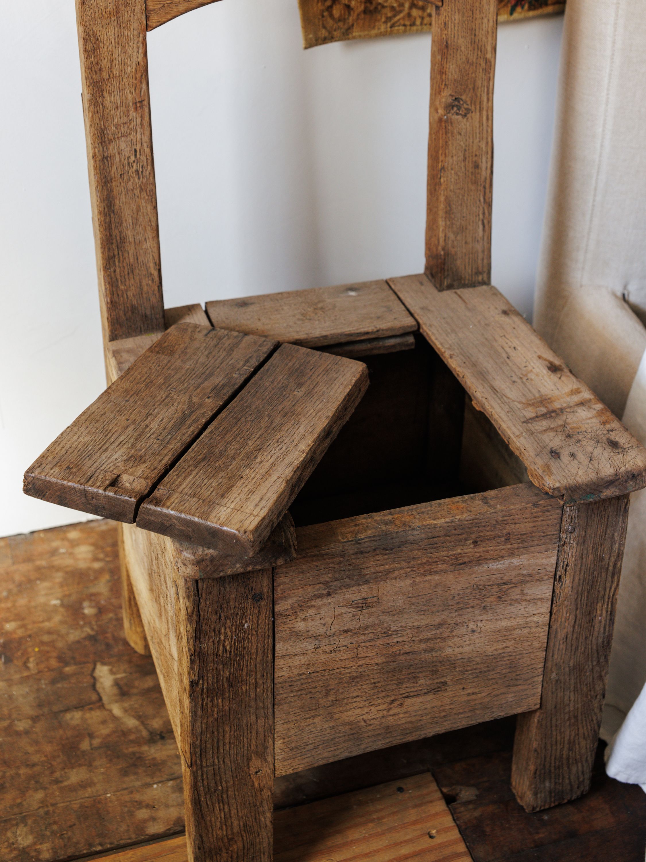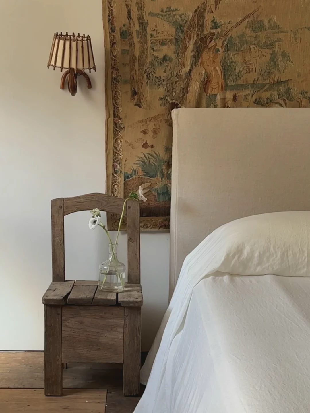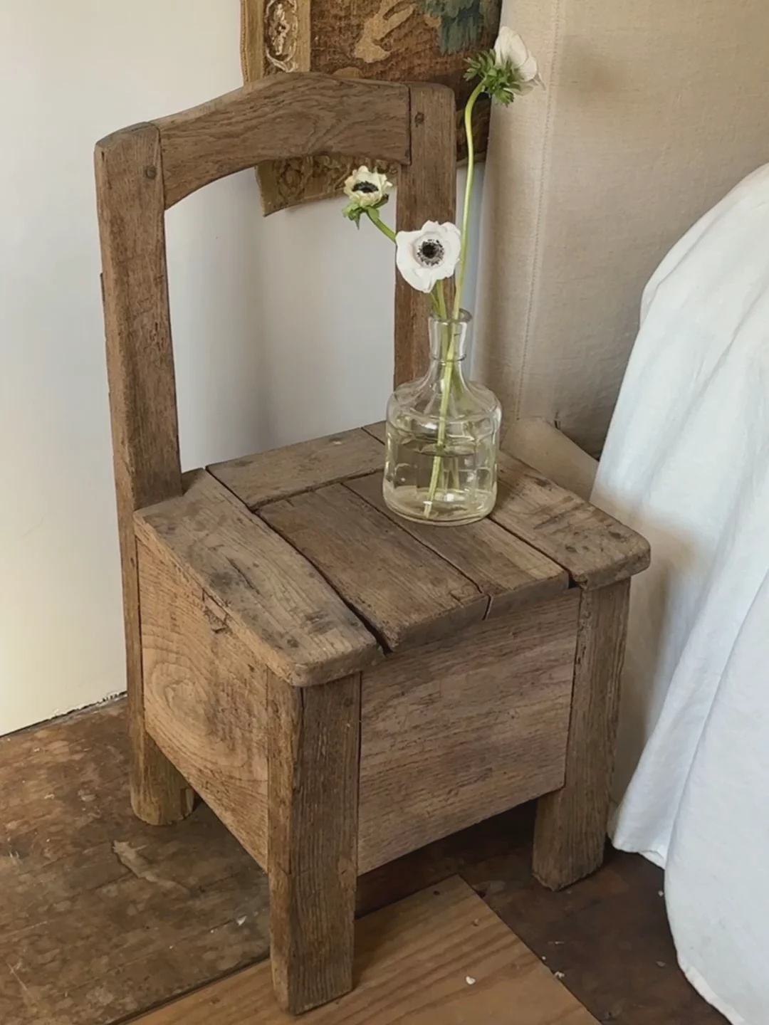 The story behind the salt box chair is a charming one. In 18th-century France, salt was taxed so heavily under the “gabelle” that it became nearly as precious as gold. This led to a clever household trick: a humble-looking chair with a hidden compartment by the fireplace. Each time the tax collector stopped by, the family’s grandmother would settle herself comfortably on the chair, concealing their extra salt. Asking her to move would be unthinkably rude, so the hidden stash remained safe and sound. Now, Sylvie has given this ingenious piece a new purpose, styling it as a unique side table or entryway moment.