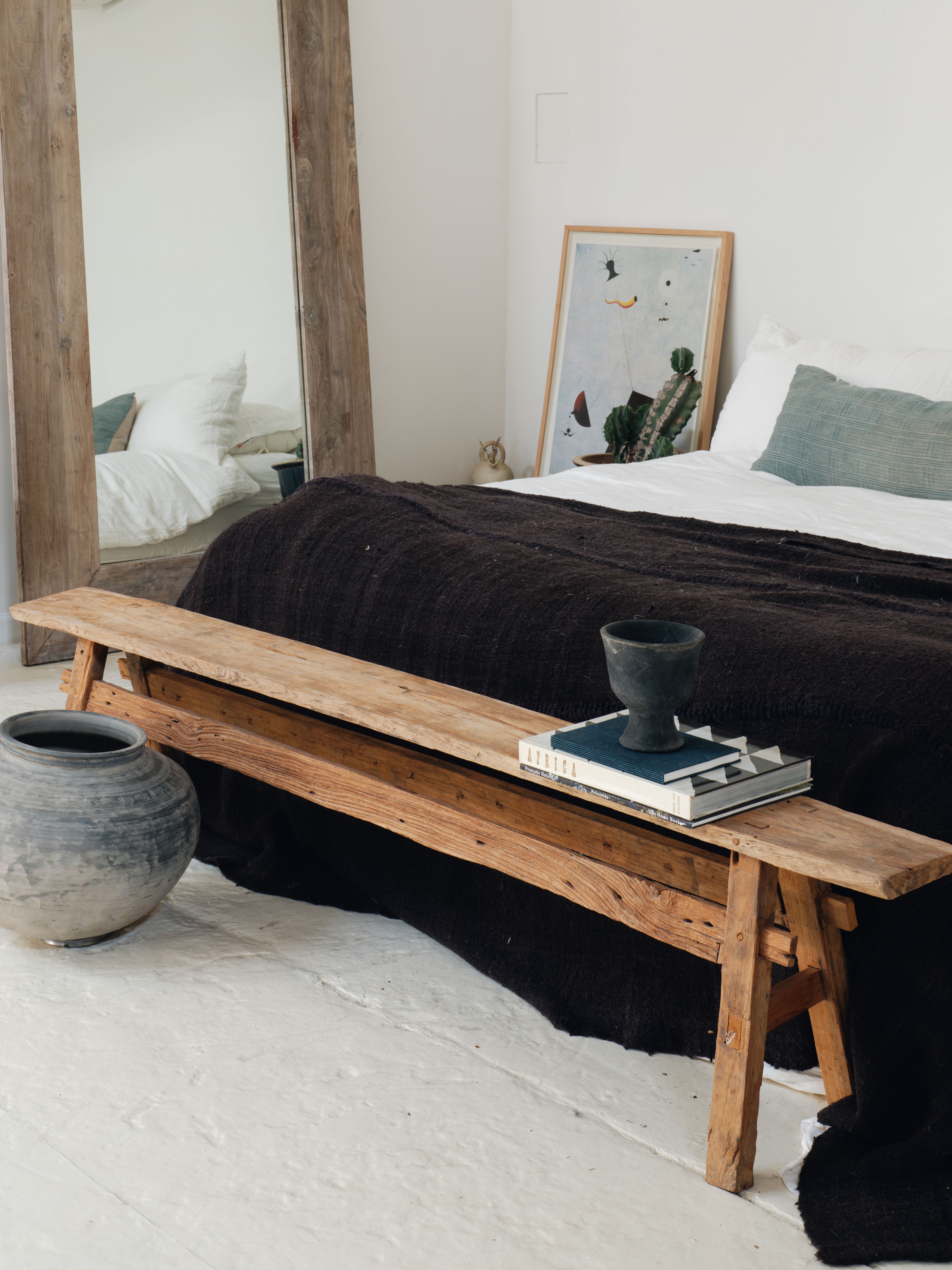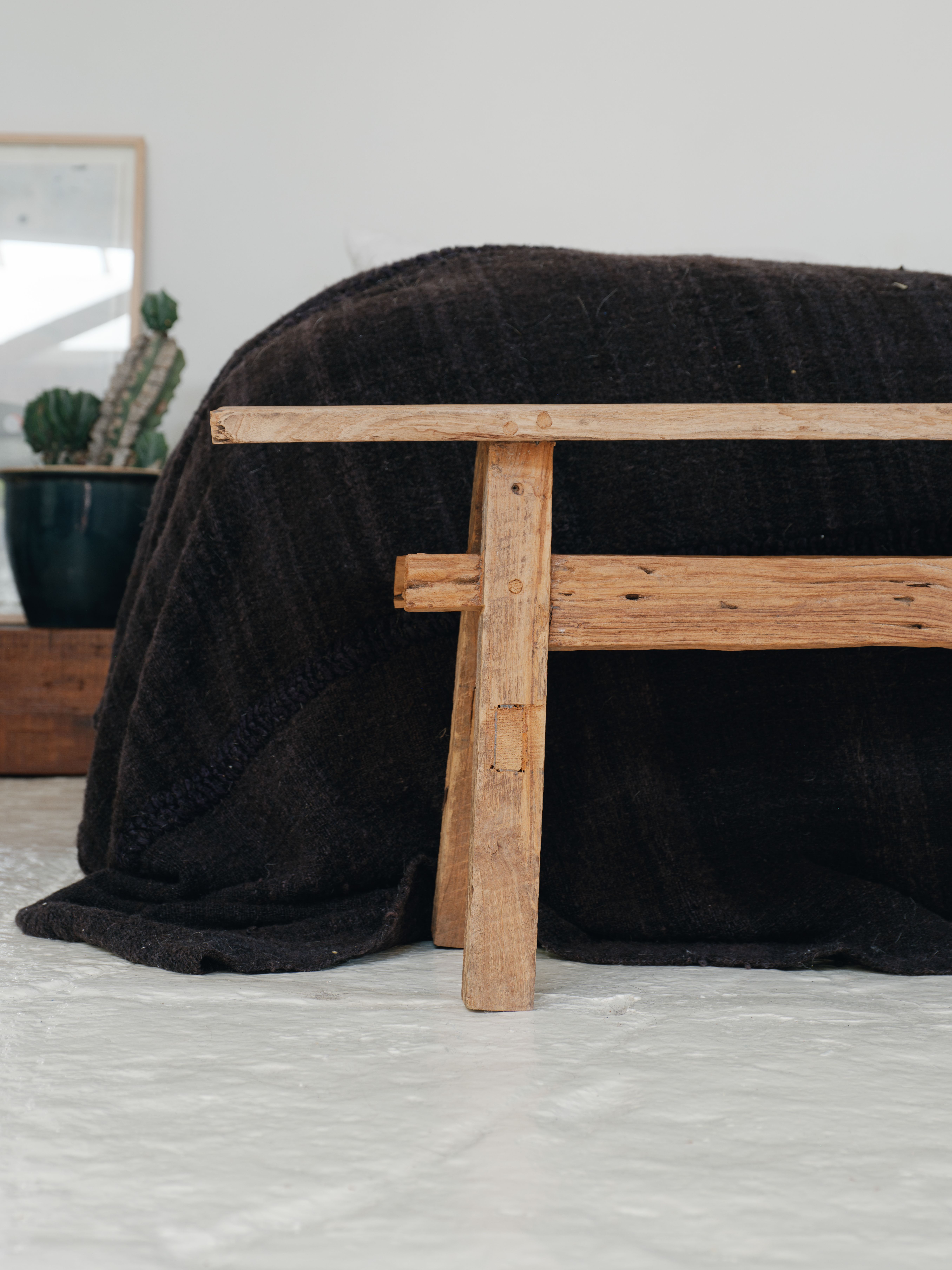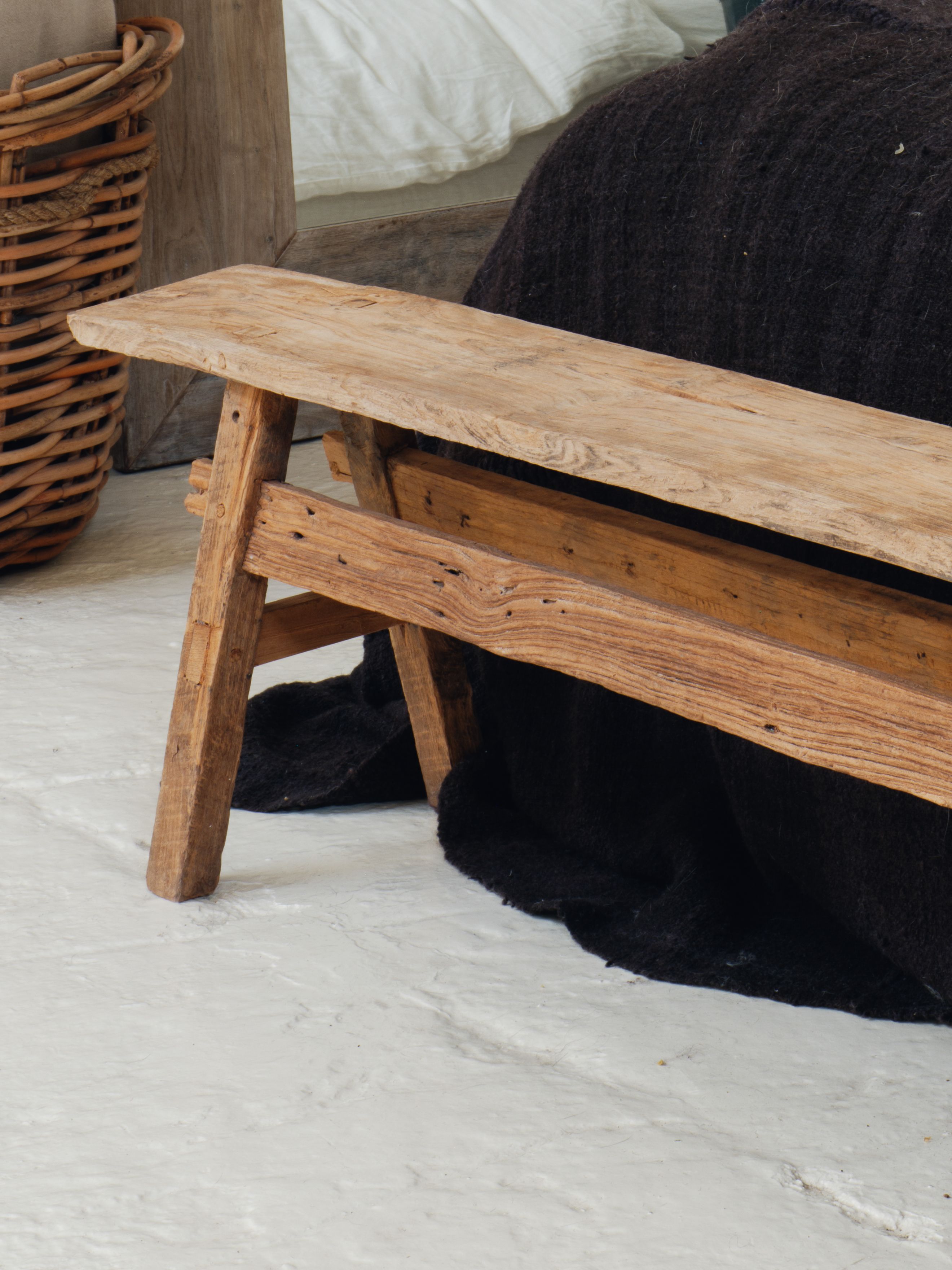 This antique Elwood bench, discovered in rural Indonesia, is a striking piece of history. Handcrafted from solid elmwood, it features a beautifully weathered surface that reflects years of use and care. Perfect as seating in a hallway, at the foot of a bed, or as a unique dining table seat, this bench brings warmth and authenticity to any space.