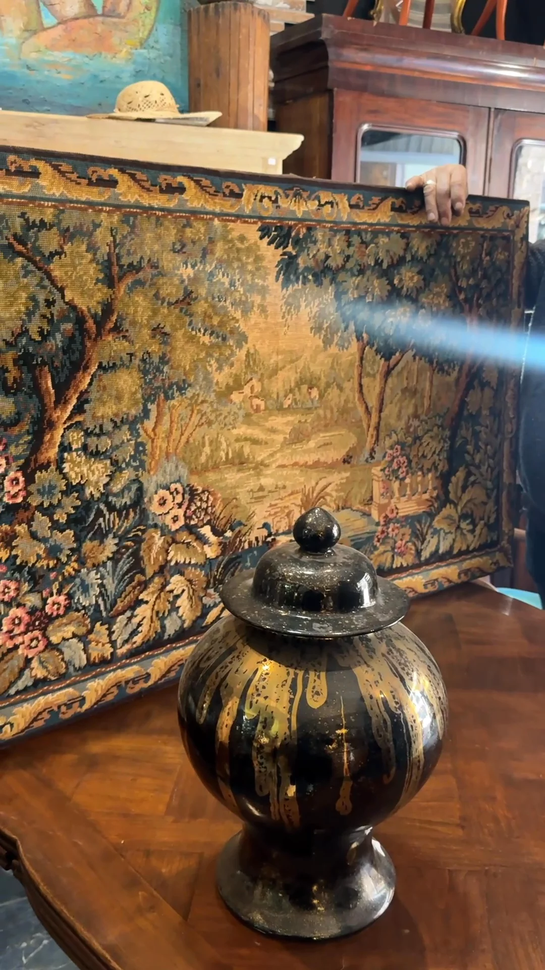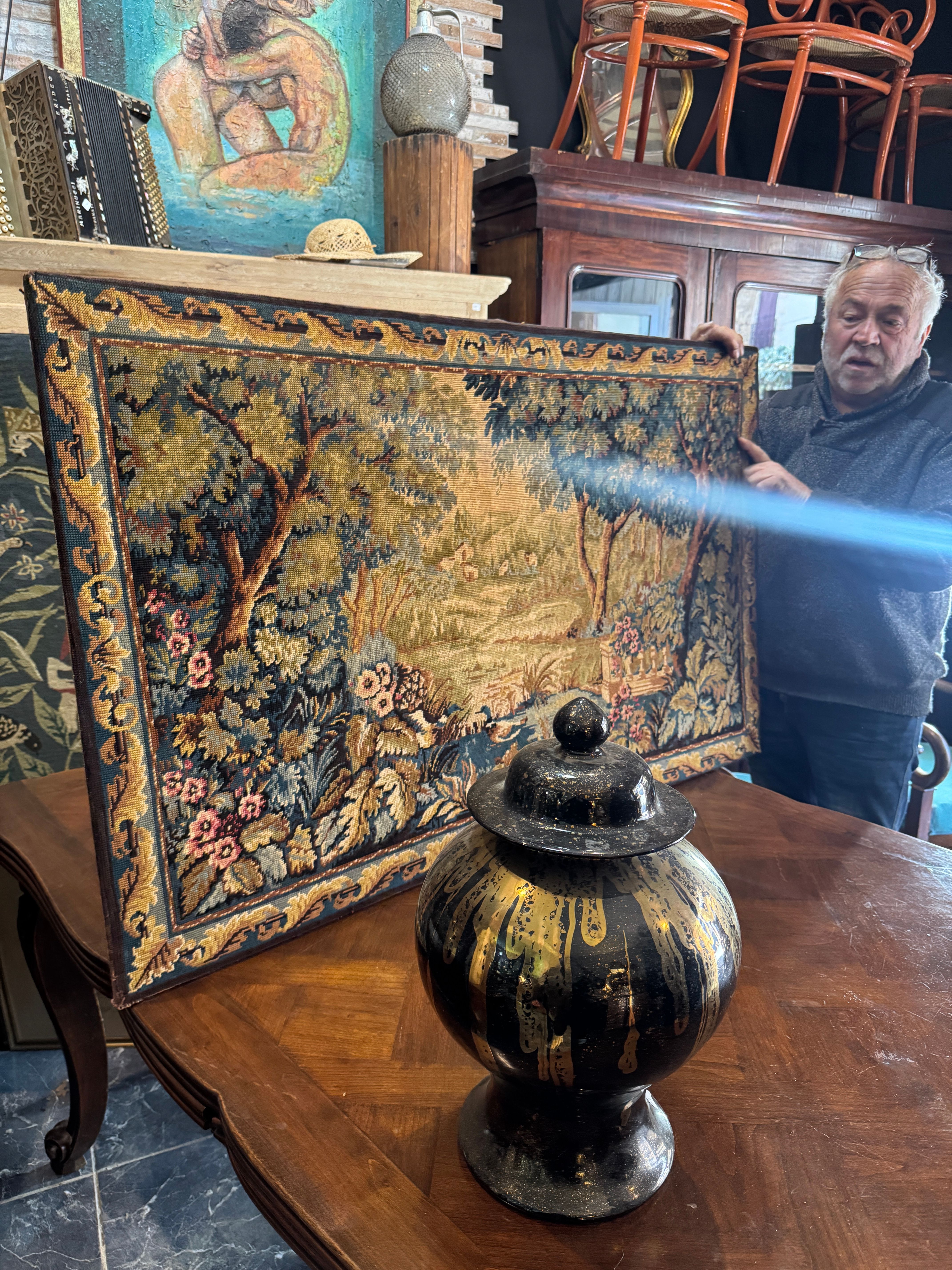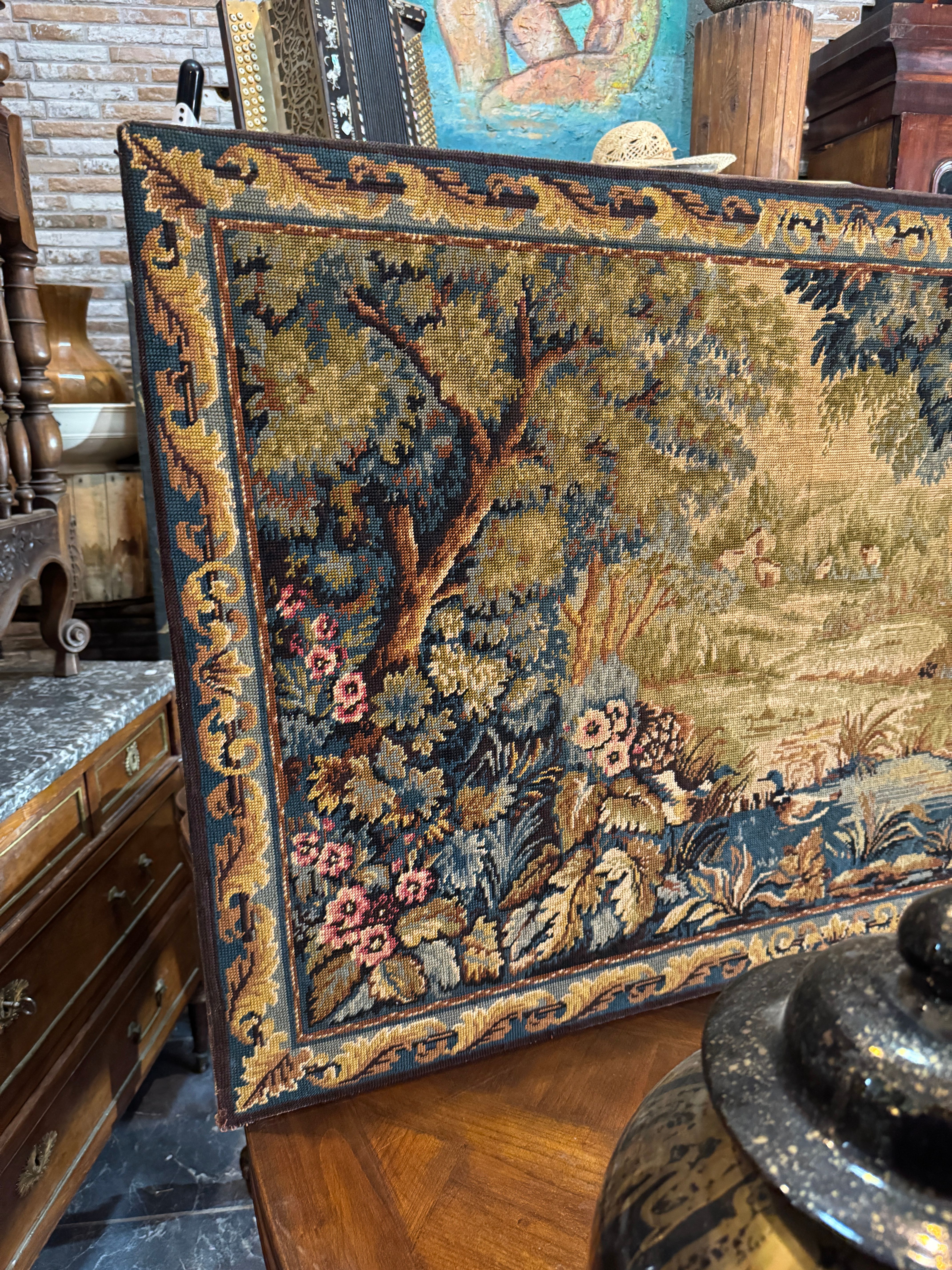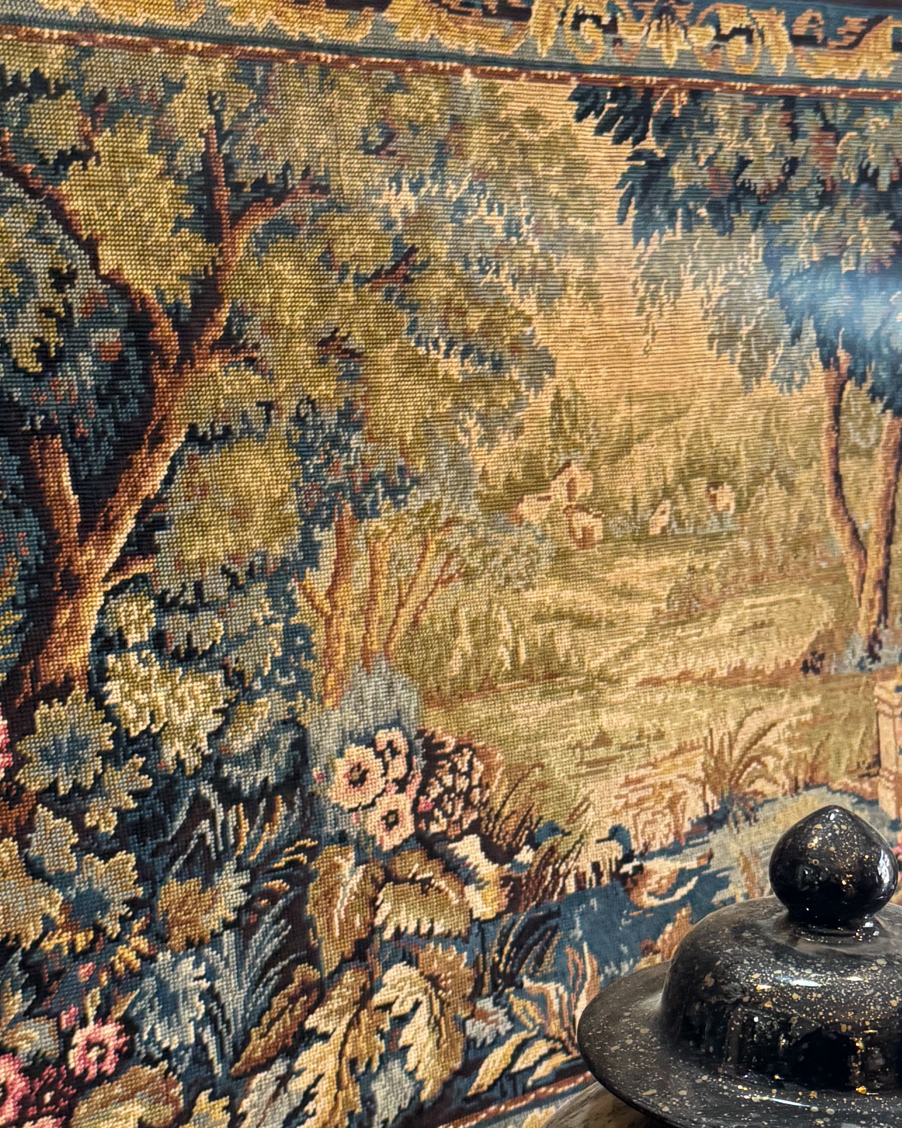 Framed in wood, the tapestry is a rare survivor from the 1800s, when French ateliers sought to immortalize royal fantasies in thread. The colors have mellowed beautifully over time, with the soft blues and garden greens settling into an aged palette.