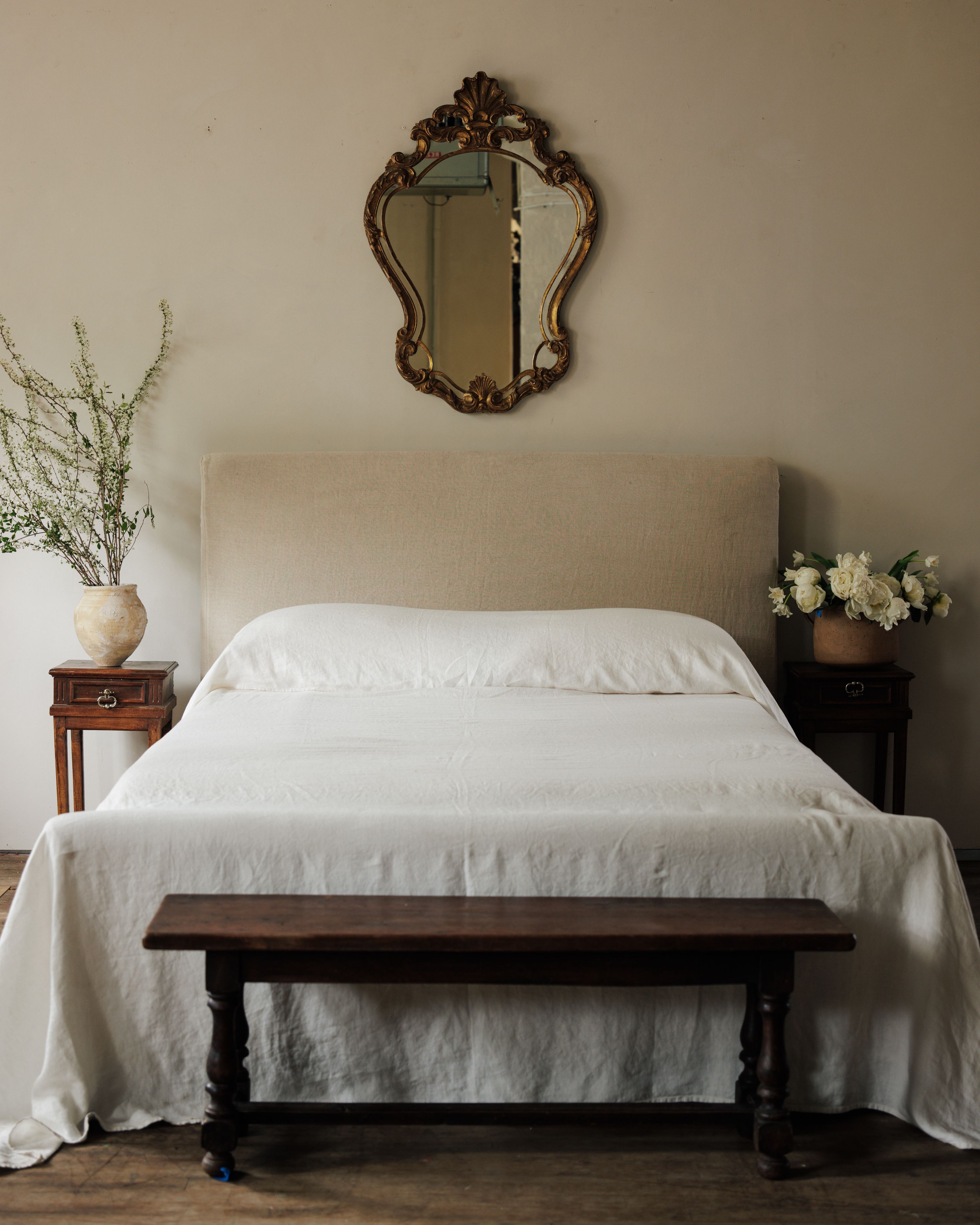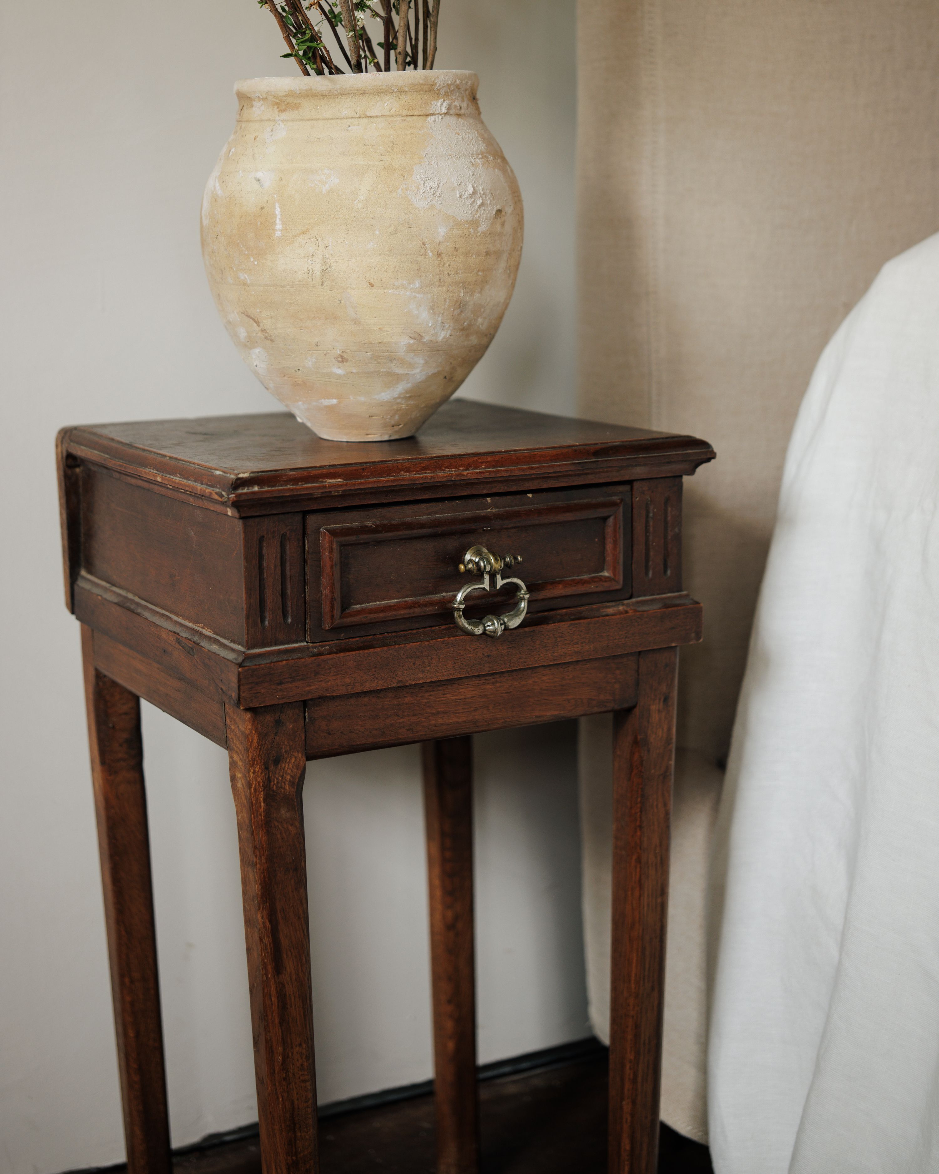 This pair of narrow antique oak nightstands features delicate slightly titled legs and a petite drawer with original brass pulls. Their tall, slim profile is ideal beside a bed or flanking a sofa - Sylvie nearly keeled over when she realized they were a matching pair. If you're after twin side tables, this is your chance. Sold as a pair.