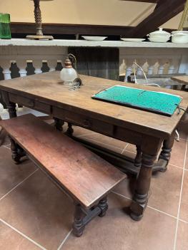 This 19th-century French walnut table, found in the Pézenas, was likely built for a notaire or small household office, crafted from solid walnut with traditional pegged joinery, turned legs, and a pair of drawers for stashing letters, ledgers, or ink pens. Tables like this once anchored studies and salons across France, used for correspondence, bookkeeping, or intimate meals. Today, it makes a handsome writing desk or a small dining table for four, with drawers still ready to hold notebooks, matchbooks, or your best jelly or fountain pen.