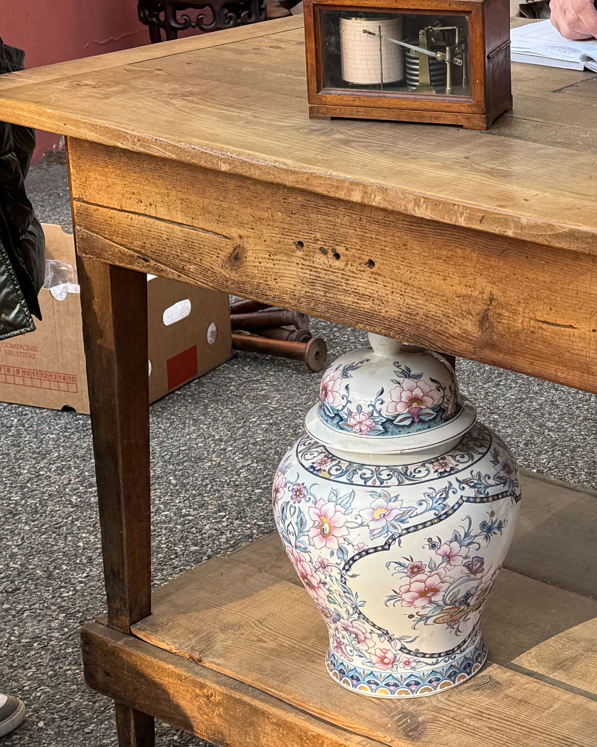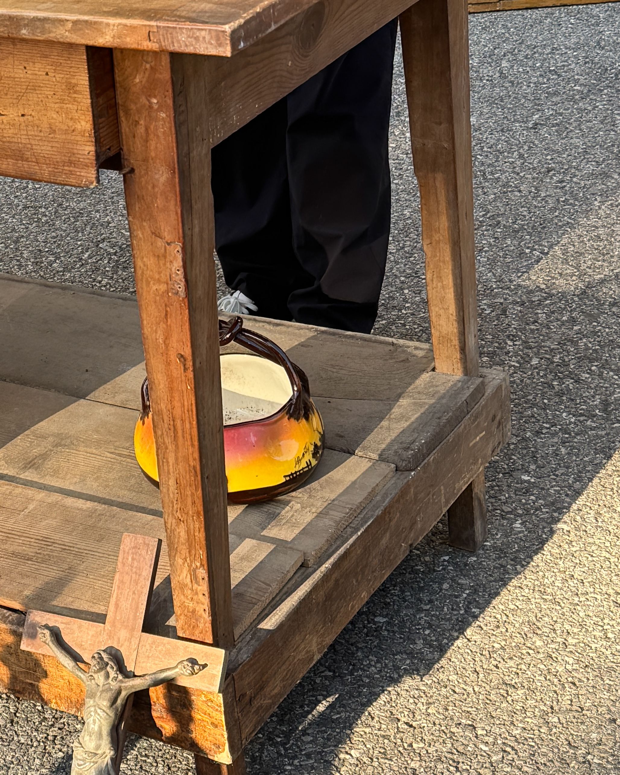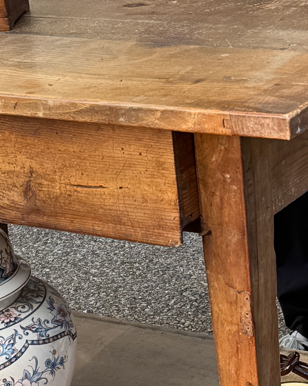 This antique piece wears its history beautifully—past woodworm holes, repairs, cracks, patina, and stains all add to its character.