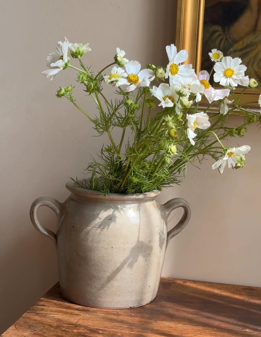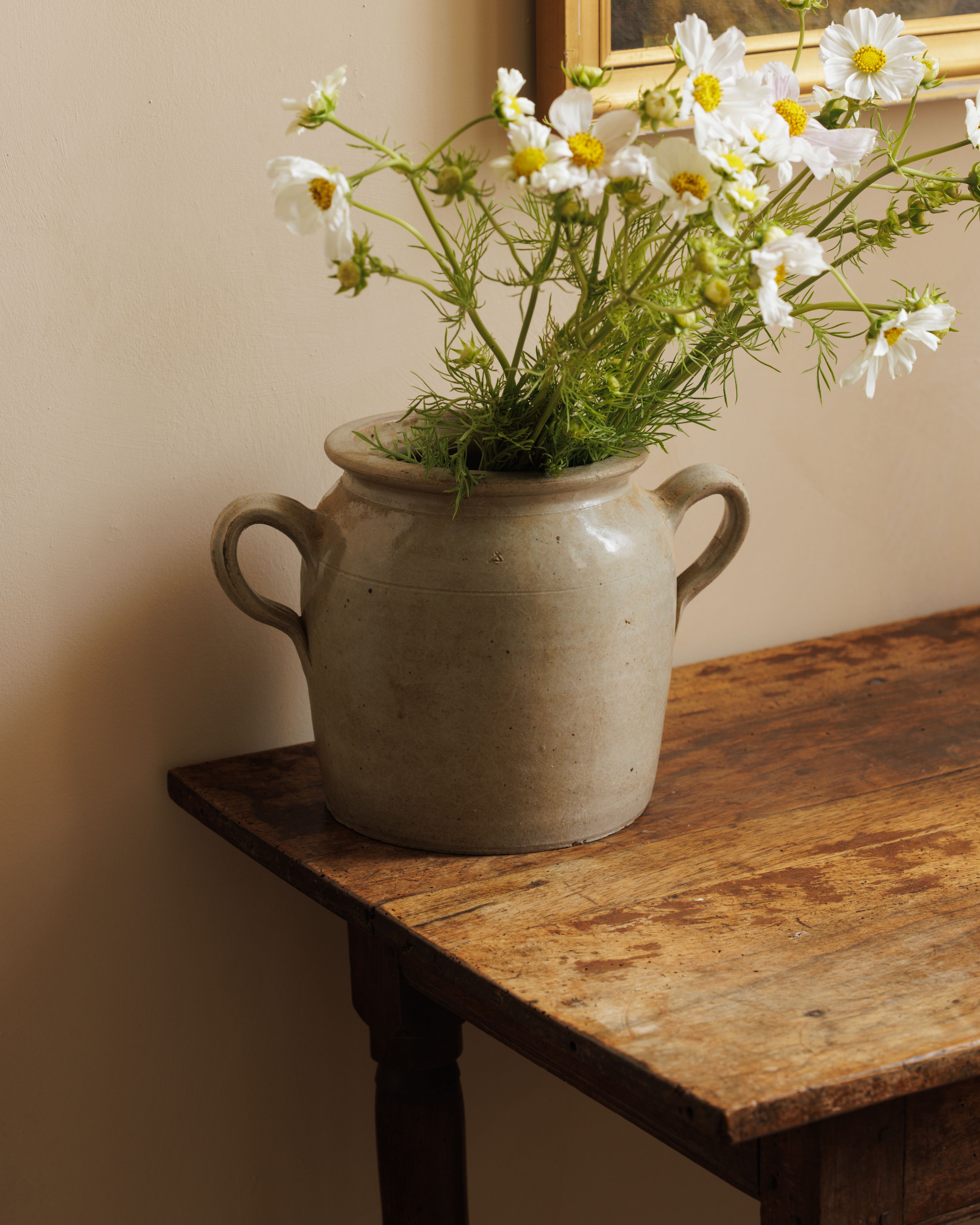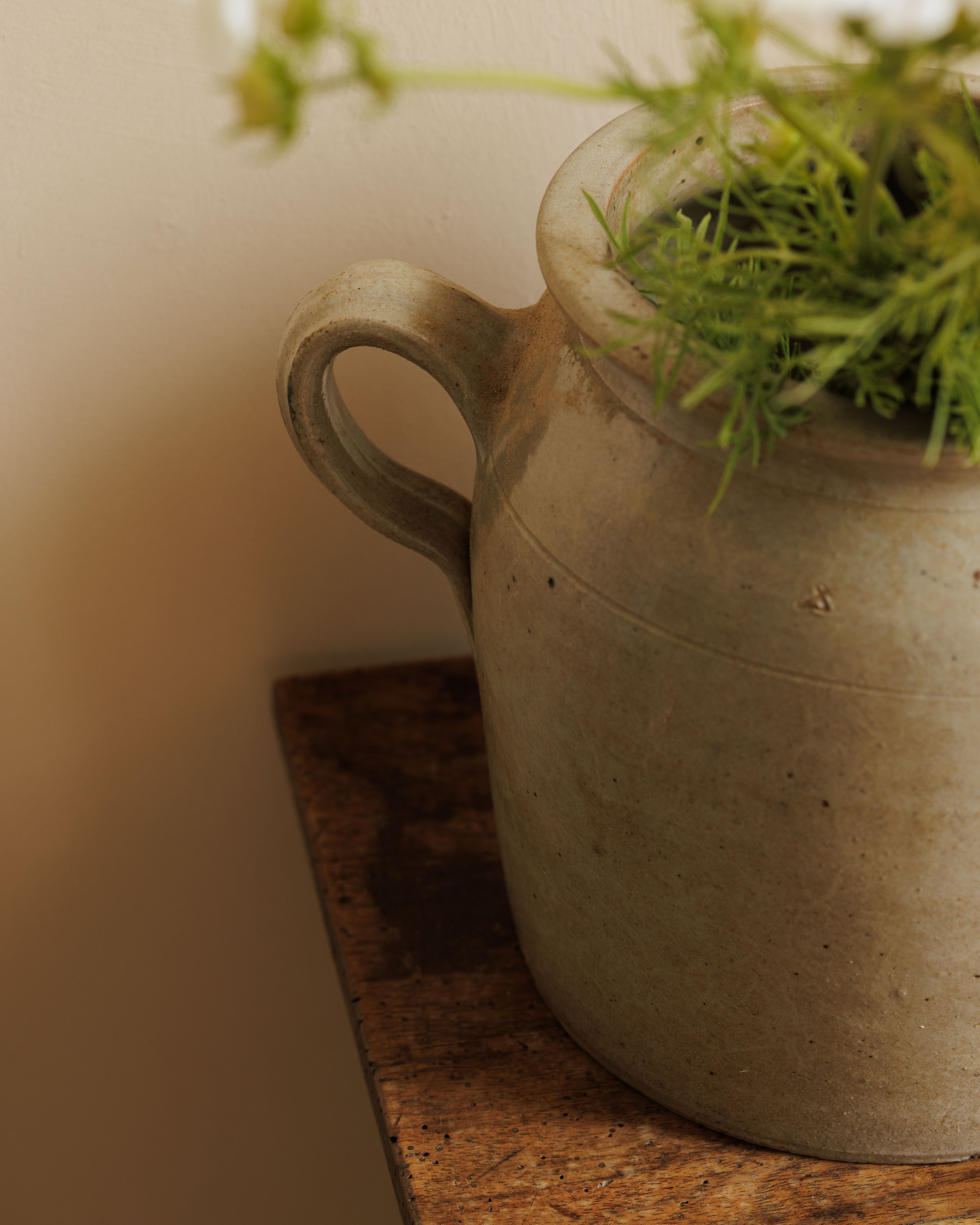 These early 20th century French confit pots, made from sandstone ceramic with a creamy glaze, are a special find from farmhouses in Provence. Perfect for displaying your prized cooking utensils, fresh herbs or as a vase for foraged flowers.