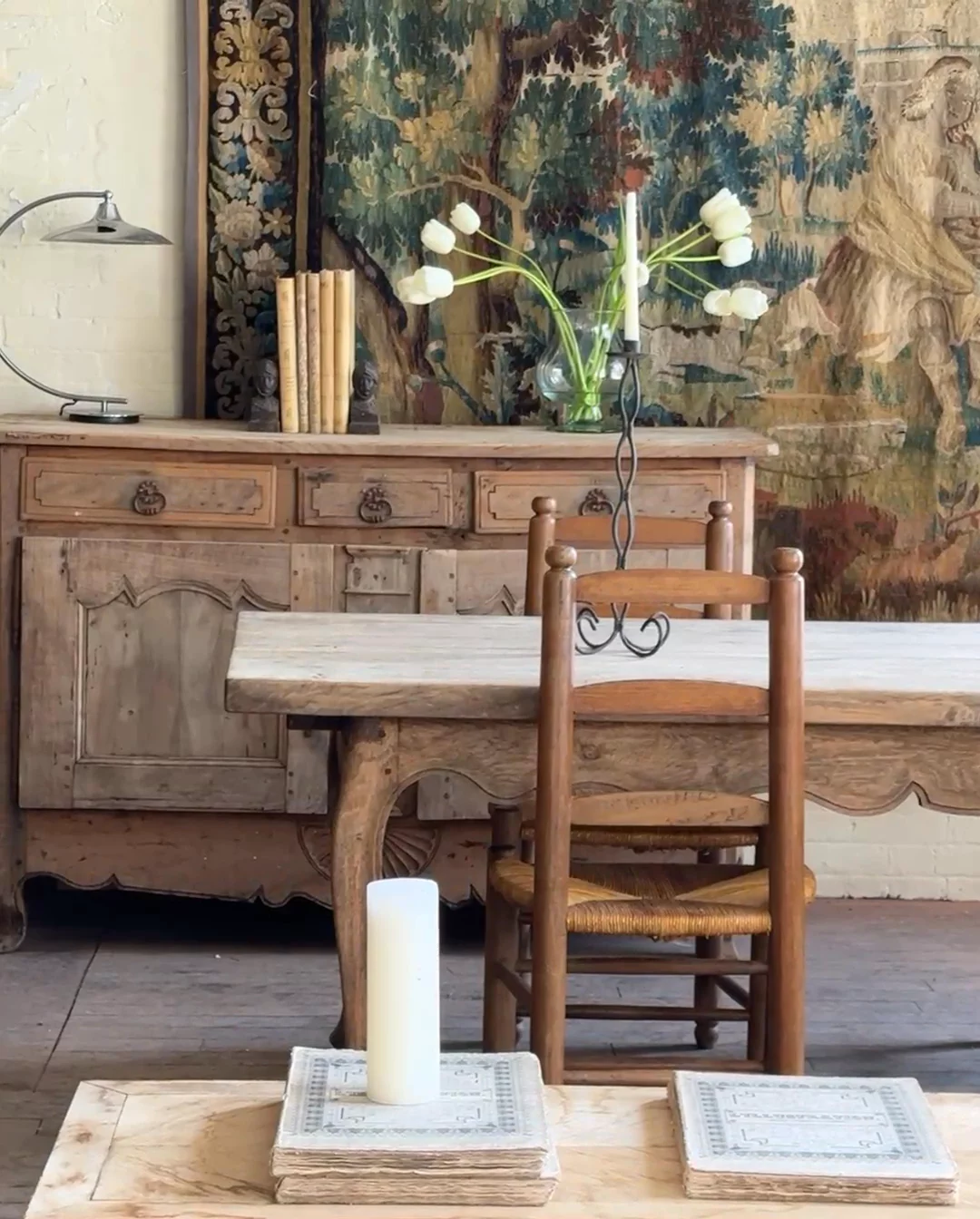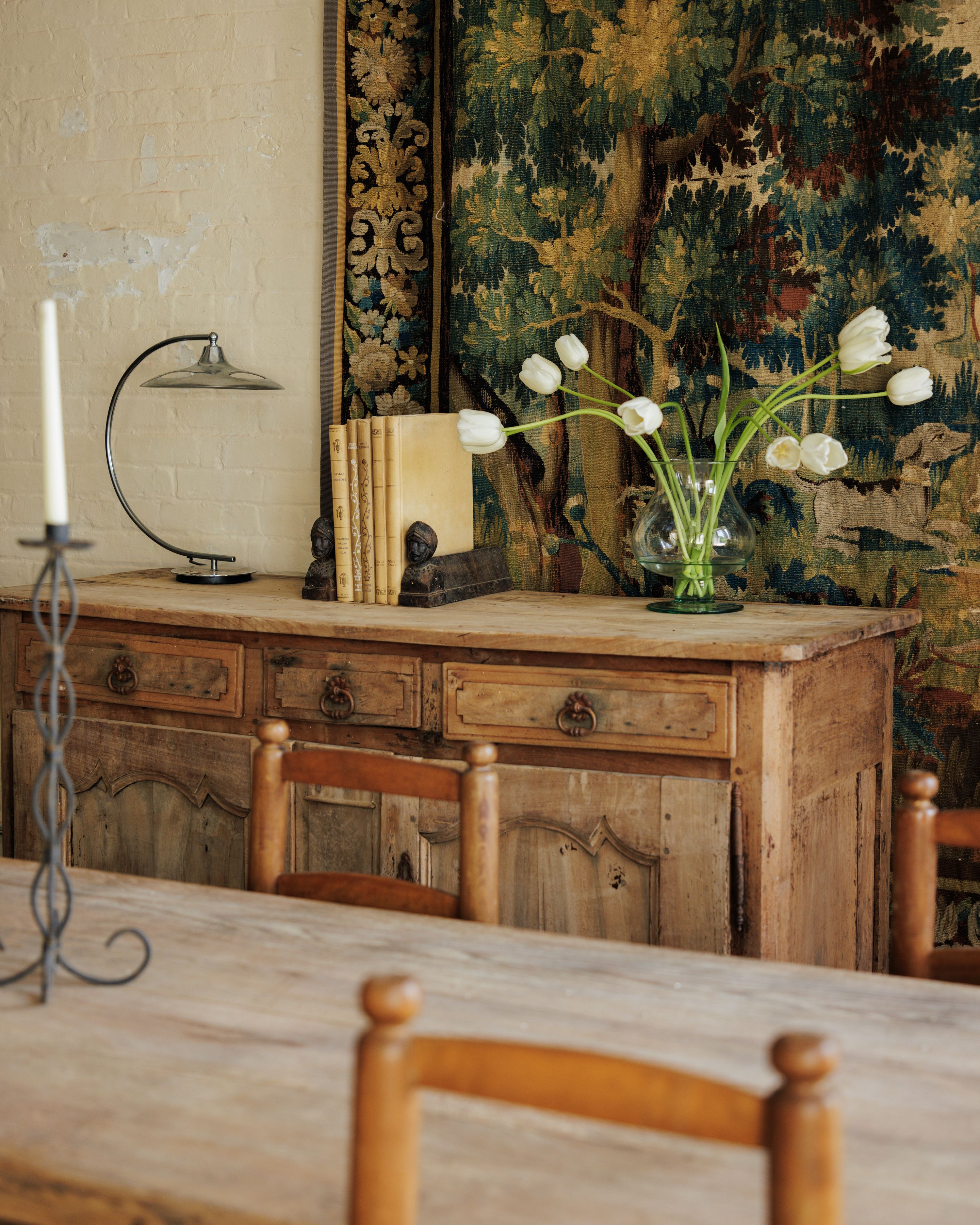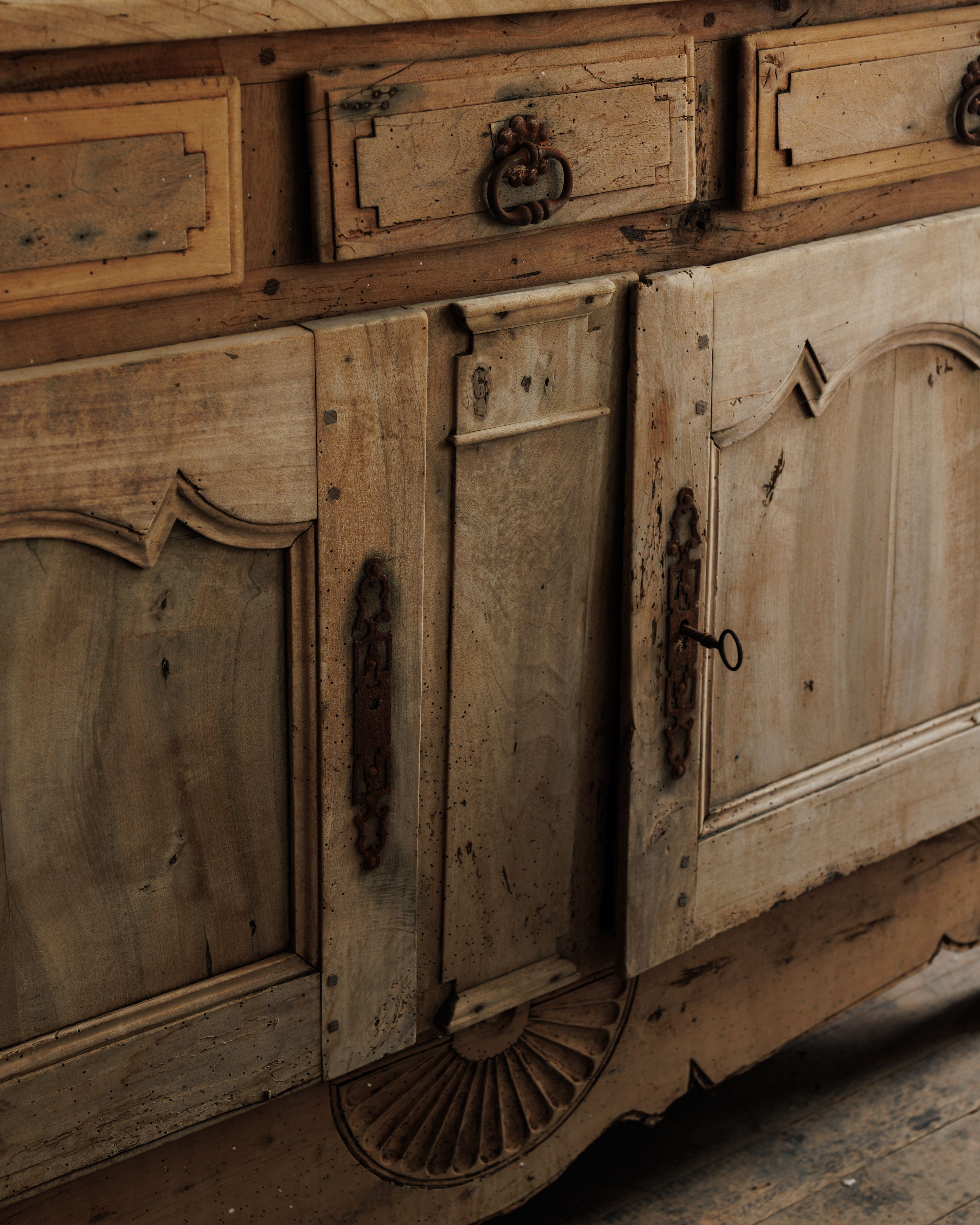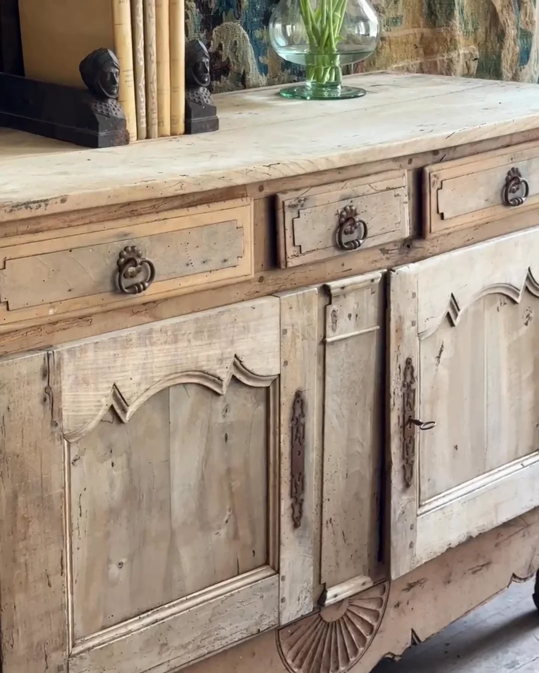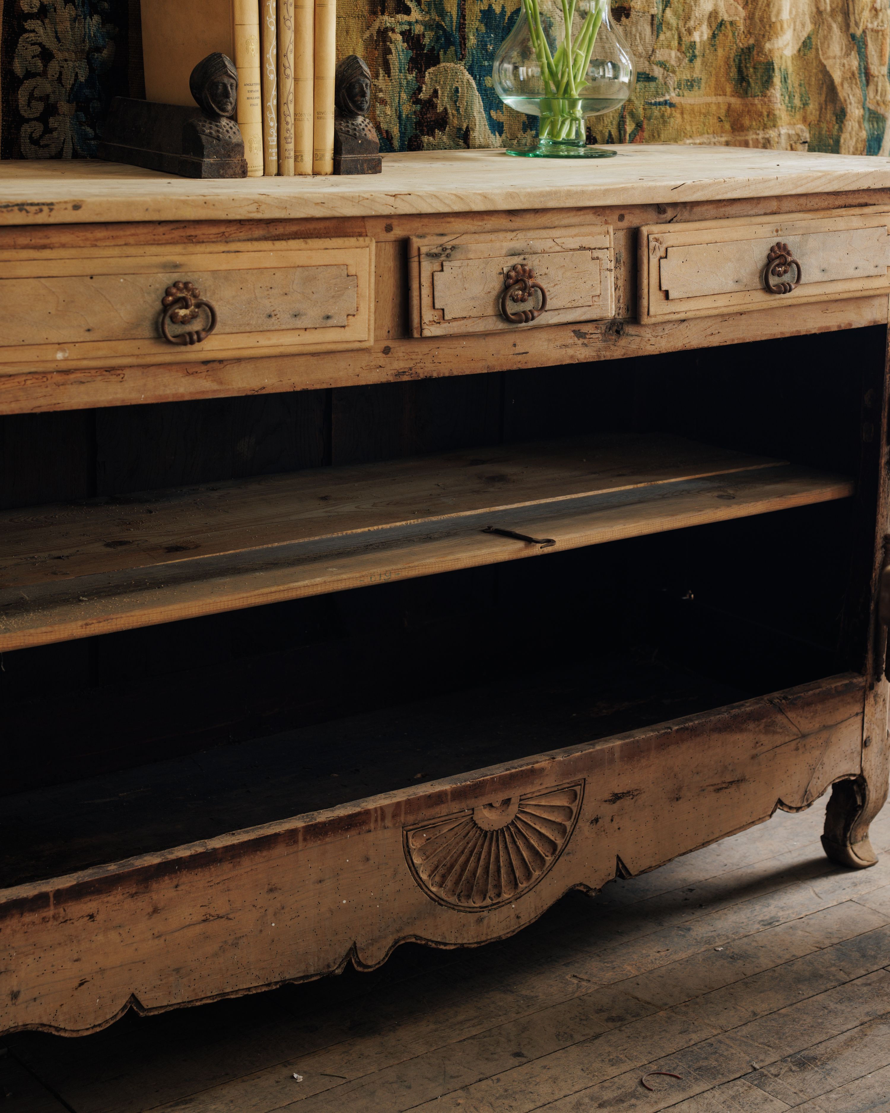 Straight from a château in Savoie that’s been in the same family since 1720, this 19th-century French oak buffet carries centuries of quiet presence. With its original key, sculpted apron, and sunburst detail, it’s ready to anchor a dining room or hallway - Sylvie stashes linens in the drawers and considers it one of her finest finds.
