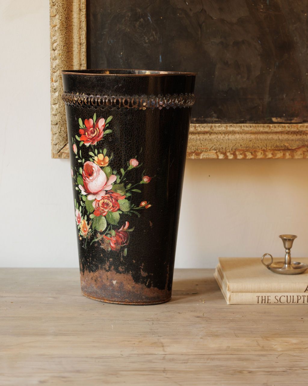 An umbrella stand with more history than most homes. From a château in Savoie where it remained in the same family for six generations, this hand-painted metal stand dates to the Napoleon period. The black enamel surface is adorned with floral brushwork in rich reds and greens, now softened by a century of use and a touch of rust at the base. Once a fixture in a grand entryway, it’s still as elegant and useful as ever. Sylvie likes it just inside the door, holding canes and umbrellas- or simply standing alone as a decorative waste basket, a little reminder of the beauty that lingers in old French halls.