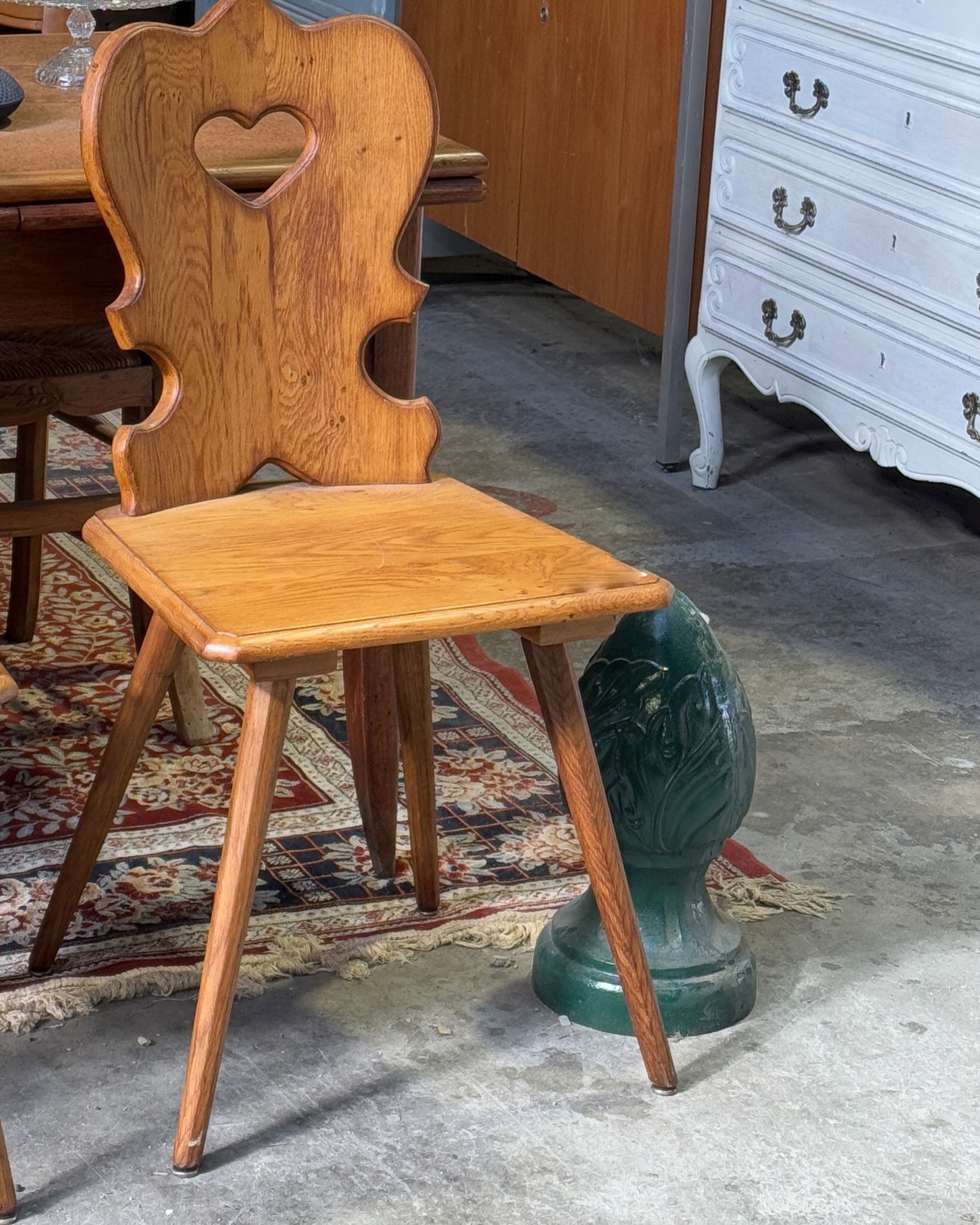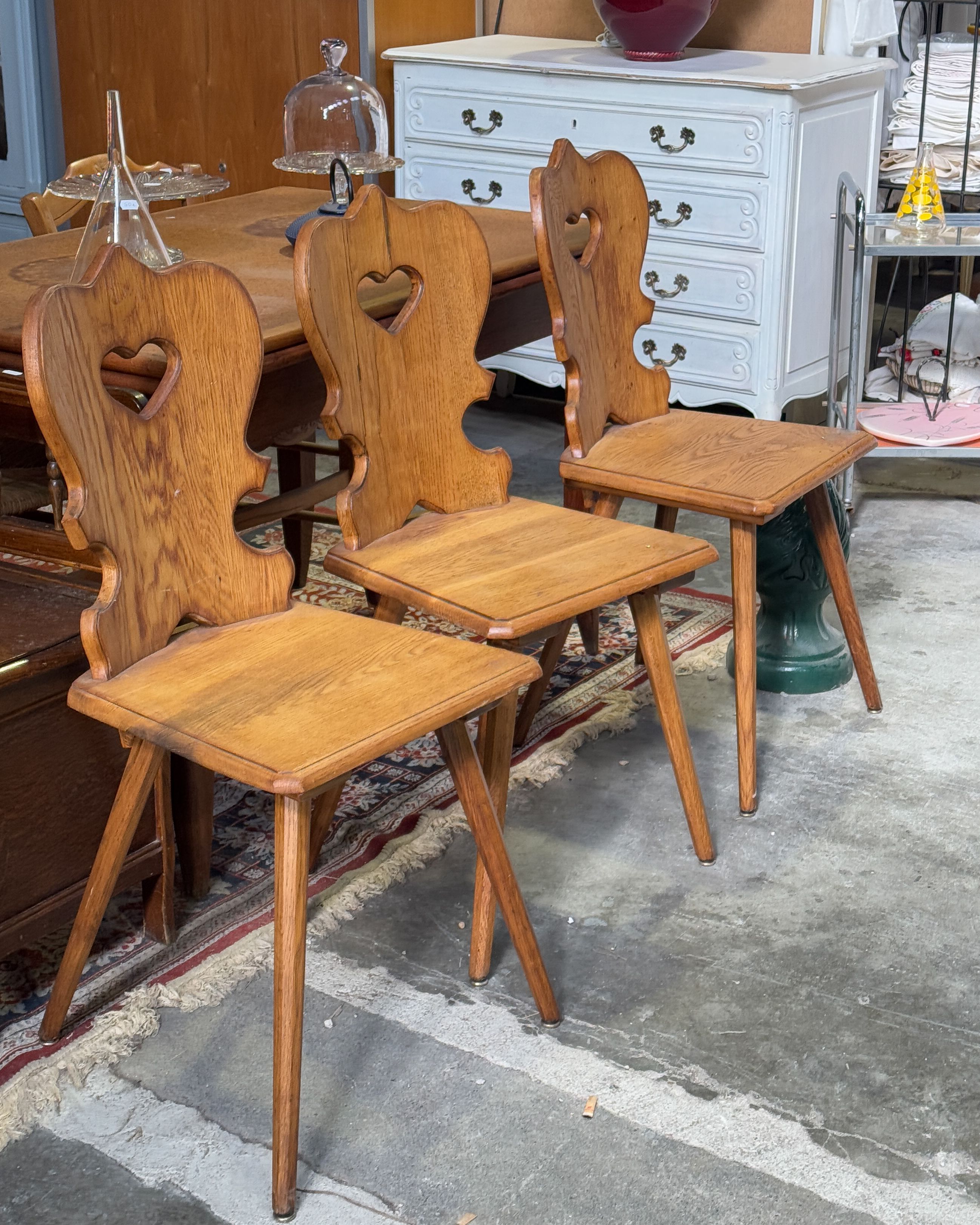 You begged us for them, so here they are! These wooden chairs from the Alsace Alps are complete with a sweet heart-shaped cutout. Handcrafted but sturdy, they work dining chairs, an accent chair, or simply a reminder that furniture can be both functional and breathtaking.