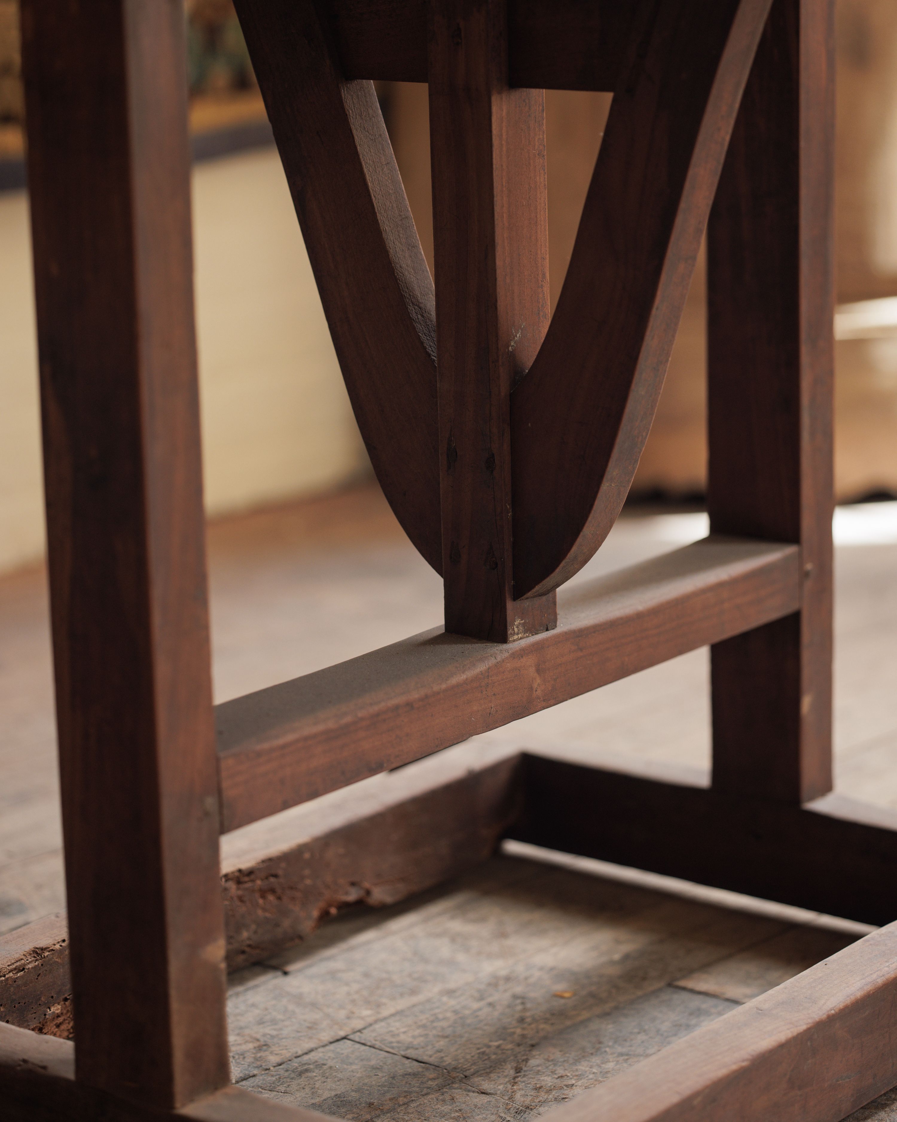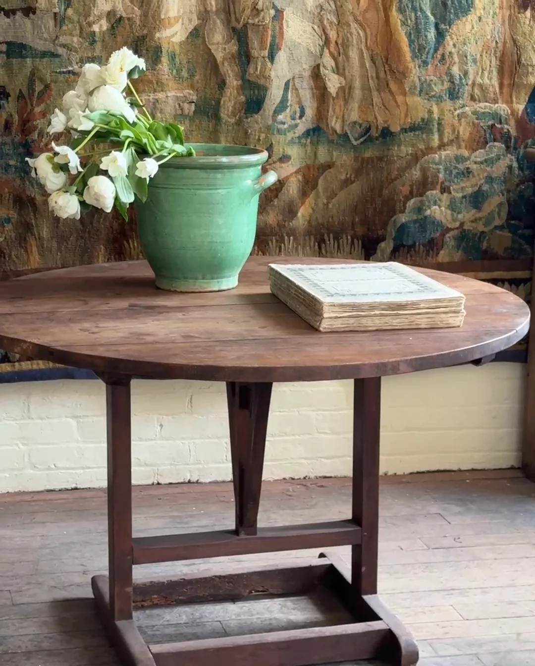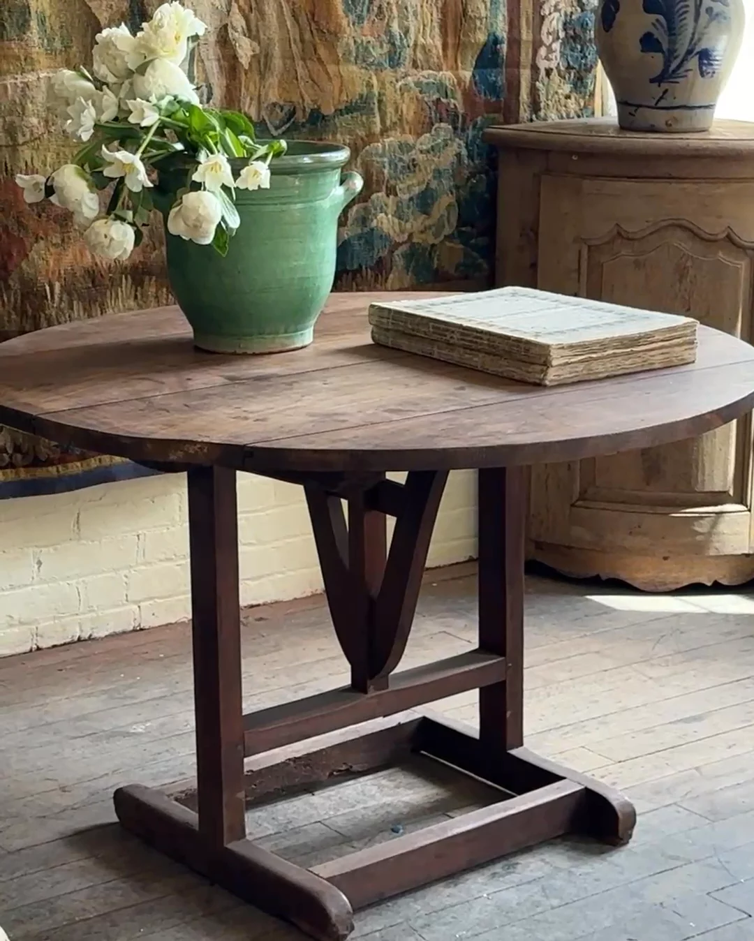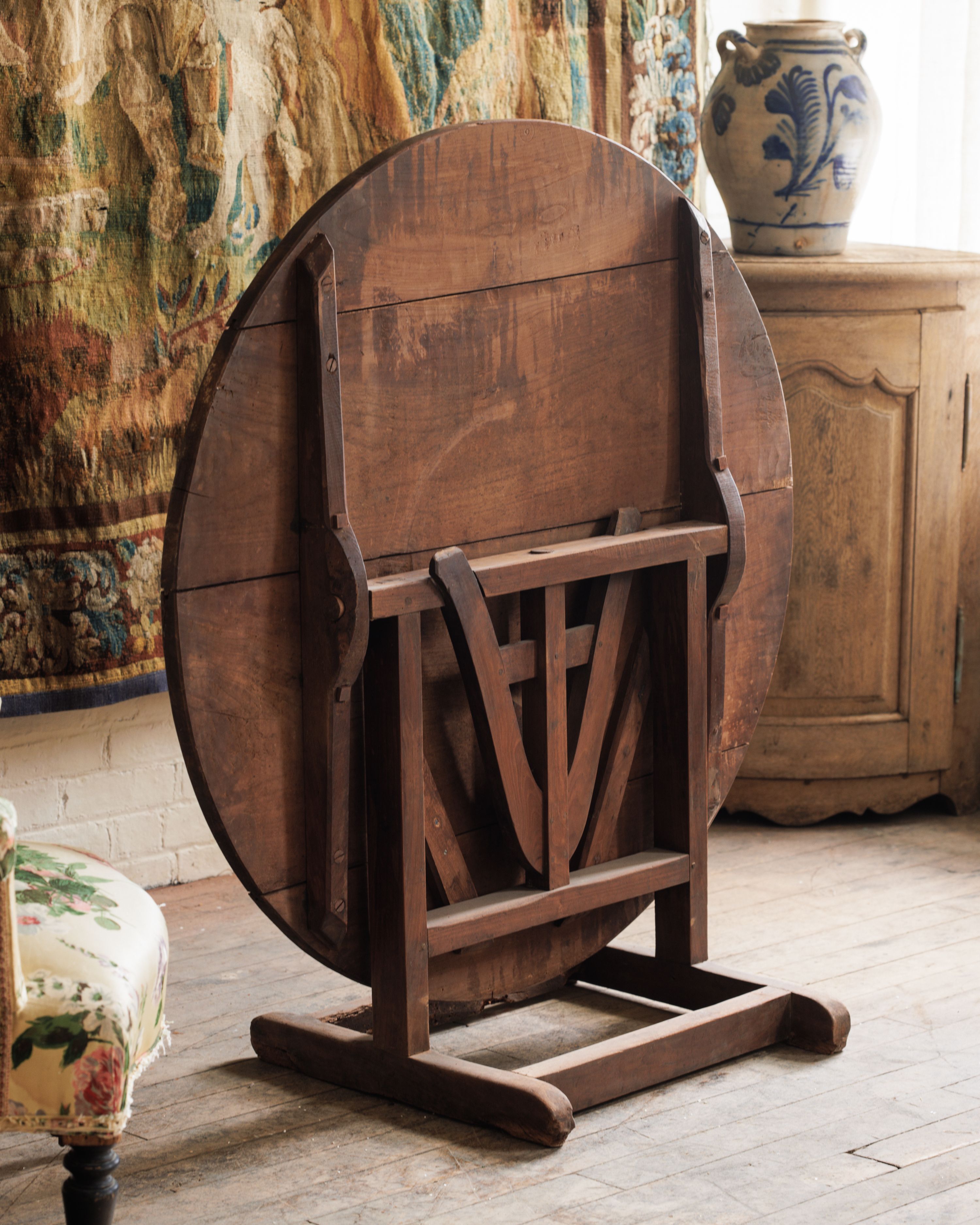 This early 1900s French wine tasting table, found in Aix-en-Provence, still glows with its original luster, the round top beautifully preserved and in remarkable condition. Built with a clever folding mechanism for easy storage in bustling wineries, it once held countless glasses of wine sampled straight from the barrel. Today, it’s ready for a second act in your kitchen, dining nook, or entryway, bringing both shine and story into modern life.