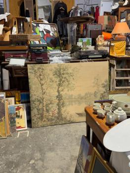 Found in Vauvert and dating to the early 1900s, this framed French tapestry brings the countryside indoors. A quiet riverside scene, soft trees, and figures posted up under the shade, maybe with a glass of rosé in hand. These panels were woven in workshops like Aubusson or Beauvais, meant to turn a plain wall into a pastoral escape. The colors are sun-faded in the best way: sage, sand, and sky blue. Sylvie leans hers on a console or hangs it above the bed with no fishing rod required.
