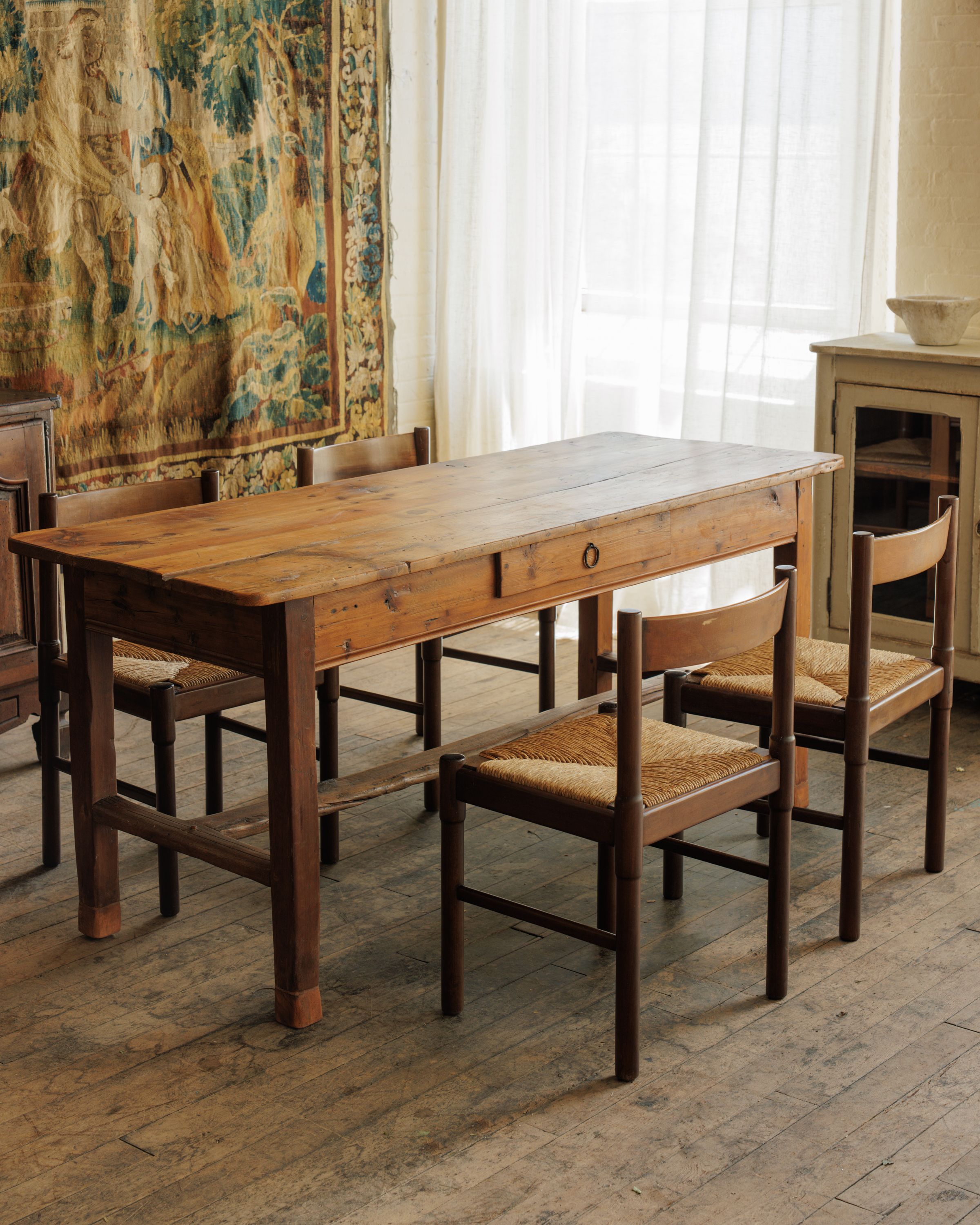 Welcome to your madman era! This set of four midcentury rush chairs strikes the perfect balance of clean lines and organic texture, with dark wood frames and great quality woven rush seats. Crafted for comfort and durability, they’re as ready for long dinners as they are for lazy morning coffee. Pair these with a mid-century tulip table or an antique farm table — you can’t go wrong either way.