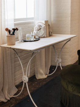 This marble table, with its scrollwork metal base, showcases beautiful patina, worn by time and weather, dates to the early 1900s and was found in a private home in Aix. Sylvie loves to place this table in a bedroom or bathroom as a vanity or living room as a side moment.