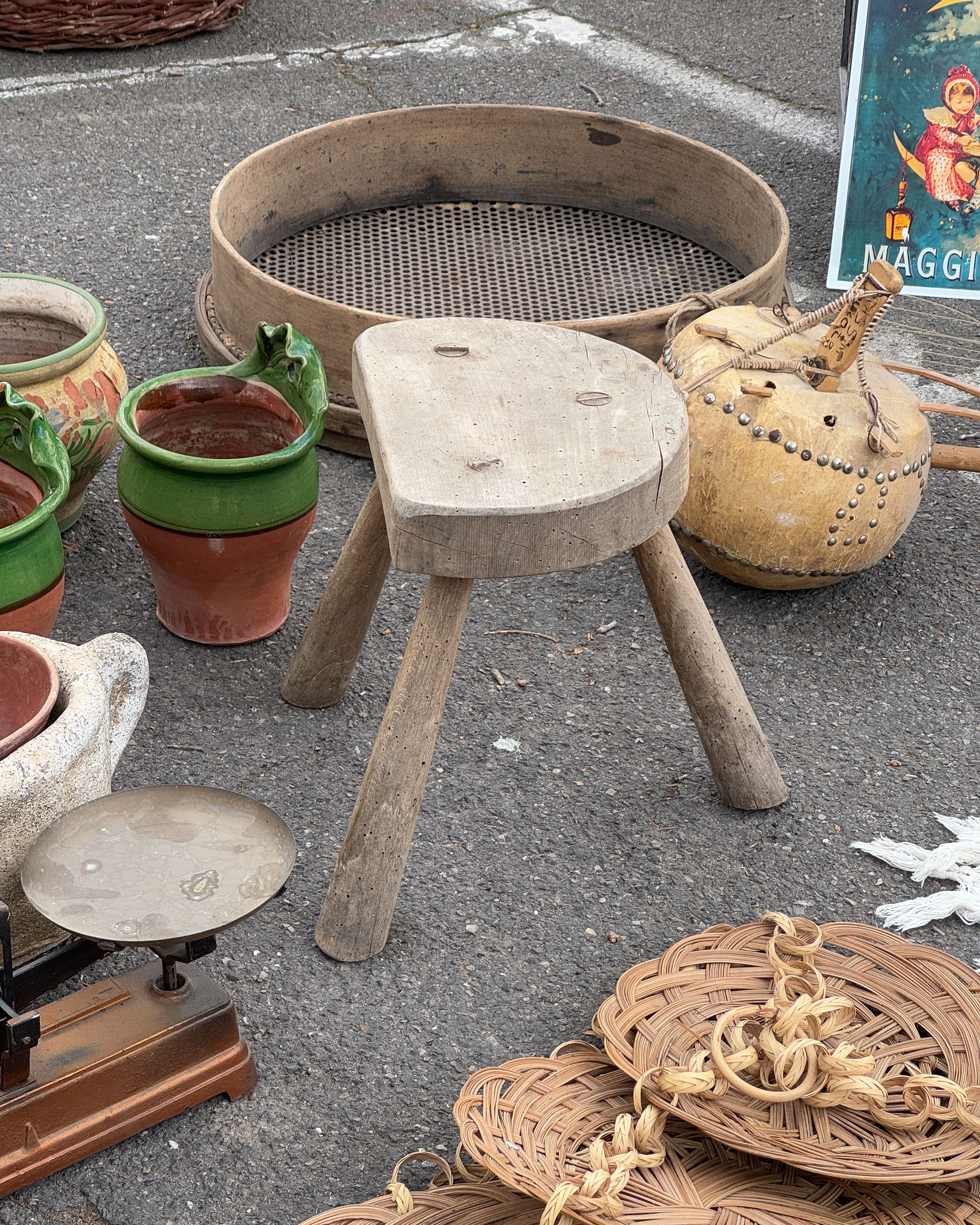 This weathered demi-lune farm stool from the early 20th century. With its thick seat and sturdy tripod legs, it’s perfect as a side table or low perch in your bathroom, entryway, or living room.