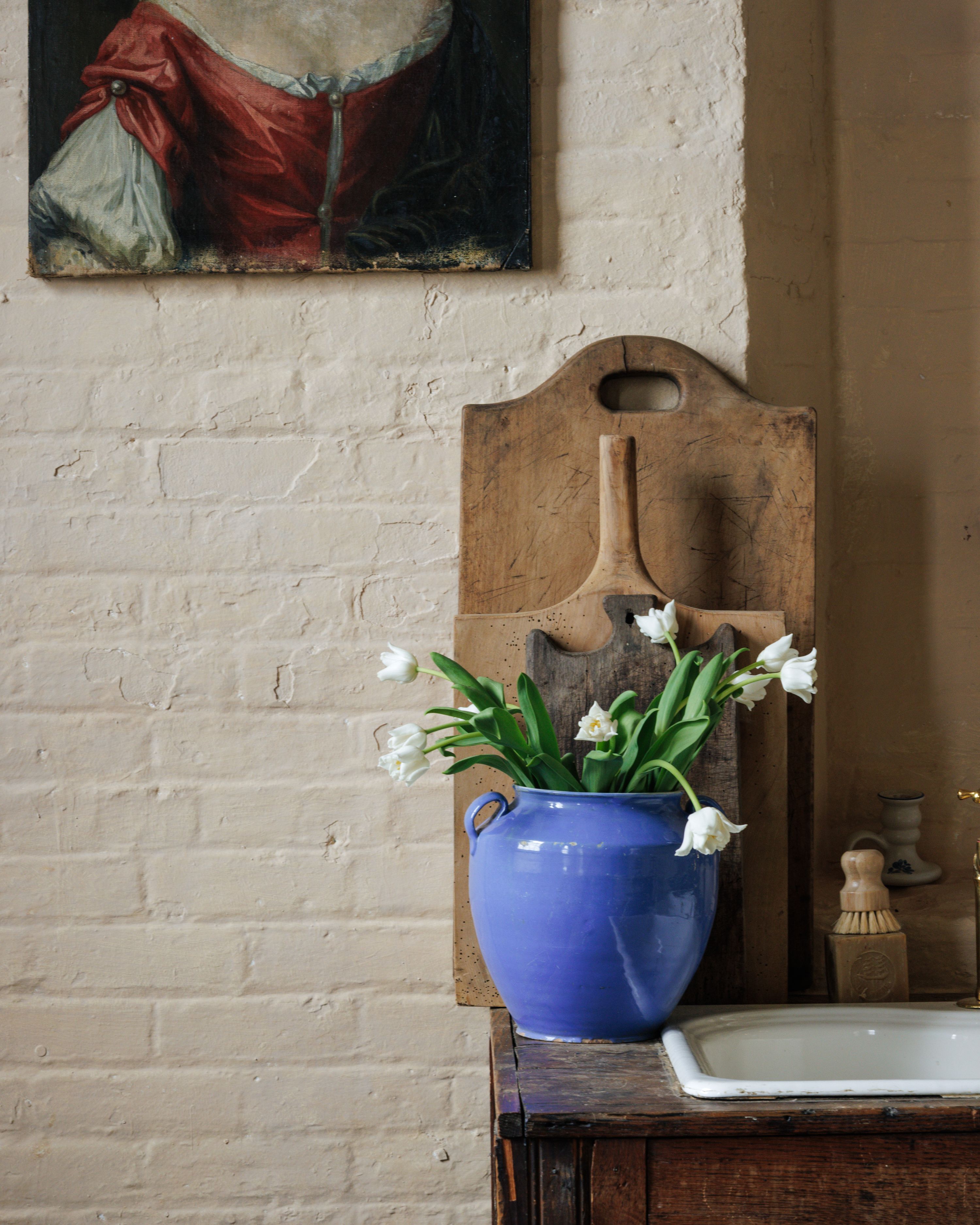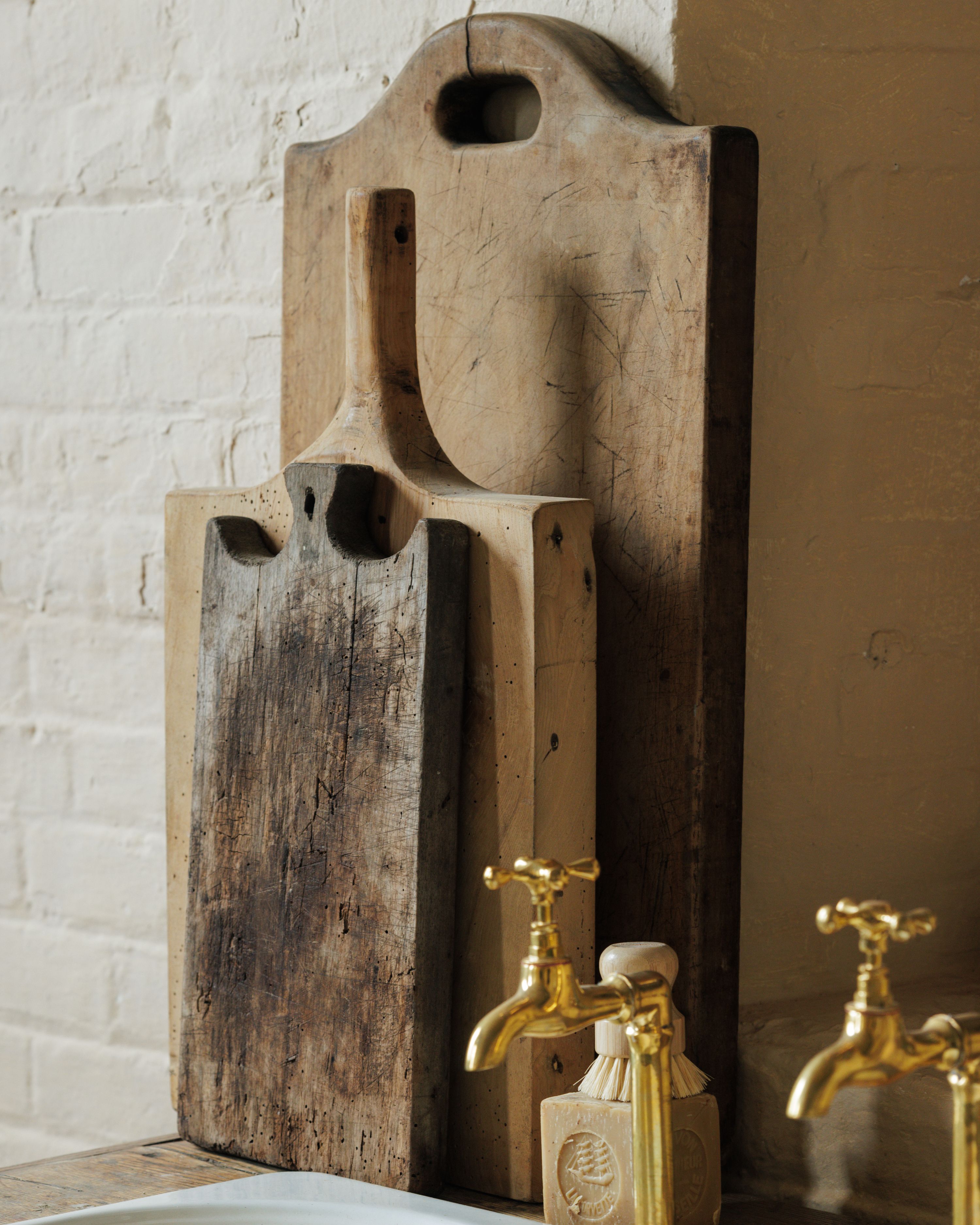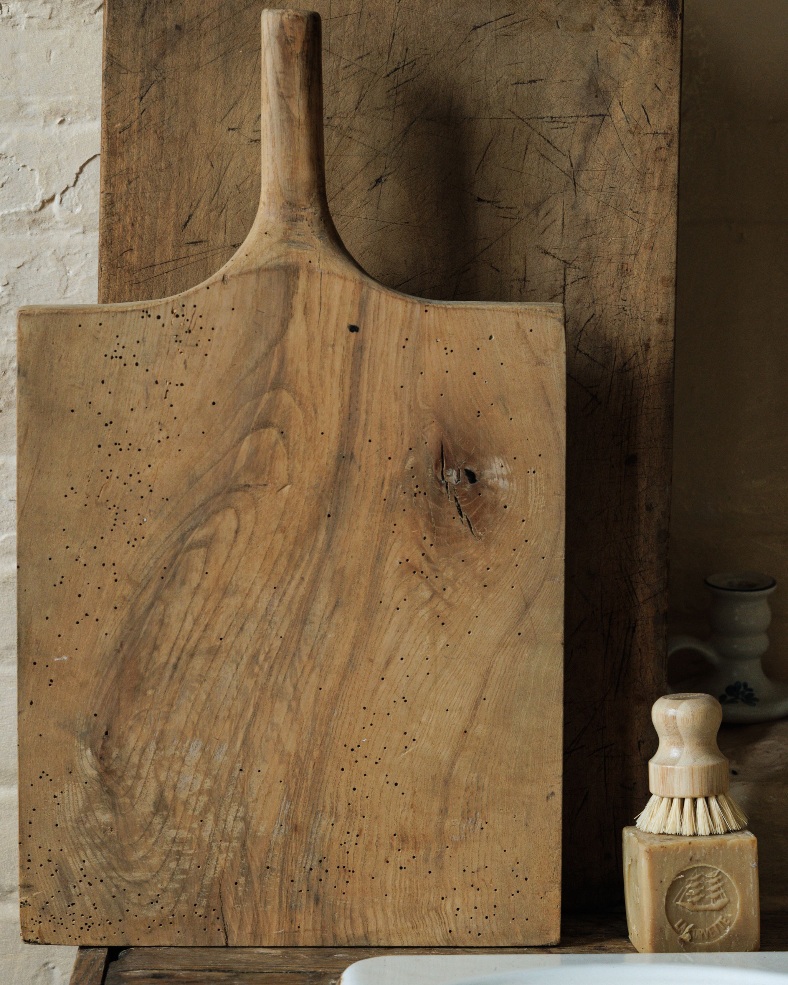 Sylvie keeps a stack of these within arm’s reach. This antique cutting board was found in Villeneuve, with a rounded handle and rich grain, worn smooth from years of use. Always ready for the inevitable charcuterie moment.