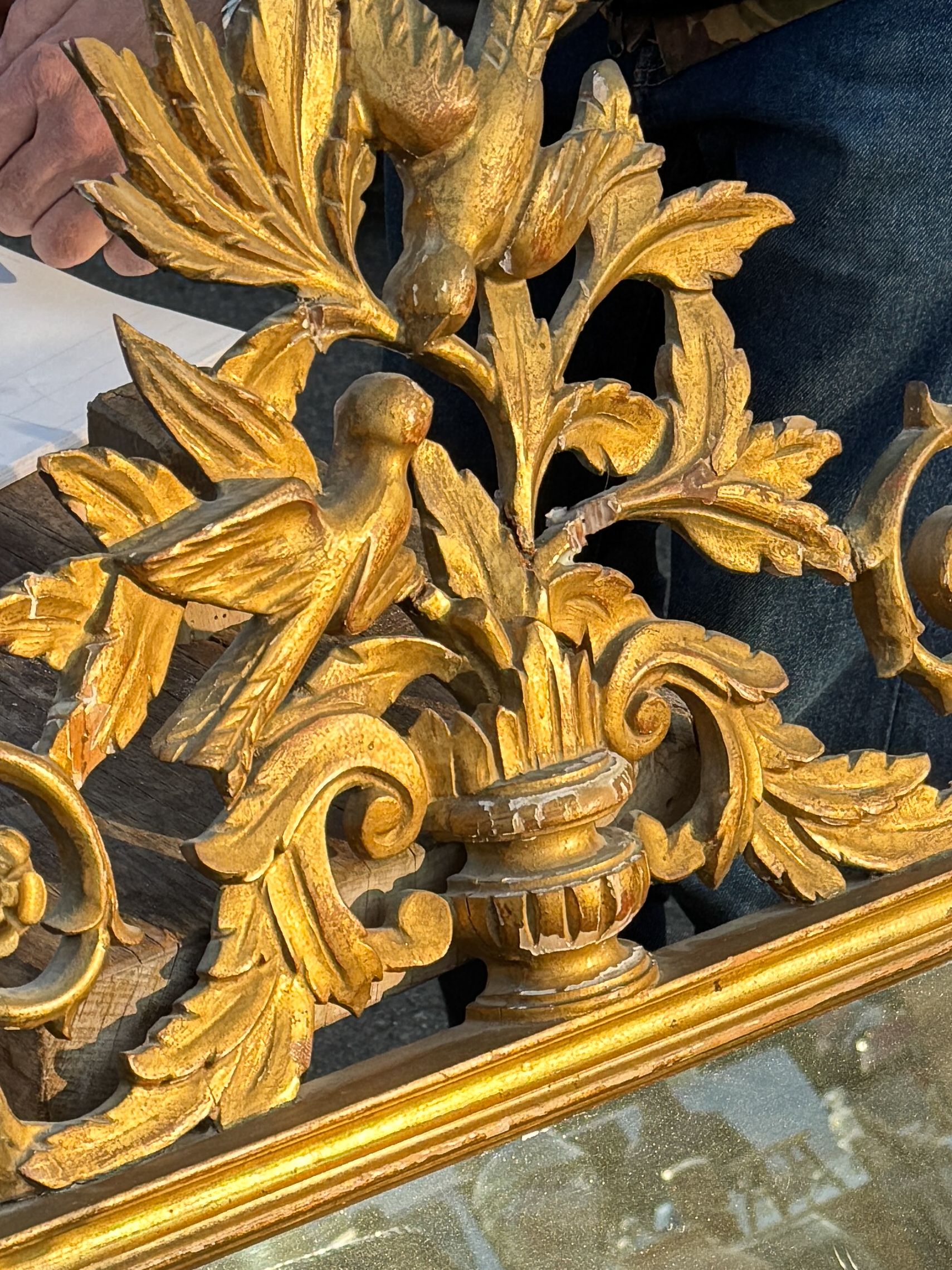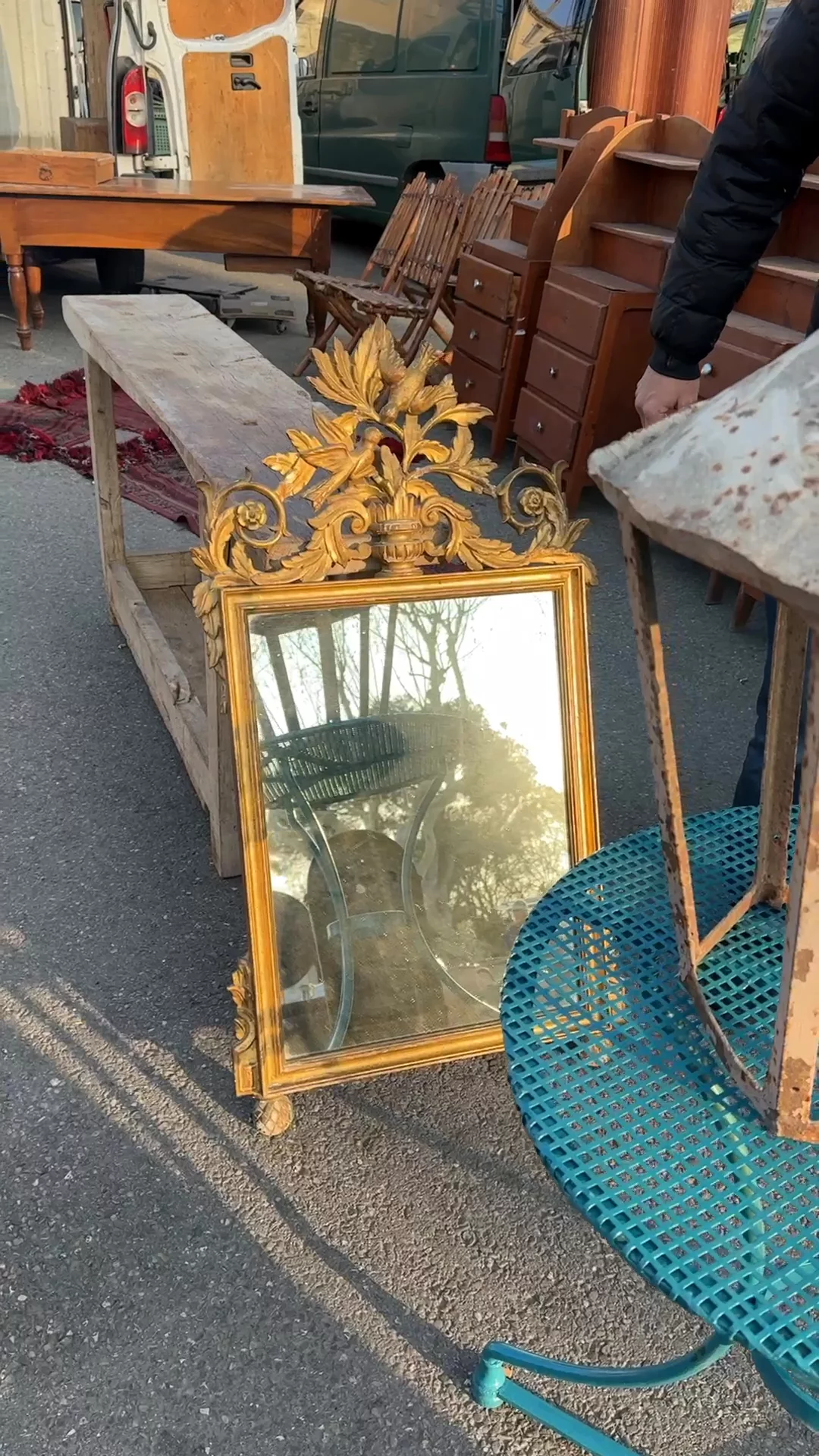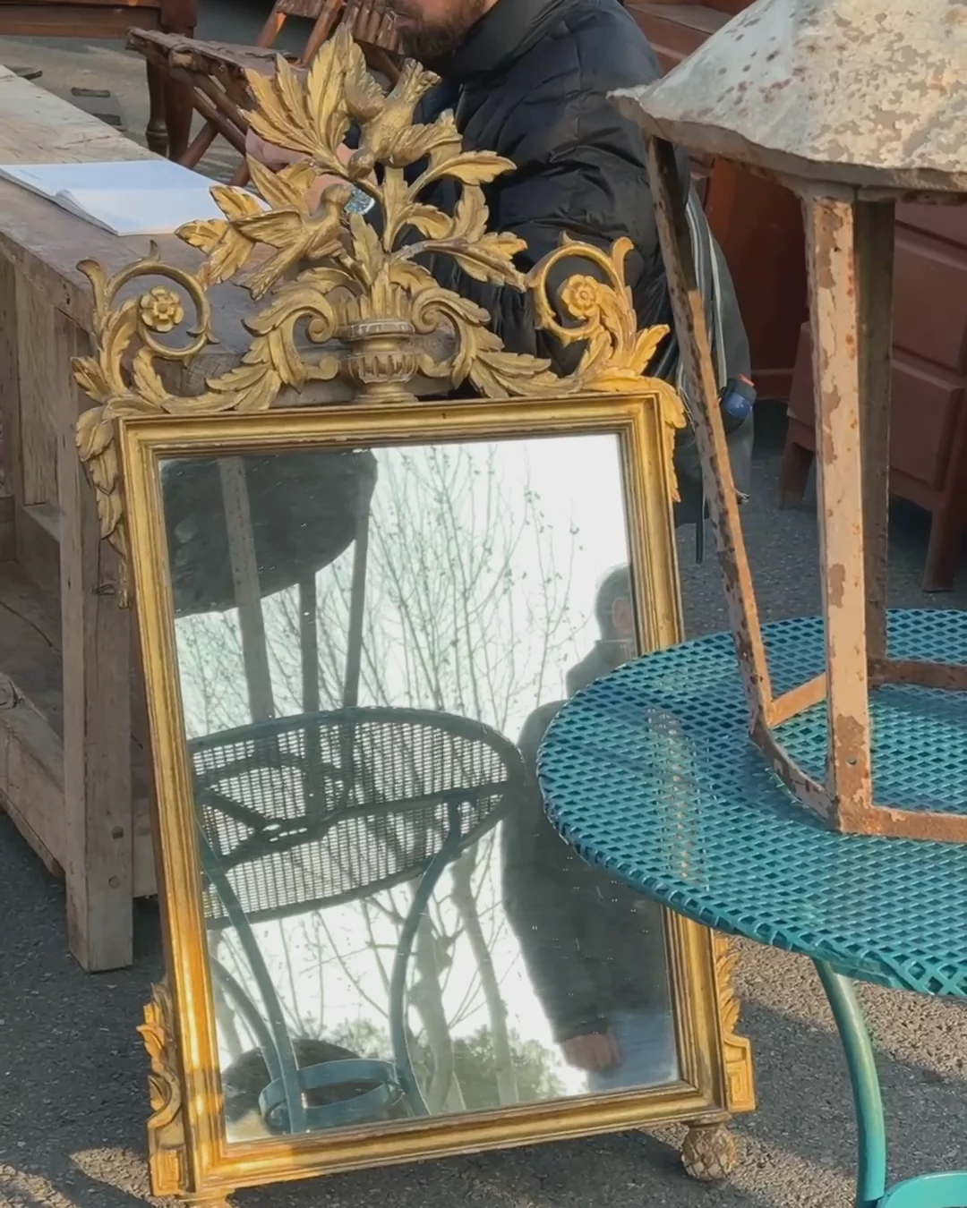 This grand 19th-century Parisian gilt mirror, with its scrolling acanthus leaves and perched birds, was just spotted in the markets of Villeneuve. Heavy, ornate, and gloriously over-the-top, it's the kind of piece that makes a wall feel like a palace. Sylvie loves to style this piece to bring a neutral room alive, at an entry way, behind your sofa or above your bed. Worry not dear collector, Sylvie quality checks and cleans each item before its journey to you.