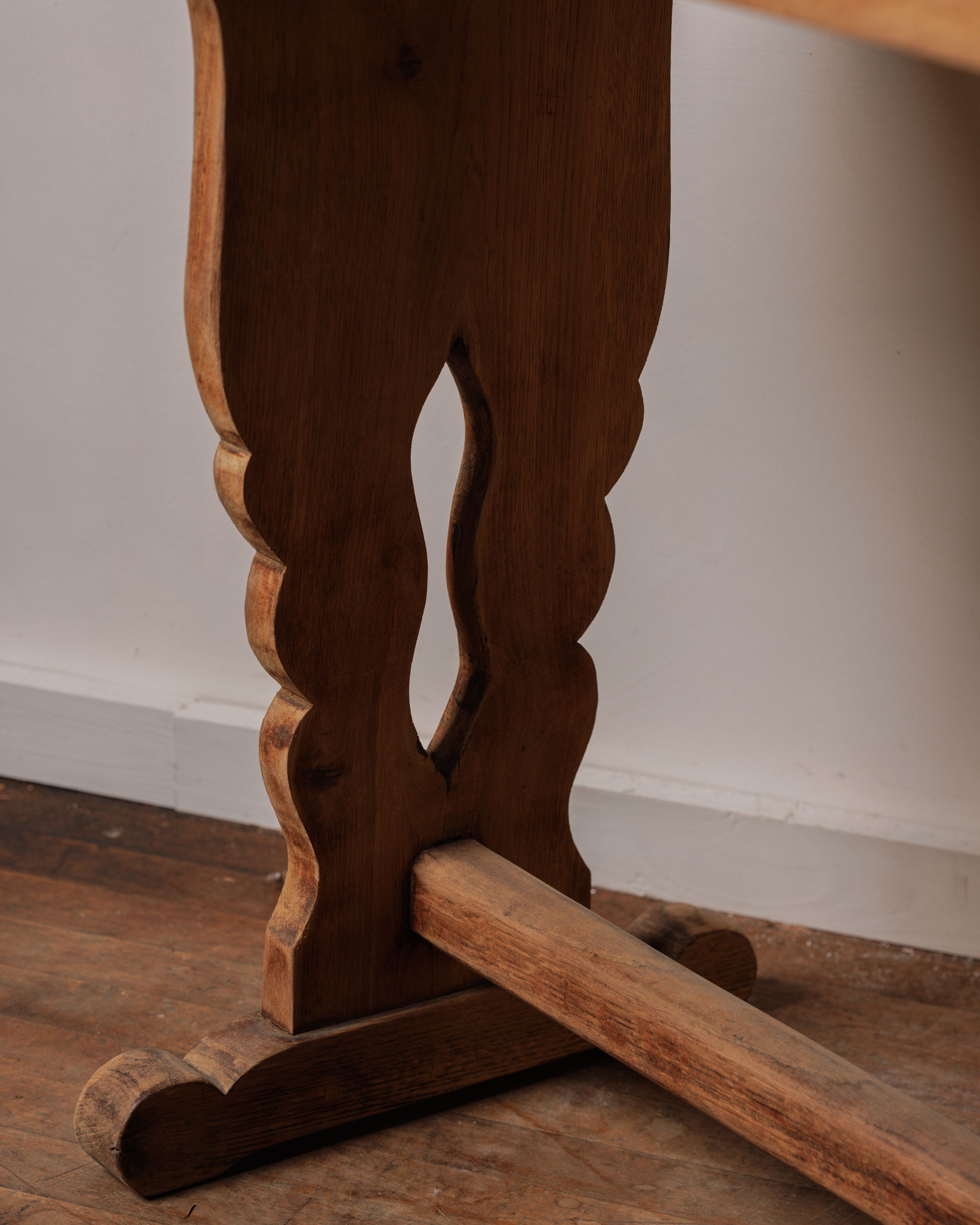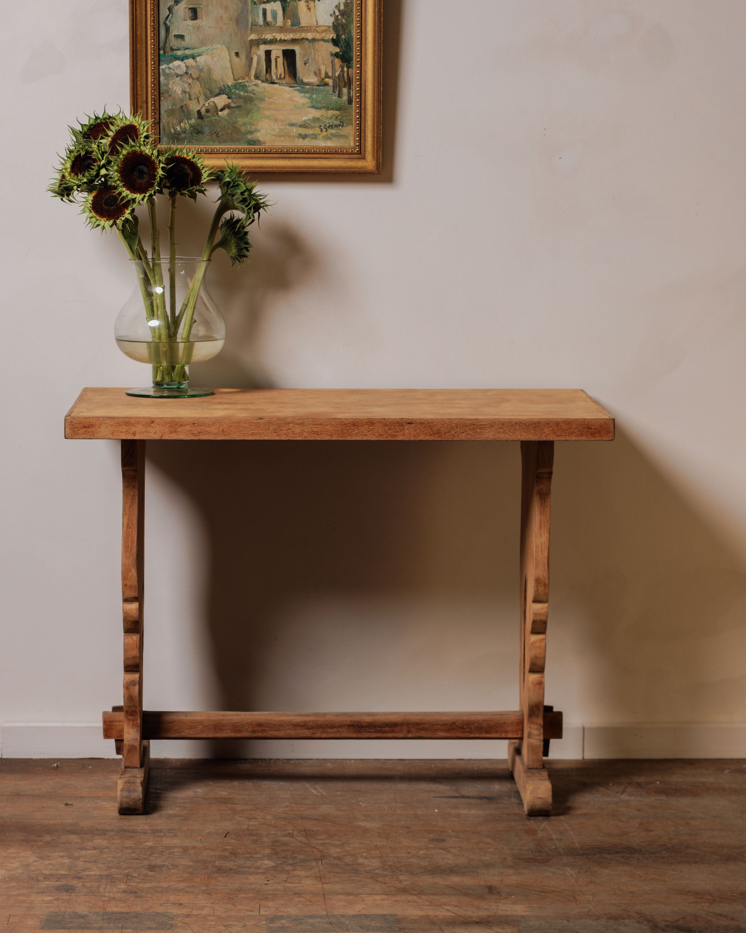 Some tables are built for show, this one was built for bread, milk, and life itself. Found in Le Perche, Normandy, this 19th century pine trestle table once lived in a farmhouse, its broad planked surface carrying the everyday essentials of rural life. The carved legs and stretcher still hold steady, a reminder of its practical roots. Today it makes an effortless console in a hallway or dining room, ready to catch keys, stack books, or serve as a stage for your favorite handmade ceramics.