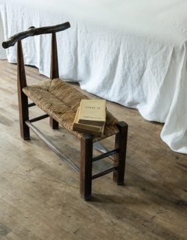 Handmade primitive French armchair with a rush seat and hand-carved dark wood frame, found in the backroom of a seller in Villeneuve and now headed to the Sylvie estate. Sylvie collects chairs like some people collect secrets-each one has a story, and this one’s ready for yours. We’d place it in the corner of a bedroom or at the end of a dining table to stir up a little drama.