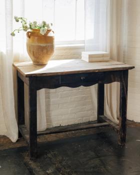 Oh la la! Just found in the markets of Villeneuve and not yet stateside, this 19th-century walnut table hails from the Vauvert area, with a scalloped apron and years of honest wear. With two drawers, it would make an ideal desk or vanity, especially in a bedroom or tucked-away corner where you can keep your favorite things close.