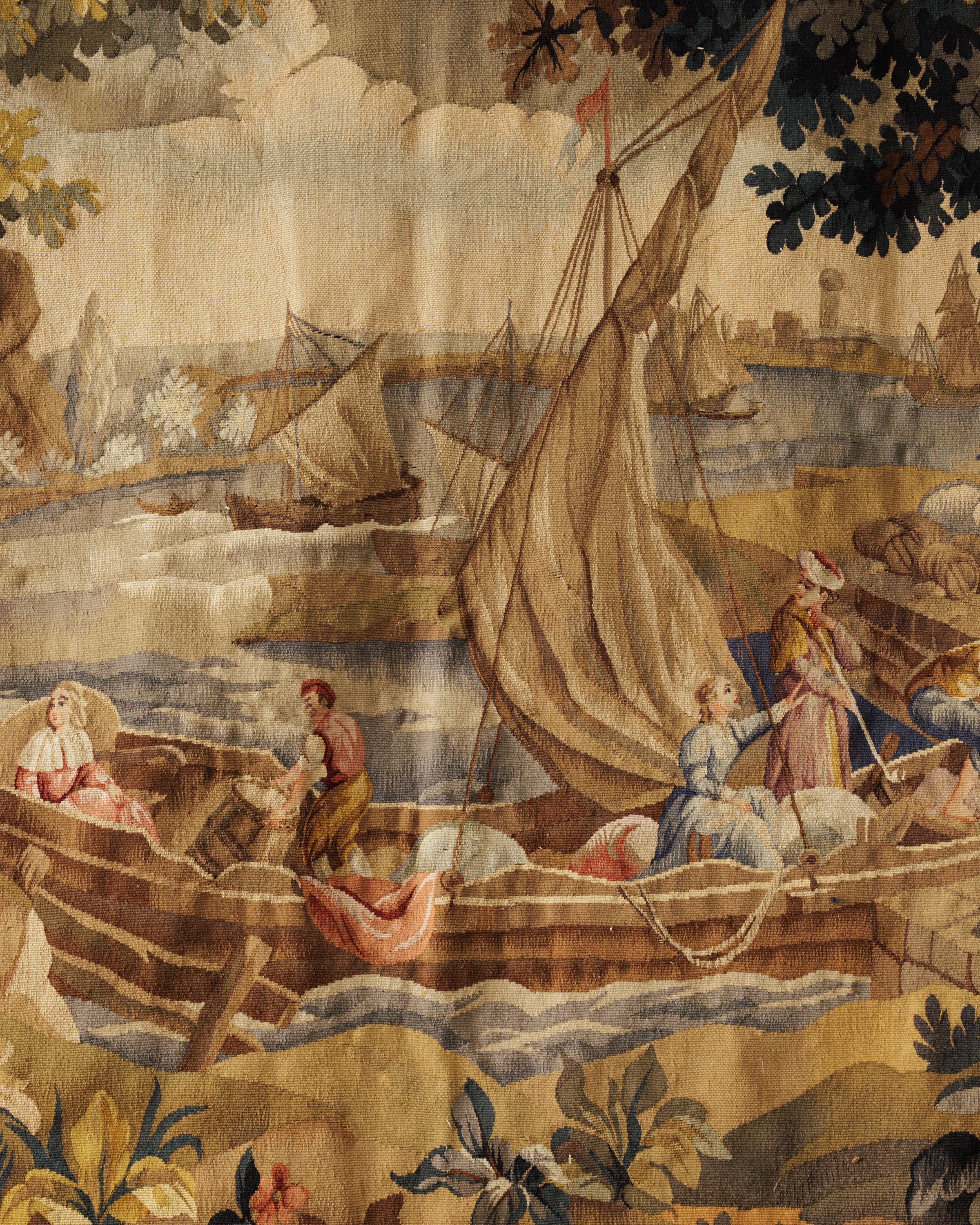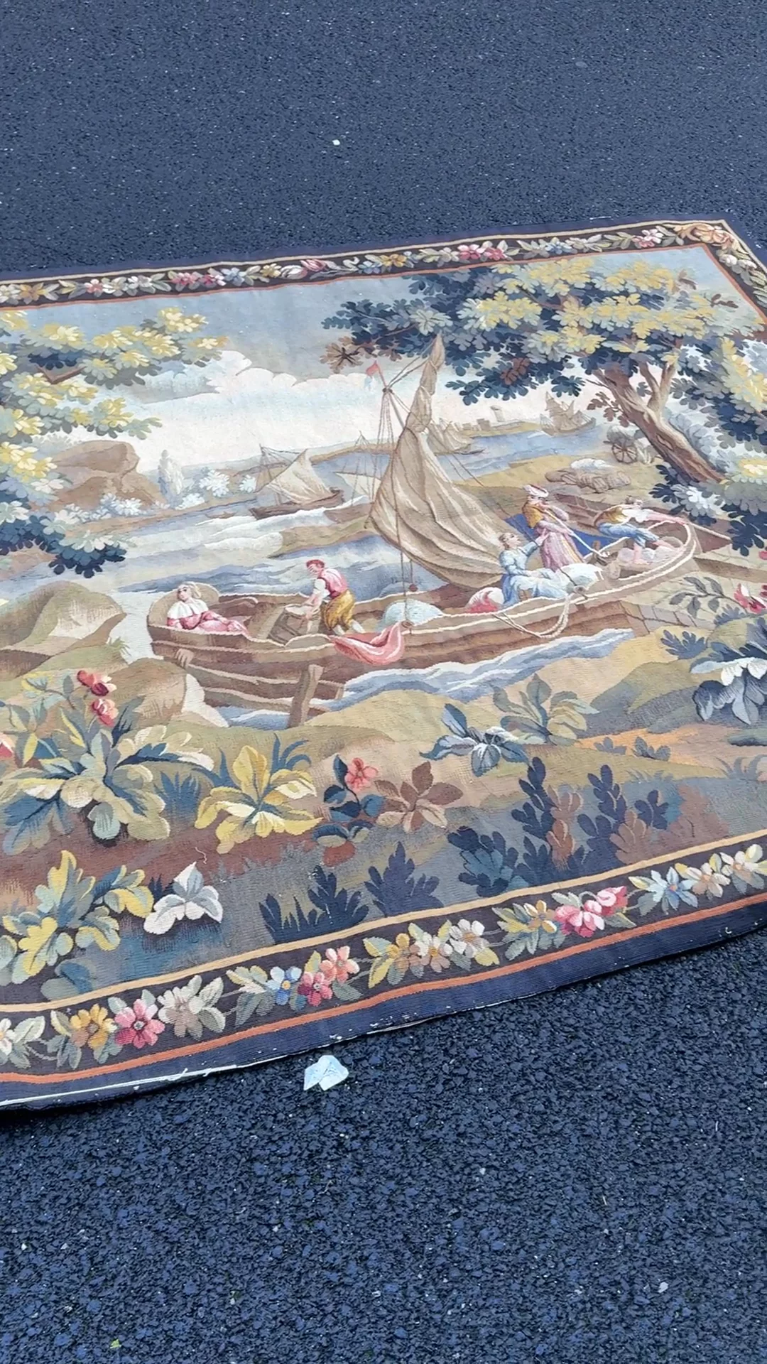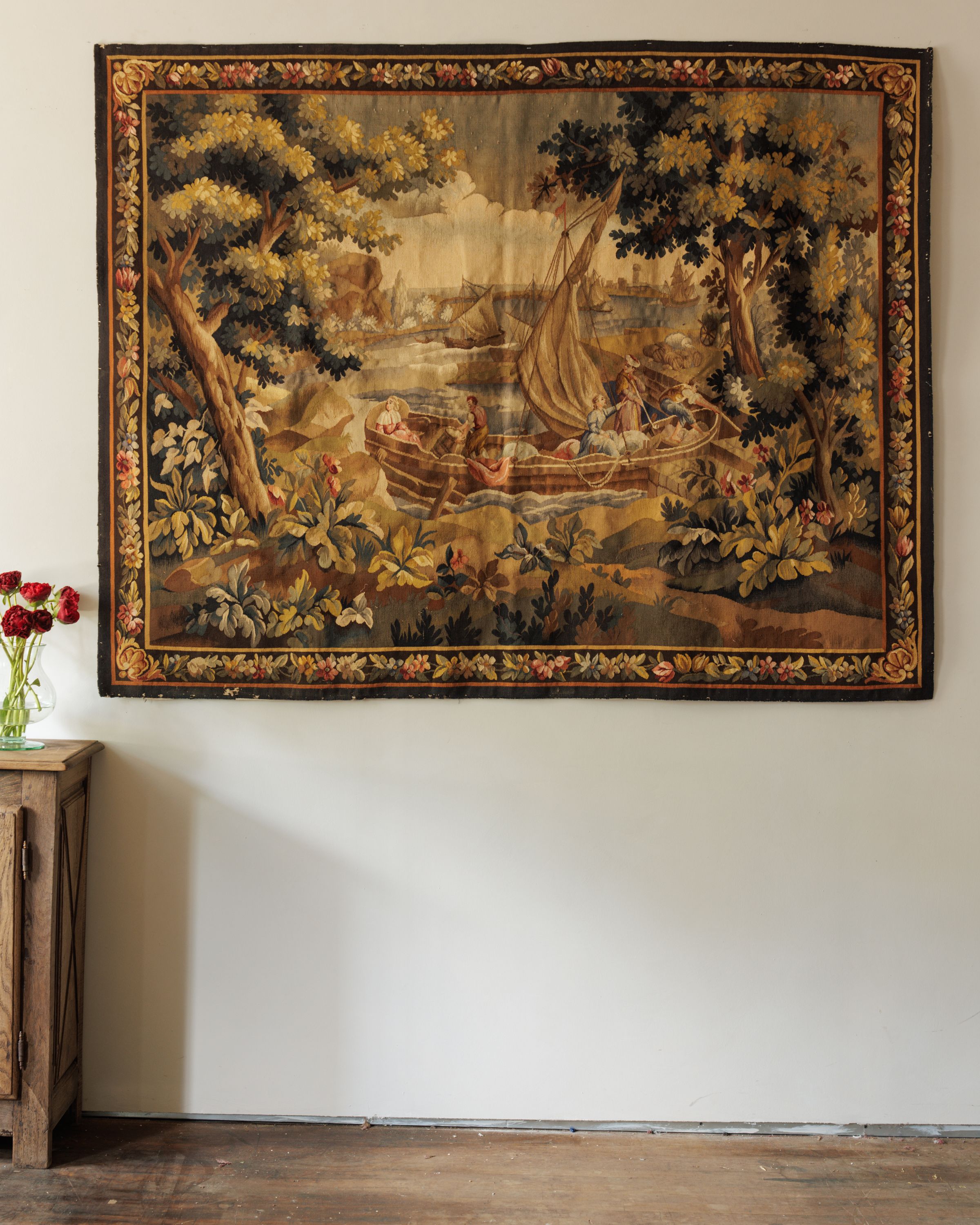 A true authentic Aubusson tapestry, a rare find these days. This early 19th-century Aubusson tapestry, woven entirely in wool, captures a lively riverside scene with figures aboard boats, sails billowing as they navigate near a lush shoreline dotted with towering trees and foliage. Handwoven with intricate detail, it boasts vivid vegetal borders and those delightful loose threads peeking from the back that speak to true artisan craftsmanship. It comes without a frame or hooks, but Sylvie imagines it as a stunning headboard or draped behind a sofa.