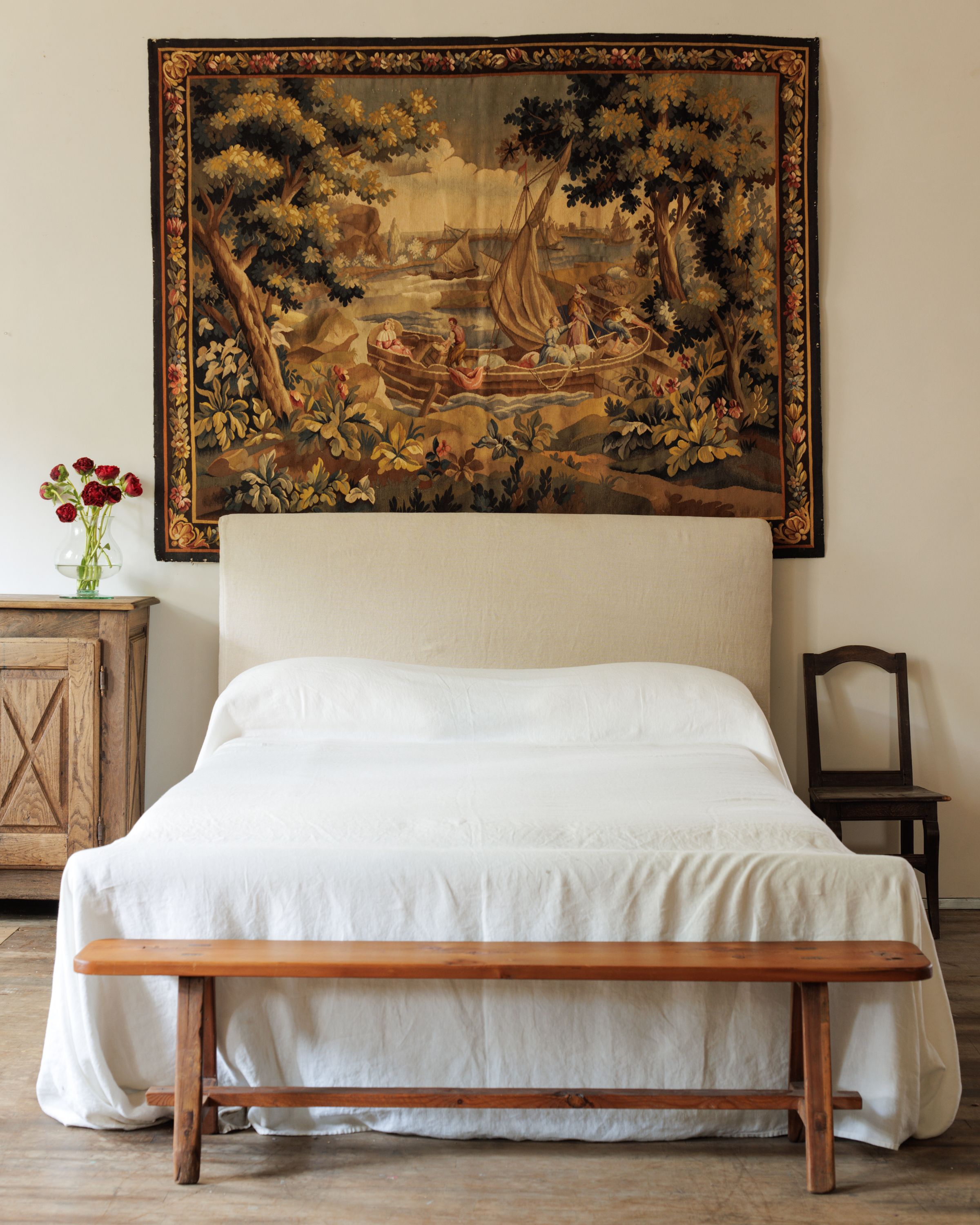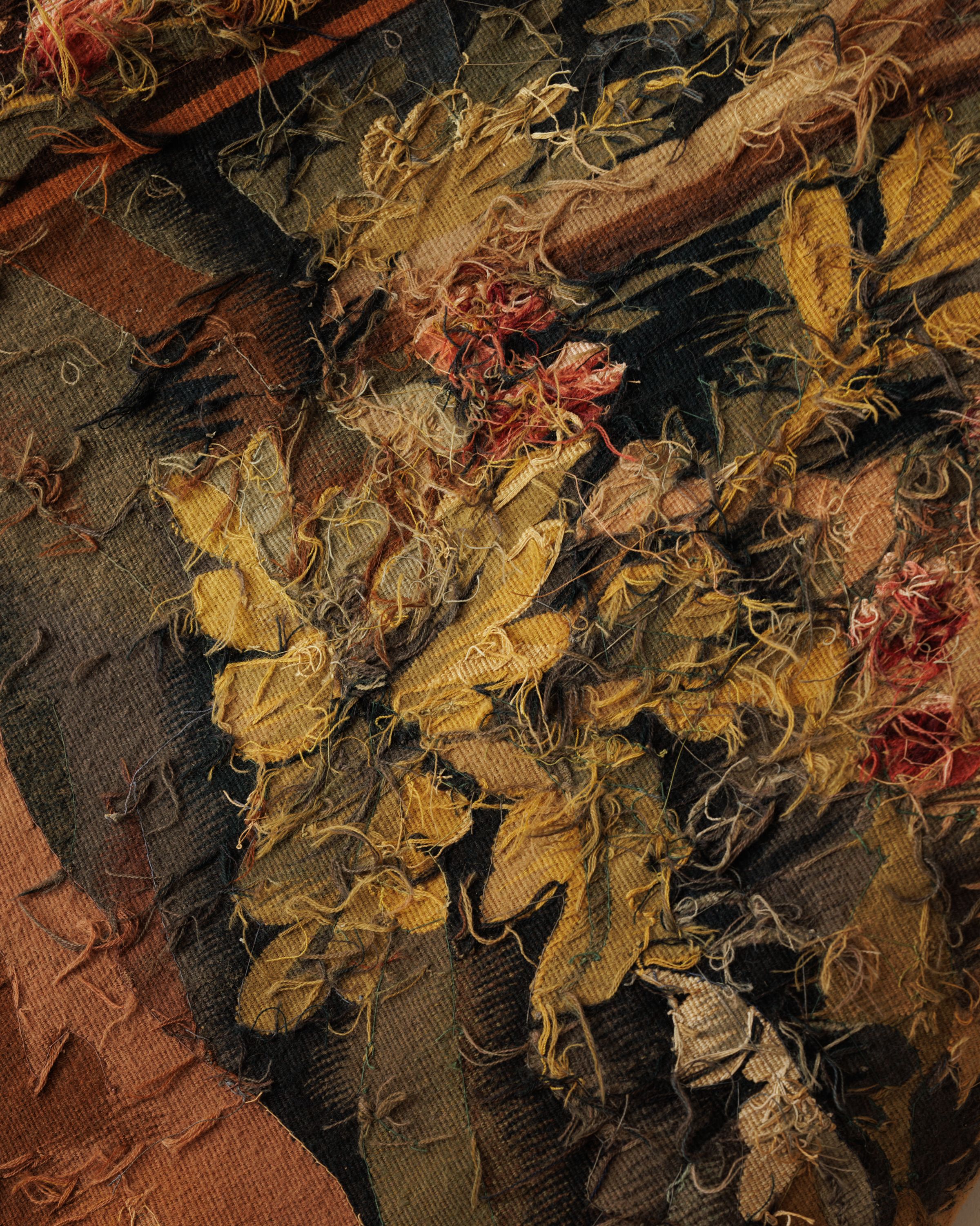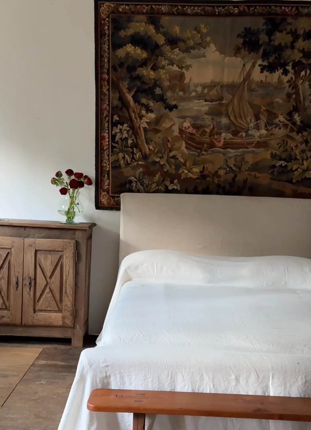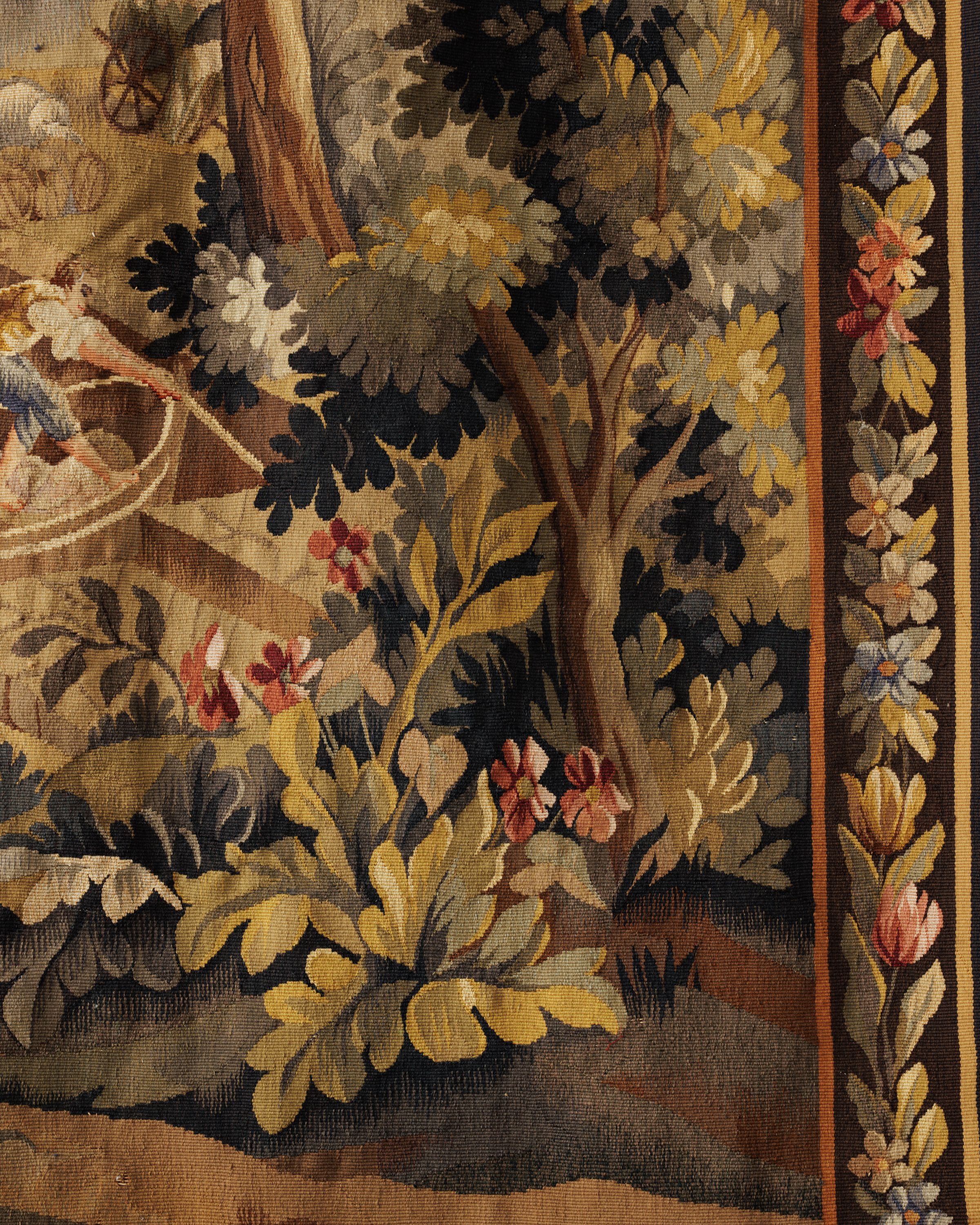 A true authentic Aubusson tapestry, a rare find these days. This early 19th-century Aubusson tapestry, woven entirely in wool, captures a lively riverside scene with figures aboard boats, sails billowing as they navigate near a lush shoreline dotted with towering trees and foliage. Handwoven with intricate detail, it boasts vivid vegetal borders and those delightful loose threads peeking from the back that speak to true artisan craftsmanship. It comes without a frame or hooks, but Sylvie imagines it as a stunning headboard or draped behind a sofa.