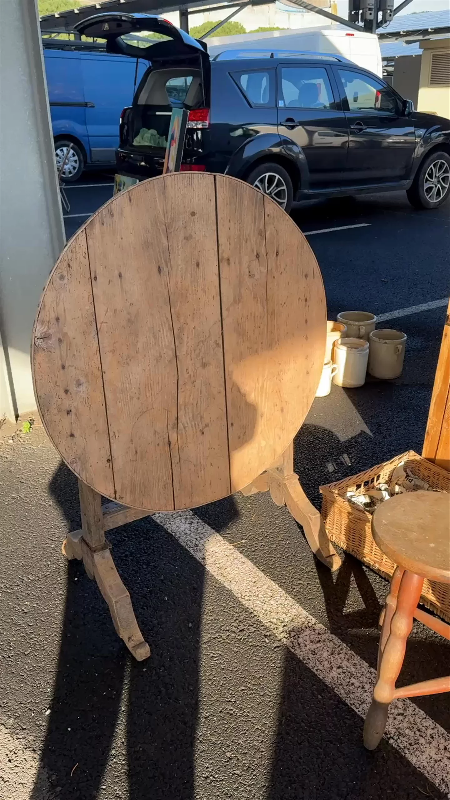 Once used in French vineyards to sample the latest vintages right in the cellar, this antique wine tasting table has weathered many a bold red and crisp white. The round top - worn smooth with time, scattered with old nails and splits - folds down on a collapsible base, though we prefer it open, of course, on the paving stone patio with a Spritz in hand and a dish of olives nearby.