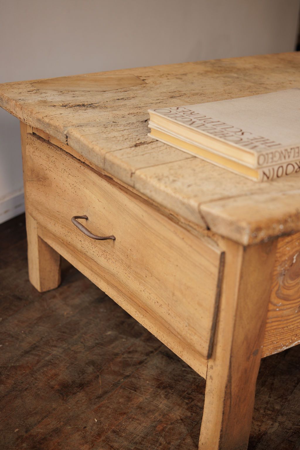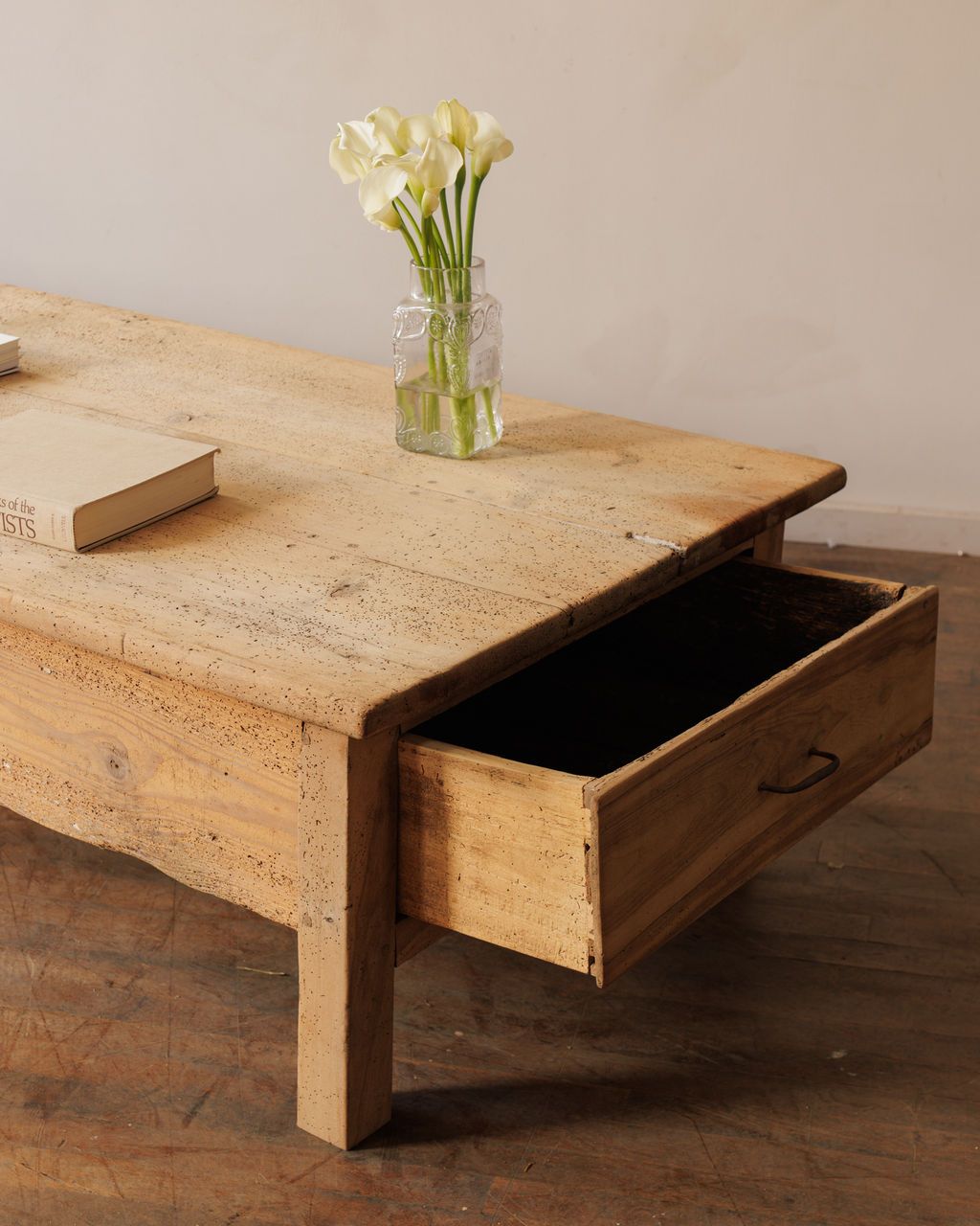 Lyon gave us silk, gastronomy, and this table. We’re grateful for all three. This 19th-century pine table was originally used in a farmhouse kitchen outside Lyon - built for meals, messes, and everything in between. Recently cut down to a beautifully sized coffee table, it still carries the weight and warmth of its original purpose. The wide plank top shows the kind of wear that comes from real daily life: flour dust, hot pots, elbows on wood. Sylvie styles it in front of a deep linen sofa with nothing but a book and a bowl - let the grain do the talking.