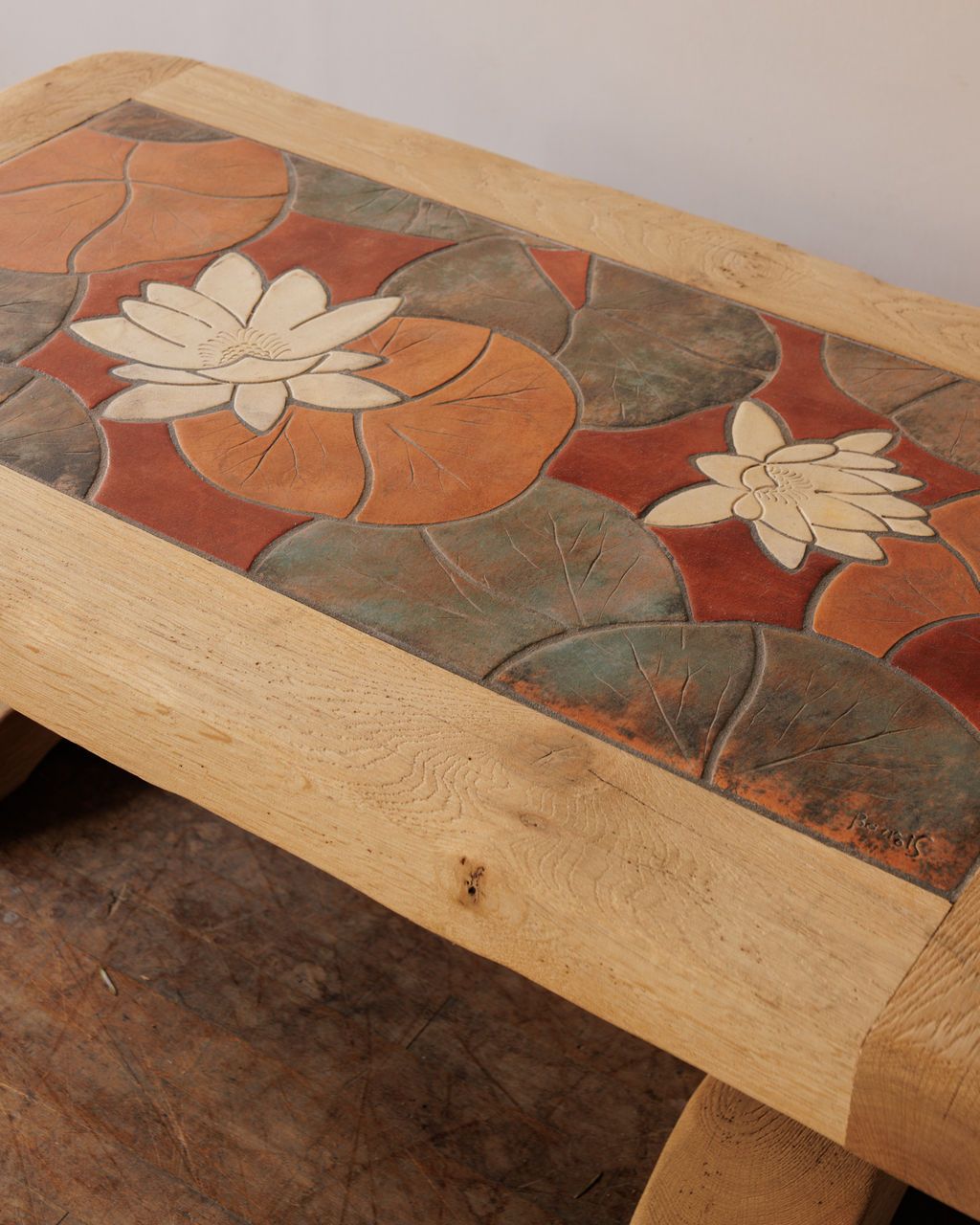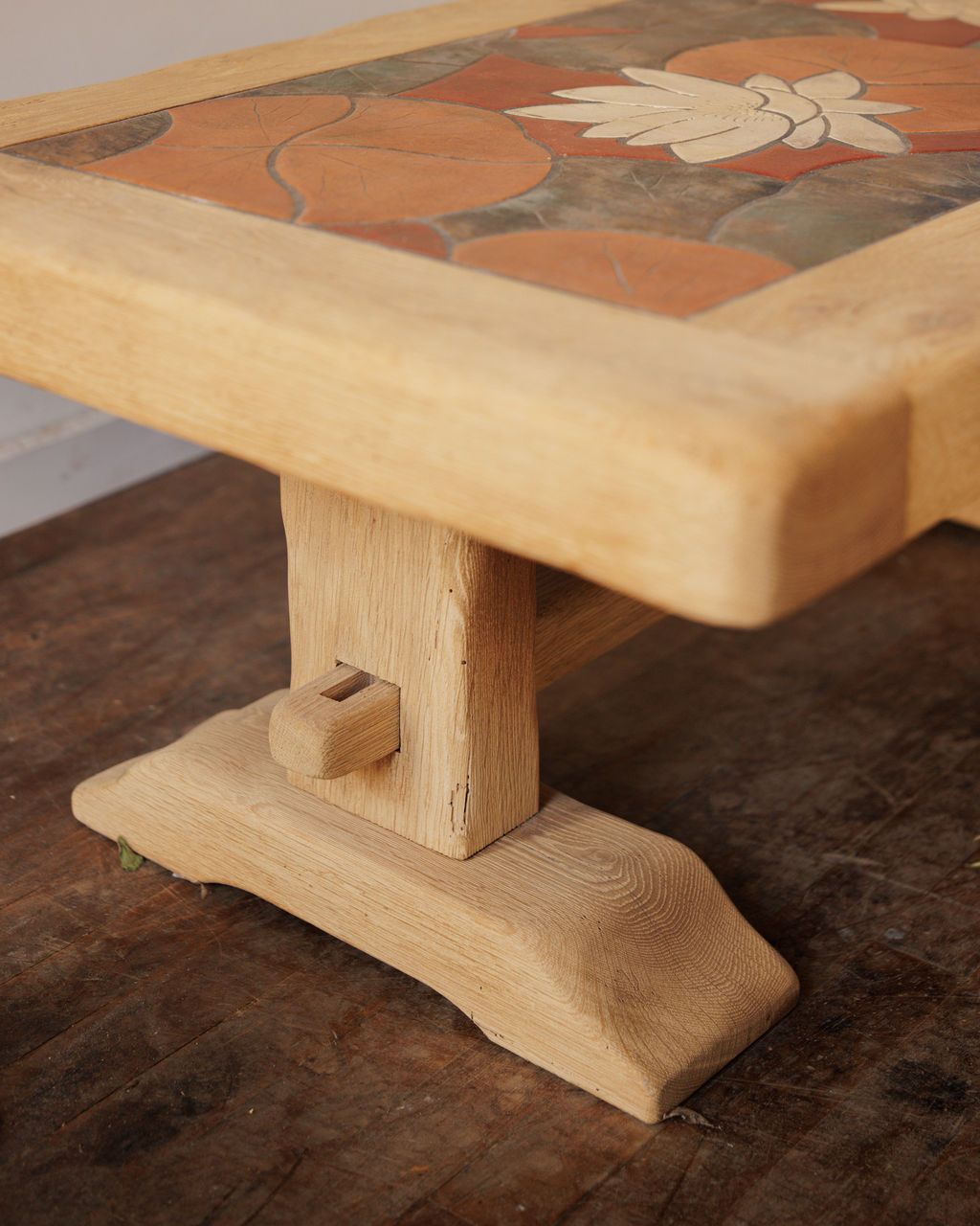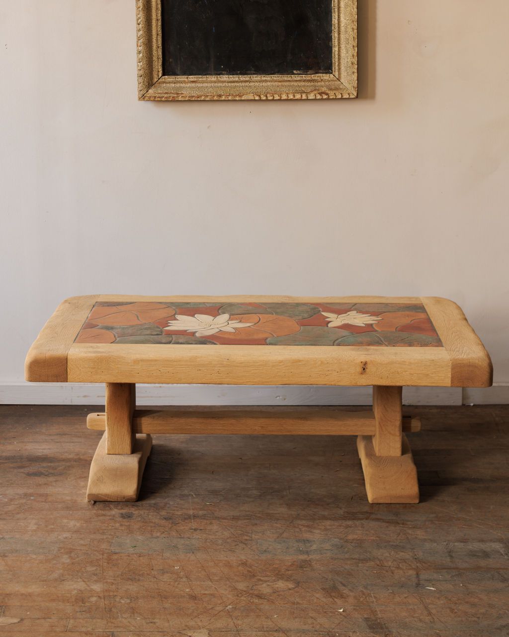 A pond scene, frozen in oak and tile. Found in Vauvert, this midcentury French coffee table pairs the weight of solid oak with the delicacy of a lily-covered pond rendered in ceramic. The tiles are hand-set and grouted in soft shades of terracotta, green, and cream, framed by a thick trestle base with rounded edges that invite touch. Made in the 1950s, its design nods to the era’s fascination with organic forms and nature-inspired craft. Sylvie loves it in a sunroom or beside a low linen sofa, where it quietly steals attention without asking for it.