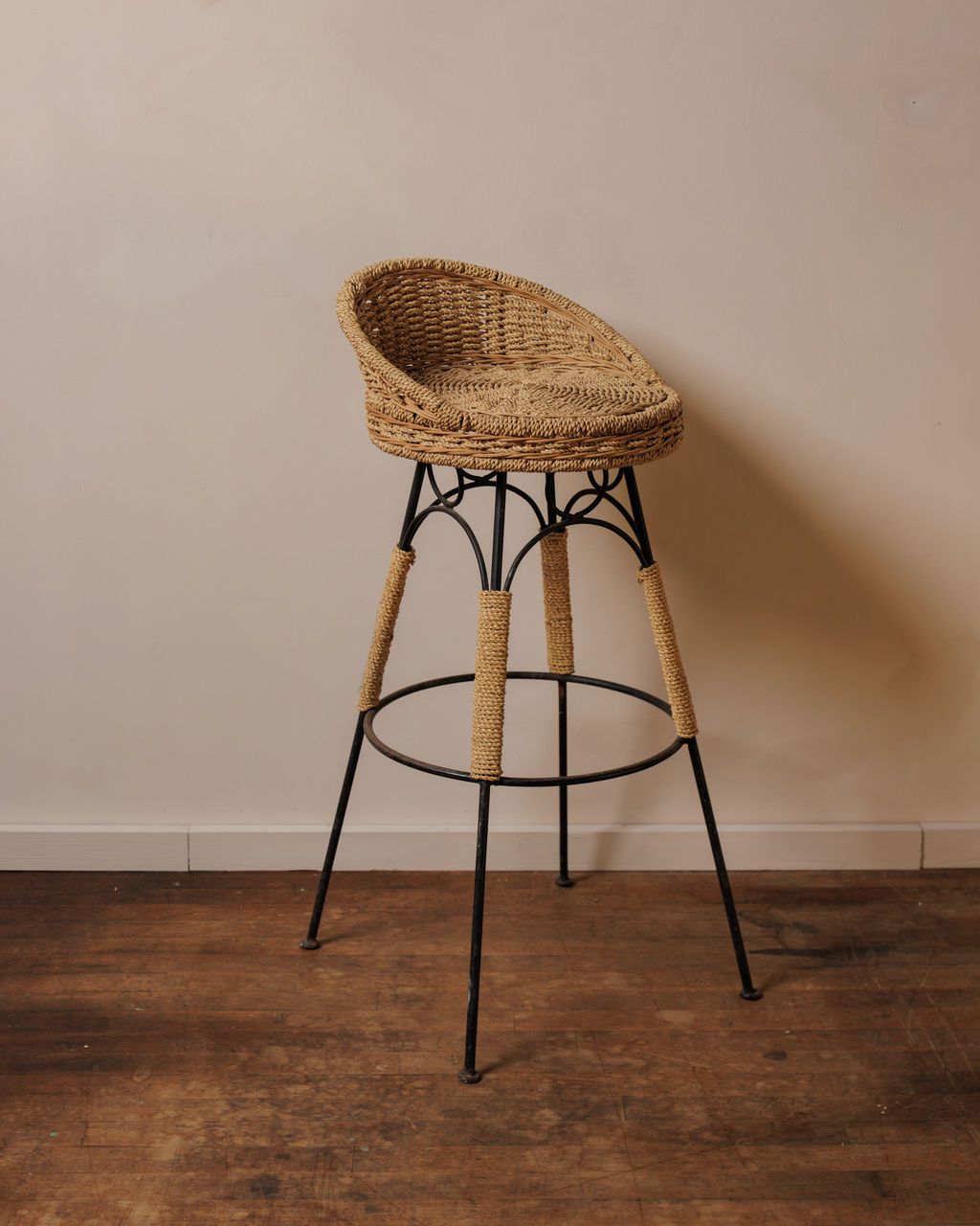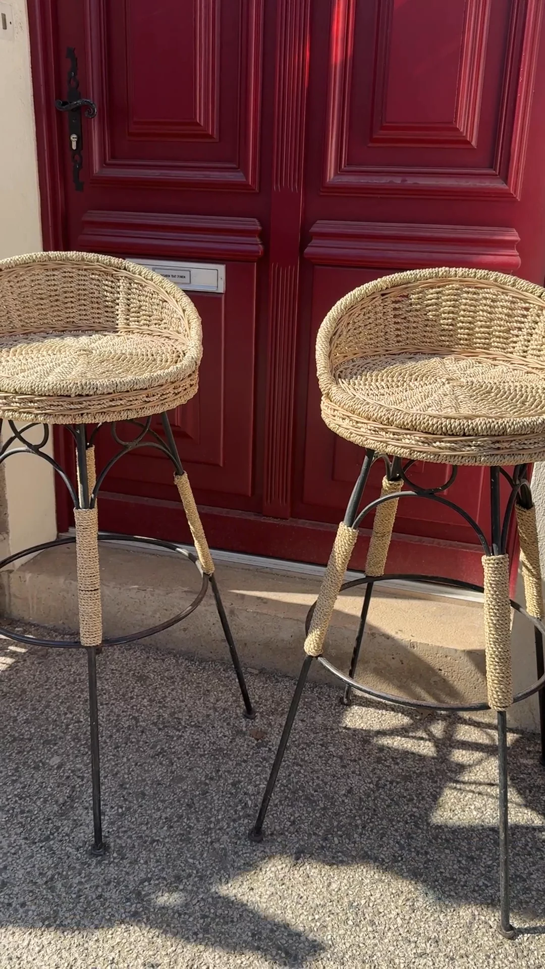 We just spotted this pair of swivel midcentury high-top stools in the markets of Villeneuve. With woven rattan seats and slender black metal frames, they balance lightness with durability, the kind of design that feels both casual and elevated. The swivel makes them easy company at a kitchen counter or bar, while the high seat and footrest keep them comfortable enough to linger. Sylvie sees them pulled up in a studio for late-night conversations, or lined at the counter waiting for morning coffee.