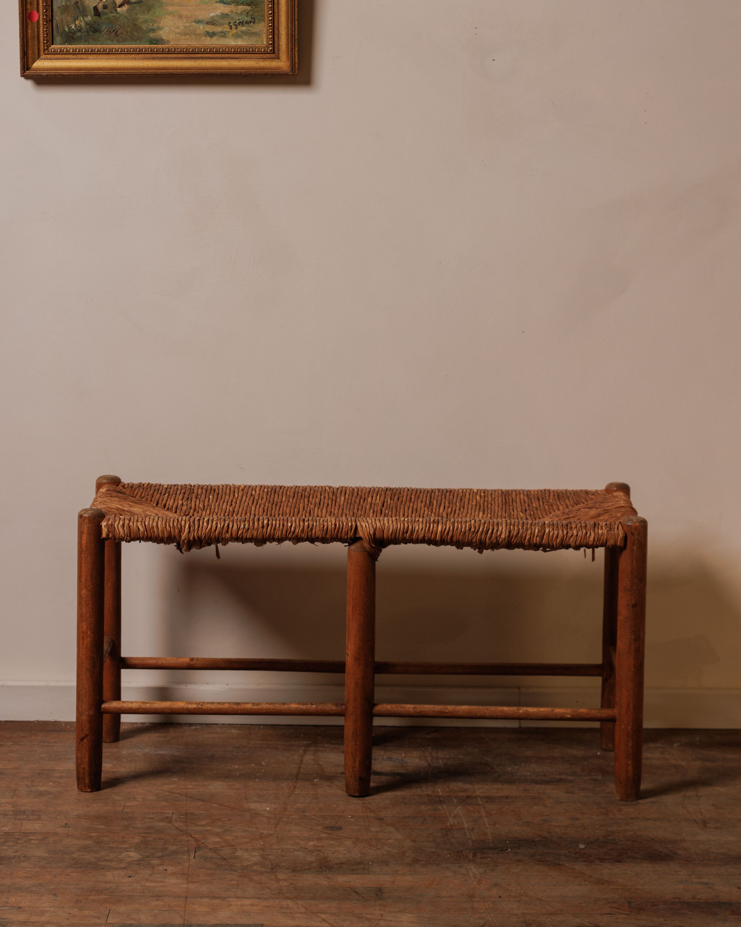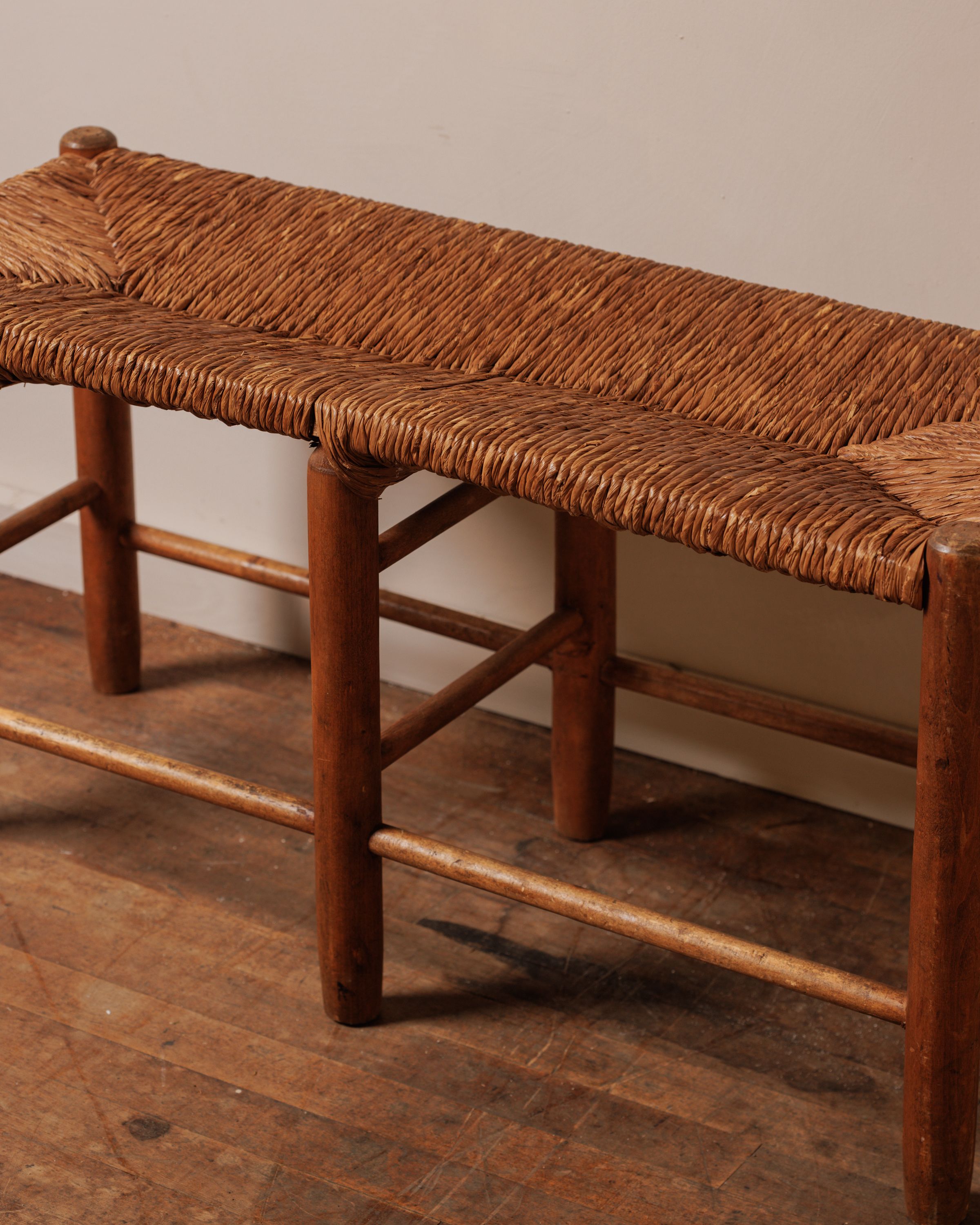 This is a true Sylvie favorite. The 1900 Provincial French Rush Seat Bench is a wonderful example of early 20th-century French provincial furniture. Hard carved from oak with a hand-woven rush seat, this ben bench were commonly found in rural French homes and farms. Sylvie adores using these benches at the end of a bed or along a hallway styled with books on her surface and vessels at her feet.