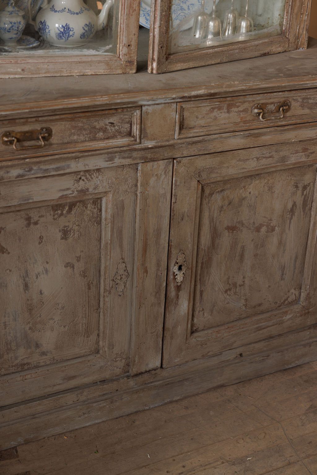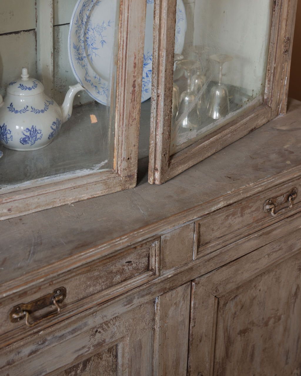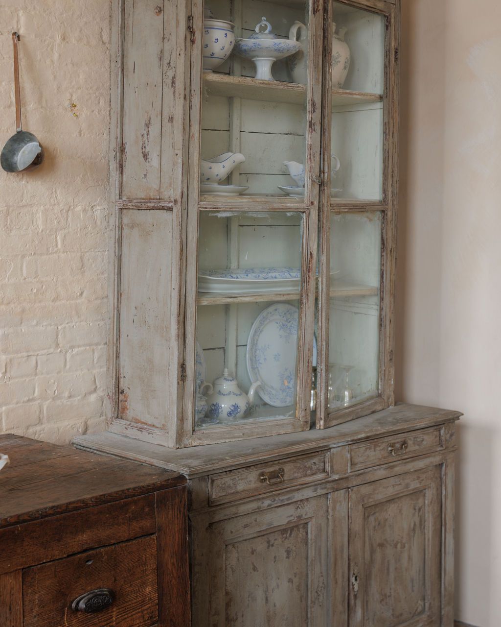 Meet the hutch that steals the whole kitchen. This 19th century French two-piece from a château in Provence has lived a long, hardworking life, its grey paint worn down to a soft, weathered patina that only decades of use can create. Behind its tall glass doors, shelves once cradled porcelain, copper pots, and pantry essentials, while the lower cupboards stored bulk provisions. The panels, hardware, and old paint layers all speak to the practical elegance of rural château kitchens. Today, Sylvie imagines it as the anchor piece of a modern home, filled with stacks of everyday dishes or treasures collected over time, the kind of hutch you’d happily build a whole room around. The doors don't close perfectly anymore, but she's a grandma, you can't expect her to run a marathon.