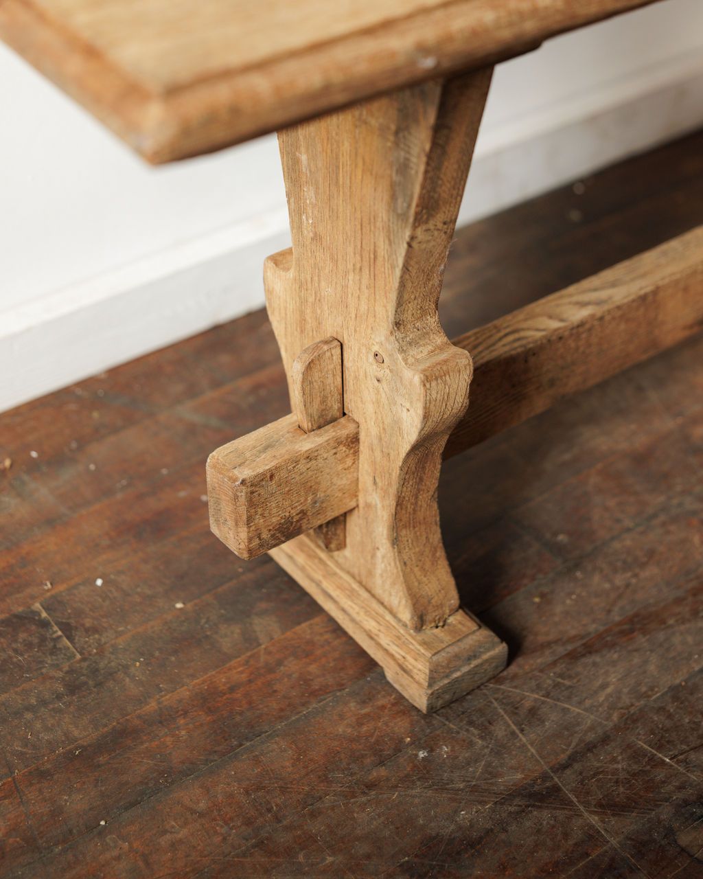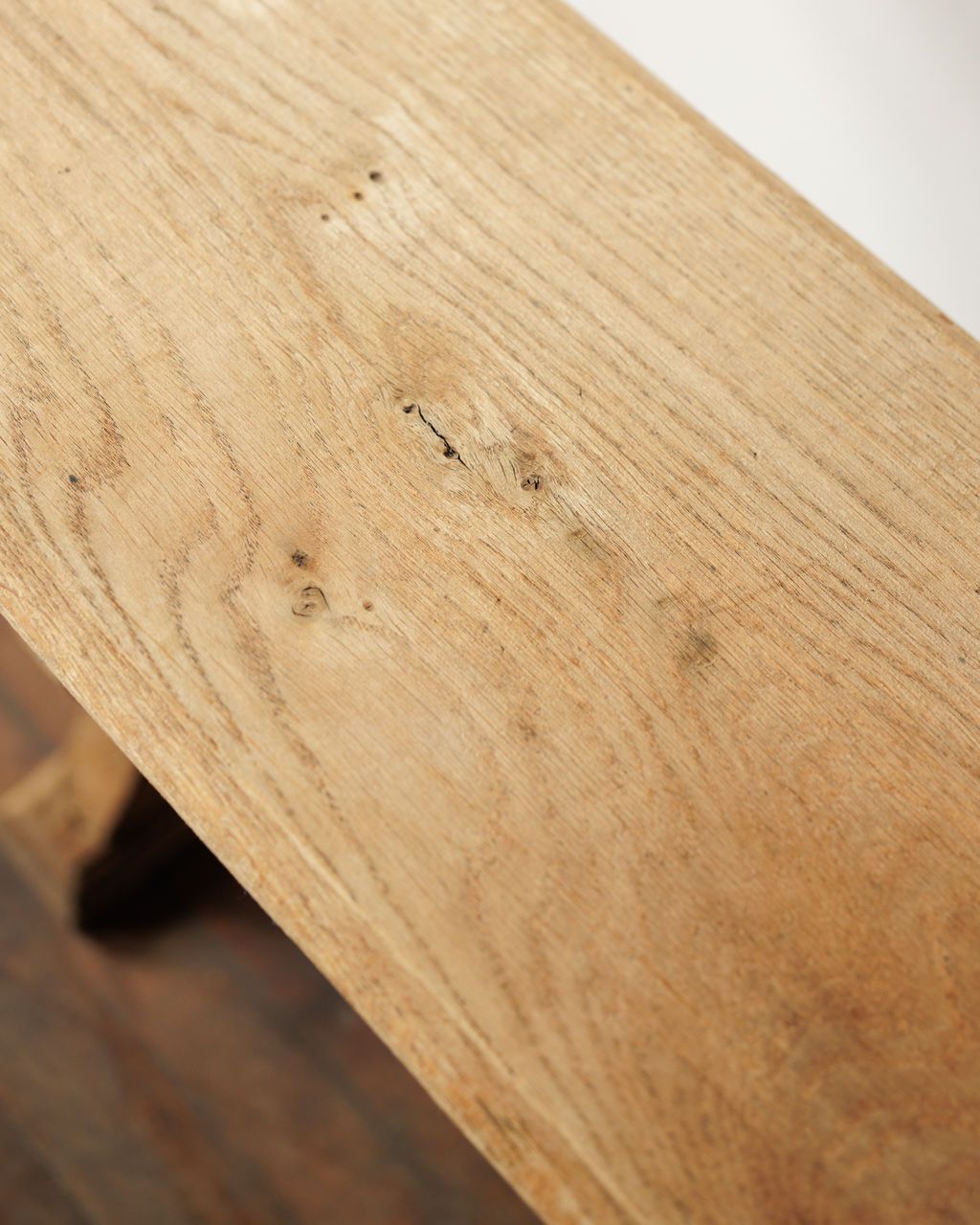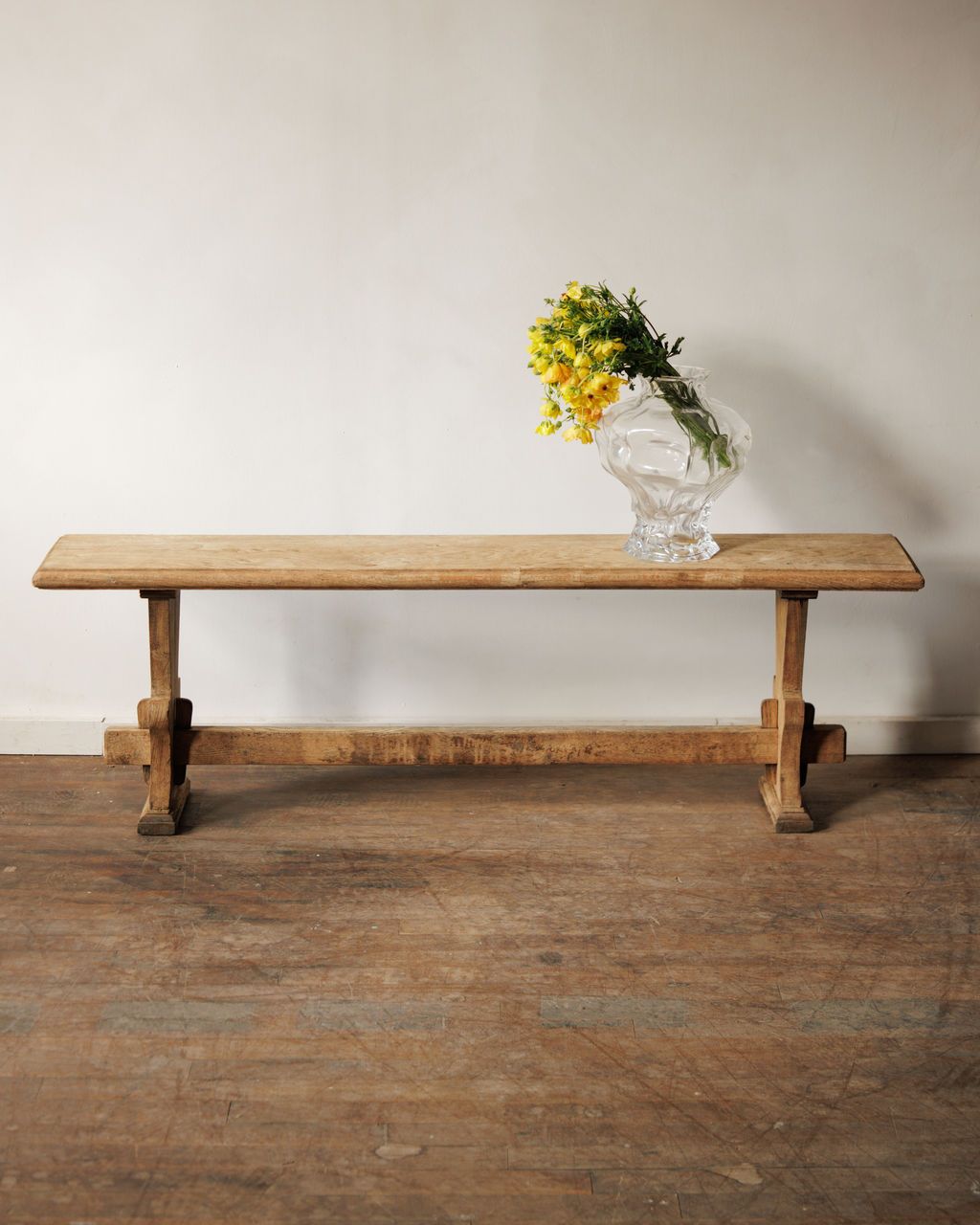 Made in France in the 20th century, this oak bench has a long, clean plank seat set on sturdy legs with a low stretcher that keeps the whole thing feeling grounded. We have two available, with slight variations that come from being made and used by hand rather than matched as a pair. The wood has settled into a warm, even tone, with small differences that give each bench its own character. Sylvie loves these pulled up to a dining table, set along a wall, or used anywhere you need seating for extra guests.