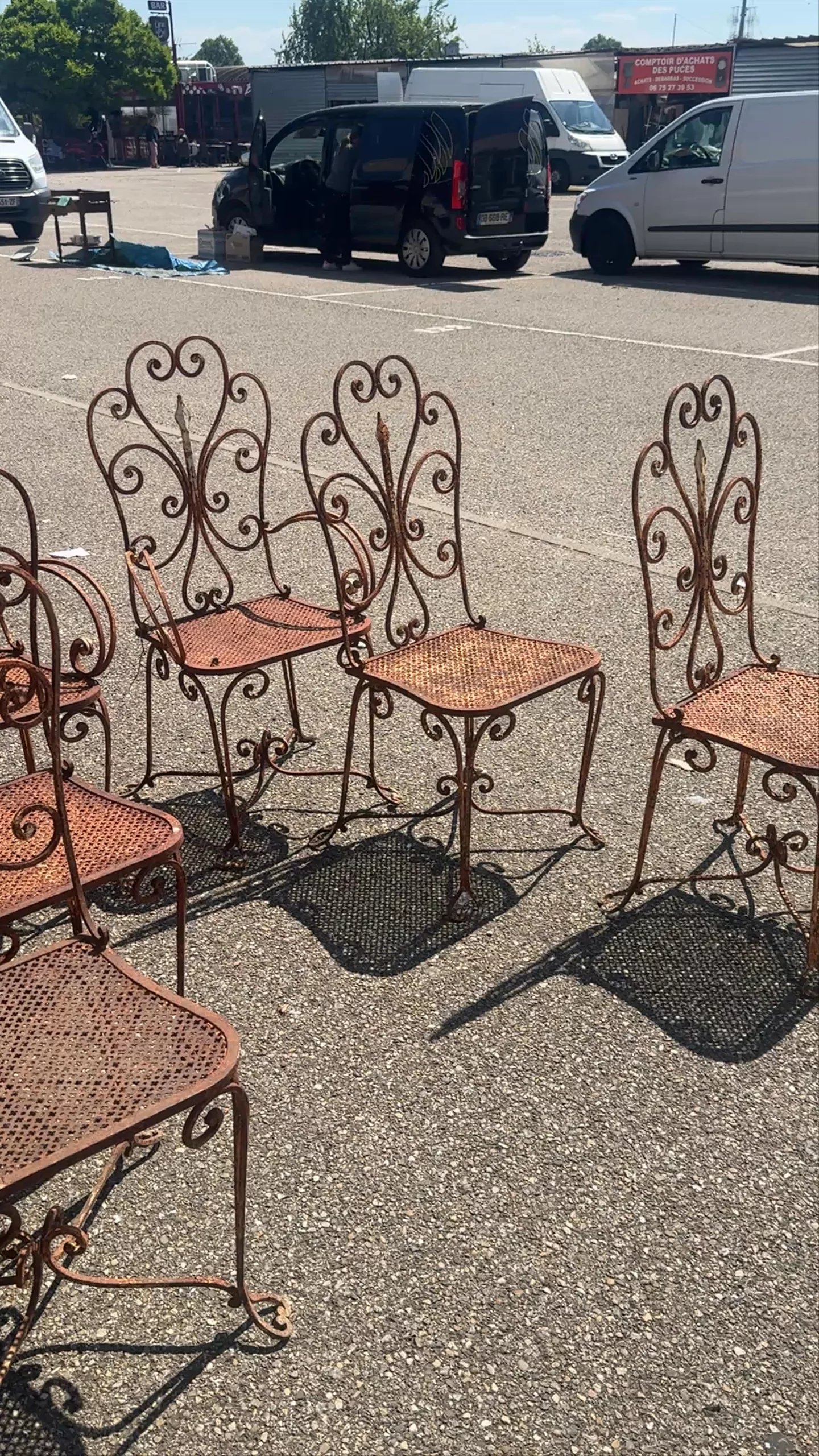 Sylvie first saw these chairs in Lyon and couldn’t stop staring, but the price felt out of reach. She walked away, only to think about them for days after. In Avignon, just as she was about to leave town, there they were again — same dealer, same chairs, as if they’d been waiting for her. This time, she didn’t let them slip. A pair of early 1900s wrought iron chairs from a maison in the Rhône-Alpes region, their backs curling into dramatic scrolls, their woven seats still strong. The iron carries its age with grace, each mark a reminder of the decades they’ve lived through. We’ve never seen anything like them - and Sylvie still can’t believe they’re finally hers to share. 6 available sold it sets of 2.