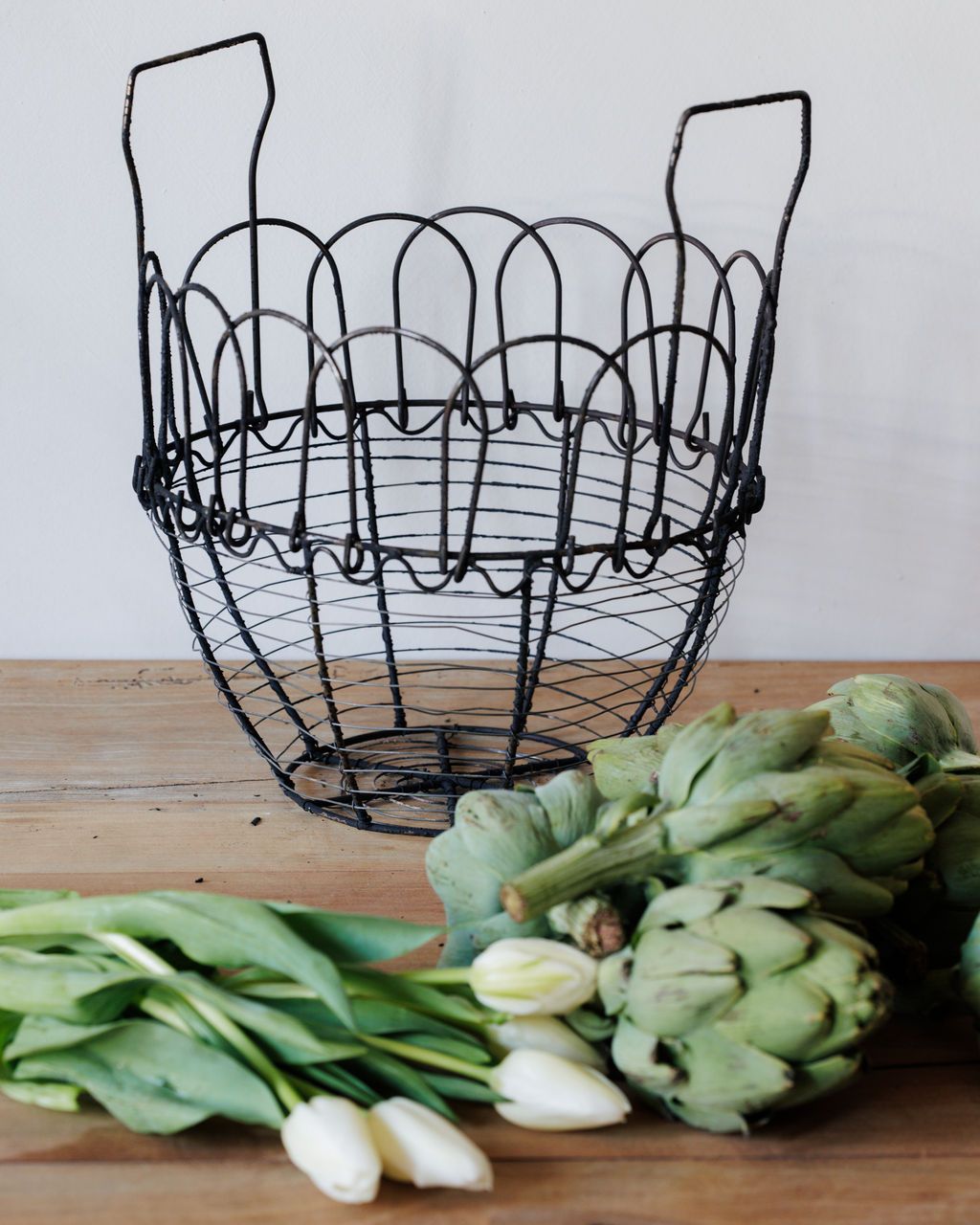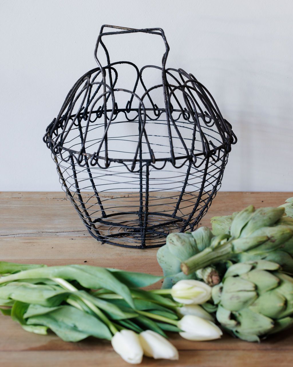 This hardworking antique French wire basket has earned its patina from decades of use across the countryside. Once essential for gathering eggs and produce, this 19th-century basket now makes the perfect storage or decorative piece. Sylvie loves it for holding fruit, veg, or your crystals. A one-of-a-kind find, exactly as pictured - its well-worn charm and history fully intact.