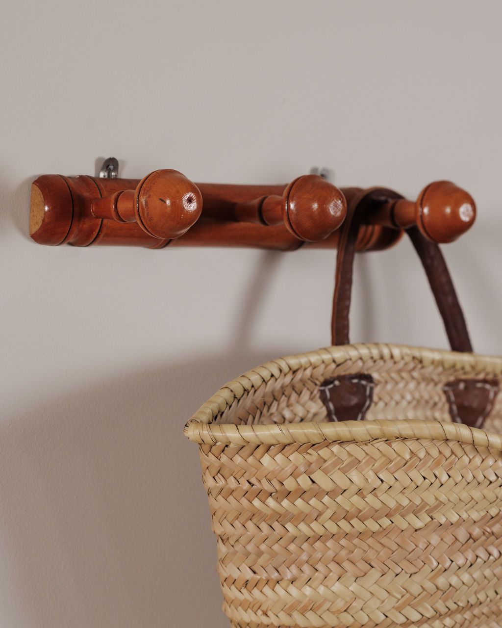 Calling all midcentury enthusiasts. This faux bamboo oak coat rack, with its turned wood mushroom like pegs, is both functional and oh, so French. Sylvie finds it perfect for entryways or bedrooms, a place to hang your coats, totes and hats neatly organized. We have two available!