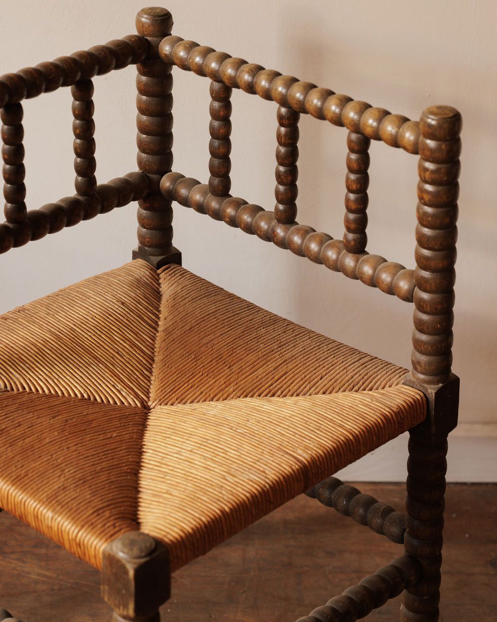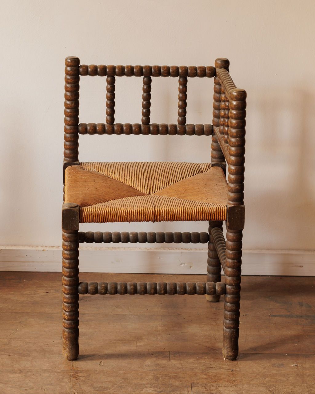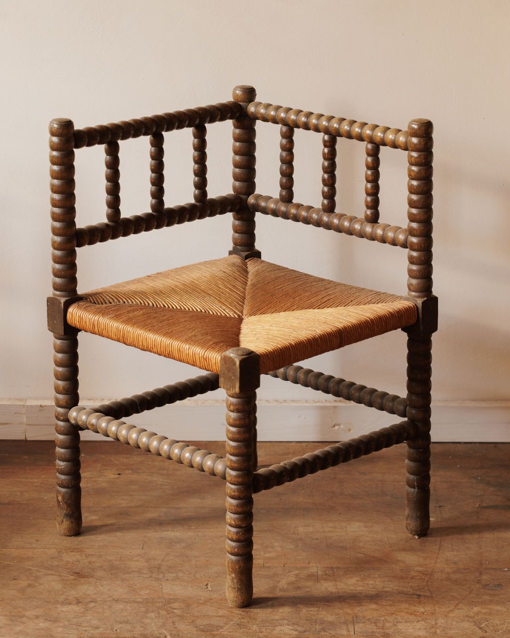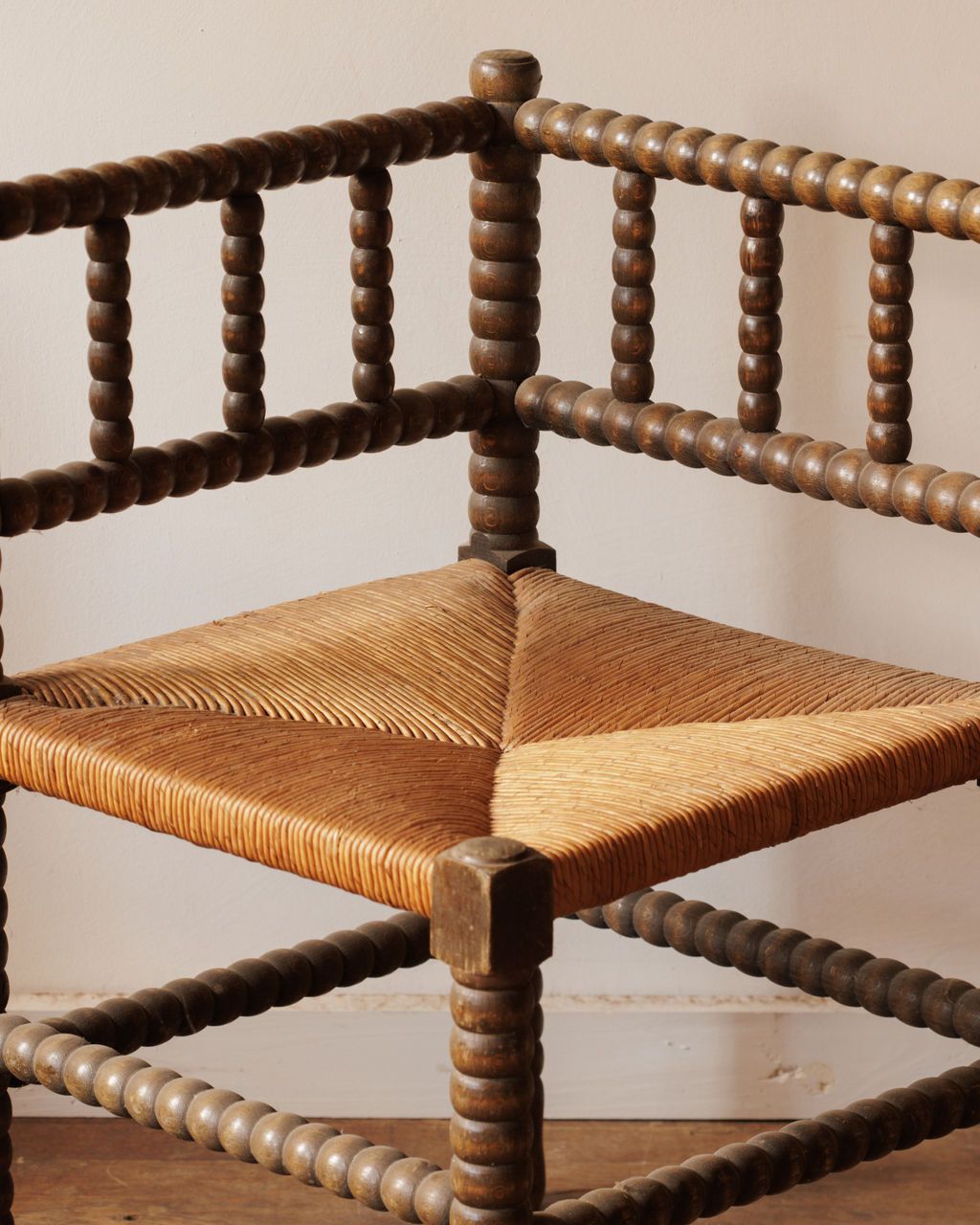 This is the kind of chair people regret not buying. A solid wood bobbin corner chair from Villeneuve, with beautifully turned spindles and a rush seat that still holds strong. Originally designed for French dressing rooms, its low, sturdy stance and sculptural frame make it just as striking now in a reading nook, a bathroom corner, or tucked beside a fireplace. Sylvie swears by it for that unexpected piece that makes guests say,