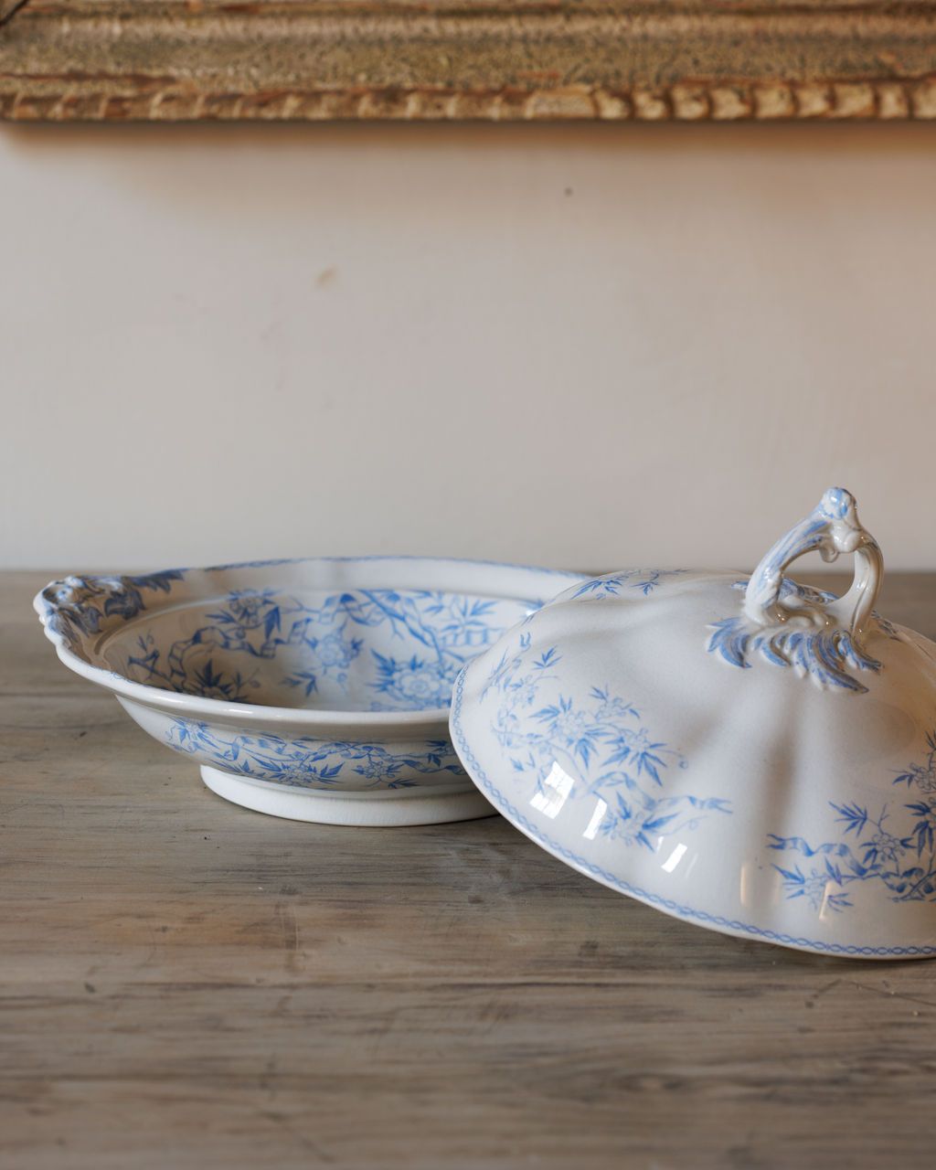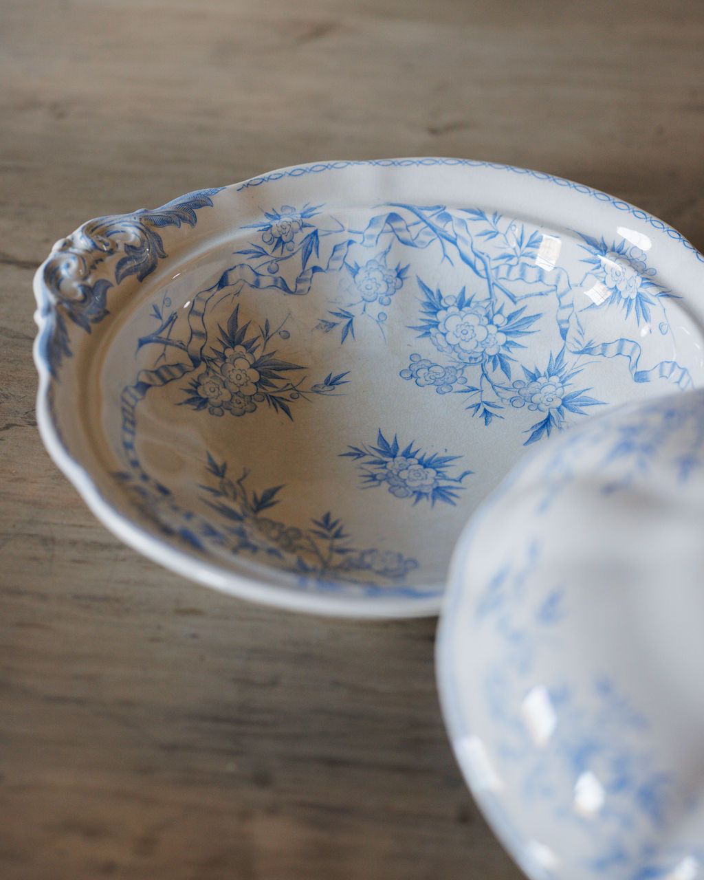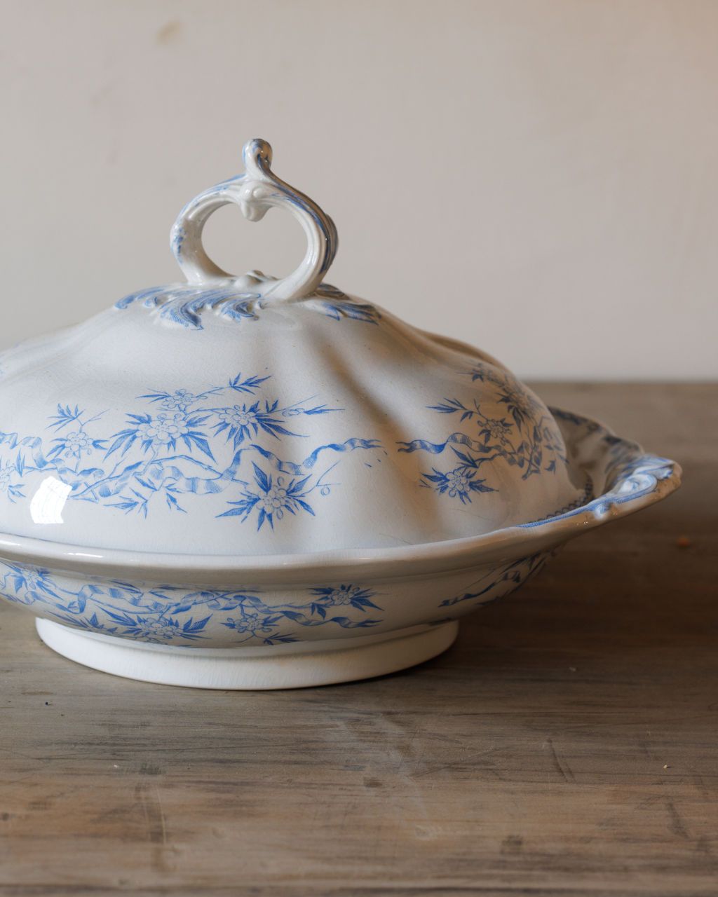 A proper dish for Sunday roasts and slow dinners. Made in France by Sarreguemines between the late 19th and early 20th centuries, this ironstone serving piece bears the “Epine” pattern- soft blue transferware florals winding across a scalloped base and domed lid. Once part of a larger table service, it would have held stews, potatoes, or poached fish. Today, it’s equally charming on a sideboard or open shelf, lid perched slightly askew to reveal linen napkins or citrus. Sylvie loves its gentle blue and timeworn glaze for layering with other French ceramics.