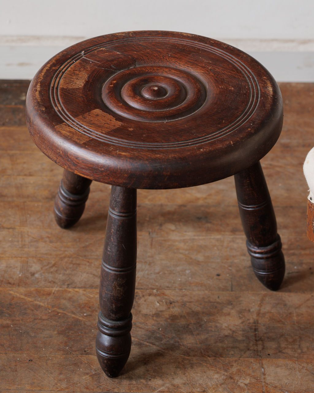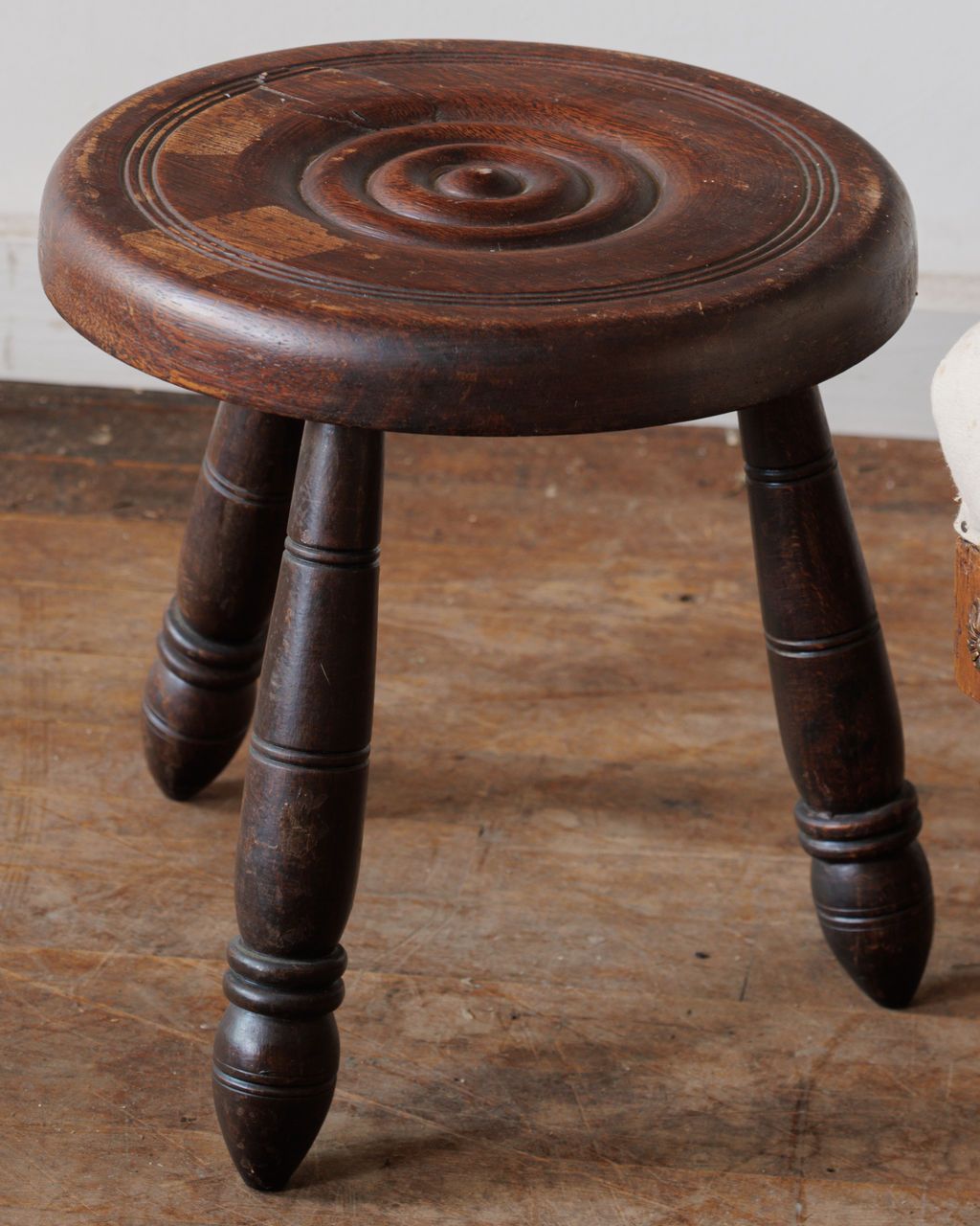 This stool was found in France and dates to the midcentury. It’s made from solid wood, with a circular seat carved in soft ripples that seem to catch the light as you walk past. Three turned legs give it an easy balance - sturdy, but with that quiet French refinement. The surface shows gentle wear from use, the kind that only makes it better. Two nearly identical stools are available, each sold separately. Sylvie keeps one beside a reading chair, topped with a candle and a half-finished book.