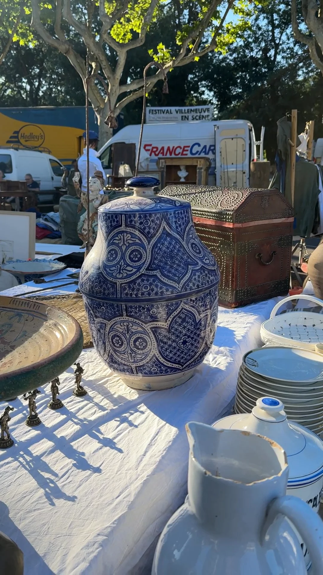 From kitchen essential to collector’s piece. Found in Villeneuve-lès-Avignon, this large two-part Moroccan Jabbara pot is richly decorated in blue and white ceramic, its intricate geometric motifs a signature of Fez craftsmanship. A small chip at the lip hints at a long, well-lived history. Derived from the Arabic word