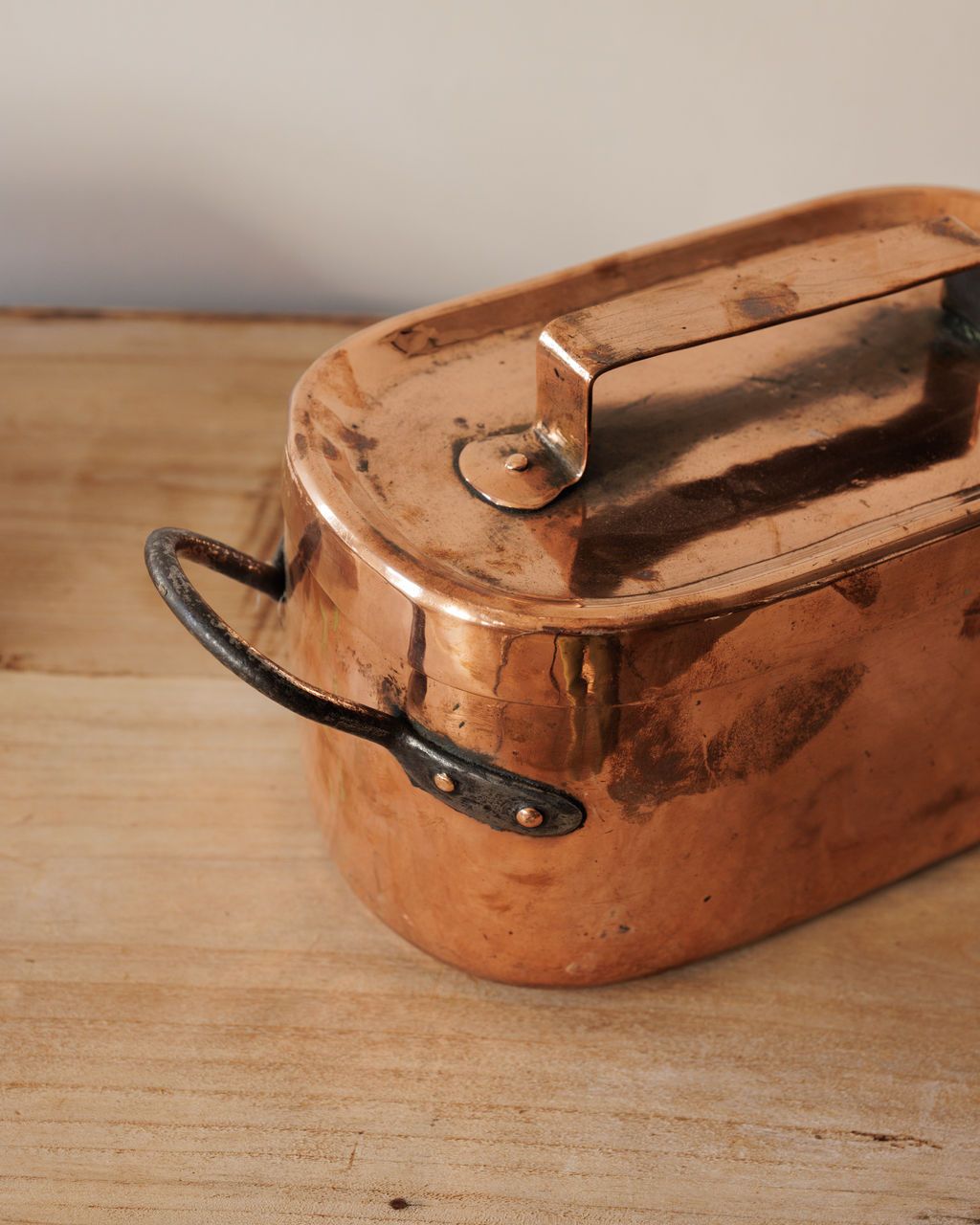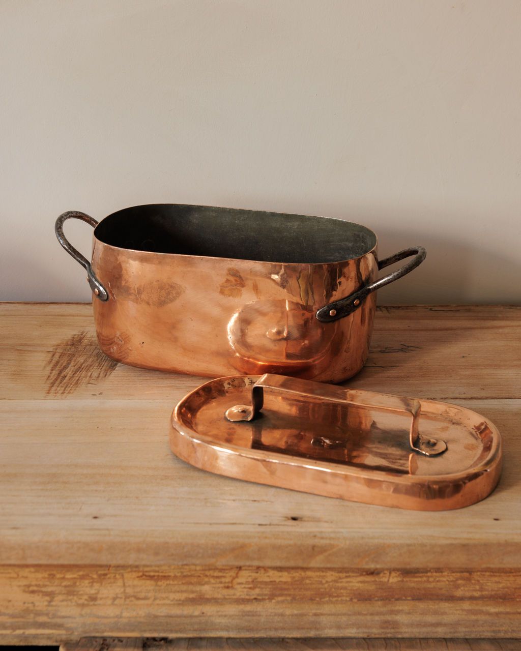 Too handsome to hide in a cabinet. Found in Villeneuve and refreshed by a copper polisher in France, this antique pot is a proper French piece with the good kind of imperfections. The body is hand-forged copper with iron handles and a tin-lined interior, once used on a farmhouse stove for soups or preserves. Sylvie loves how its polished surface still carries the soft marks of its making, proof that beauty and utility can age together gracefully.