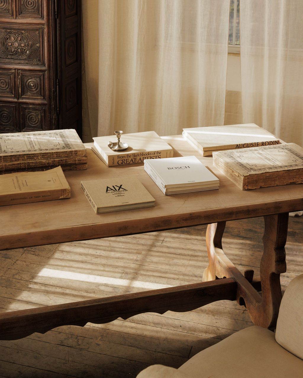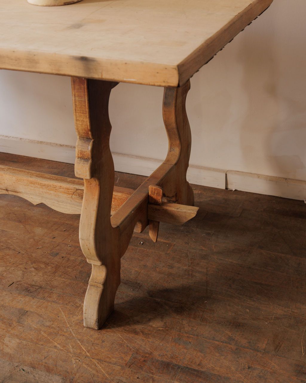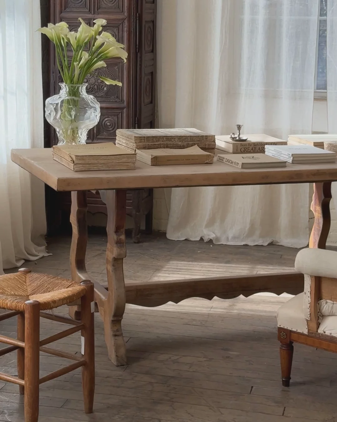 A table made for bread, wine, and hours of conversation. Found in Villeneuve and dating to the early 20th century, this Spanish monastery table carries the restrained beauty of ecclesiastical design. The trestle base is hand-carved with gentle curves and a scalloped stretcher, details that nod to its monastic origins. Originally built for shared meals in a monastery refectory, it’s now perfect for modern gatherings of a different kind. Sylvie likes it as a dining table or long console, where its honest form and quiet history ground a room instantly.