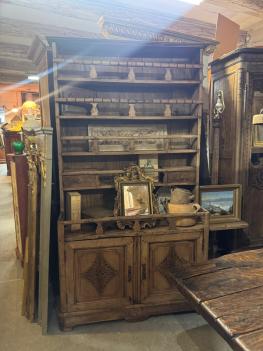The open shelving above, worn smooth from decades of use, still shows the soft traces of its original wax finish. It’s both architectural and intimate, the kind of piece that would have anchored a farmhouse kitchen for generations. Sylvie loves its presence against pale plaster walls, filled with ceramics, glass, and the hum of daily life continuing around it.