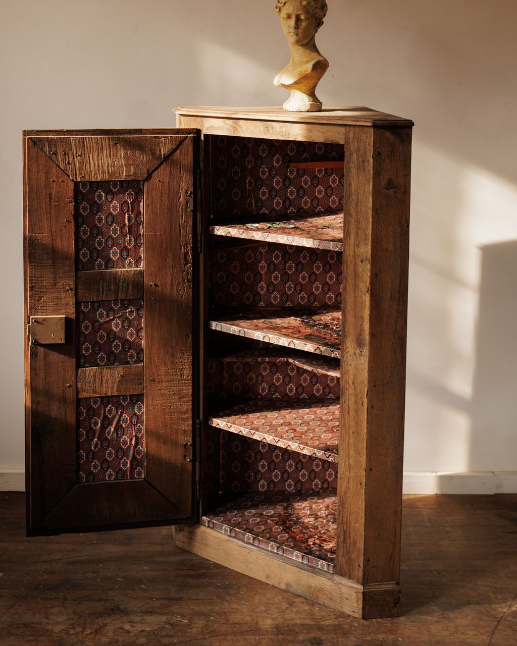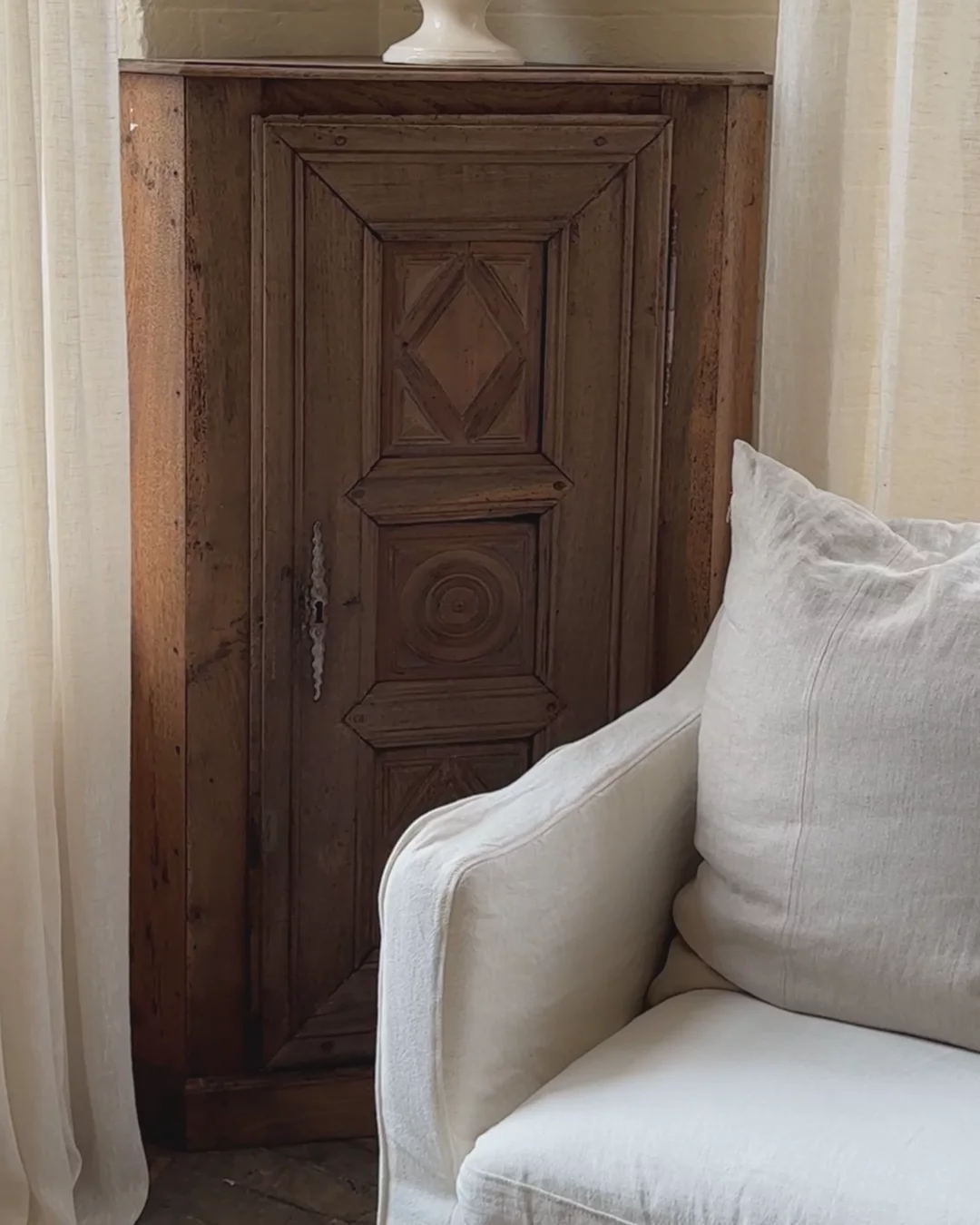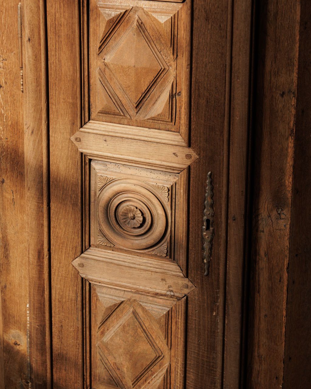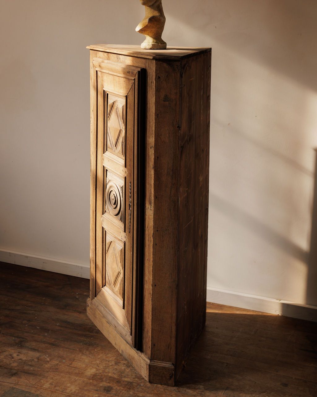 Corner upgrade unlocked! This 19th century corner cabinet, found in Avignon and once part of a grand maison in Arles, brings old world French craftsmanship right into modern life. Its carved diamond panels and circular medallion front give it architectural presence, while the sanded raw oak reveals centuries of quiet use. Compact but stately, it slips neatly into a corner and offers storage that feels both practical and elegant, ready to house linens, tableware, or whatever treasures you choose. Only one left!