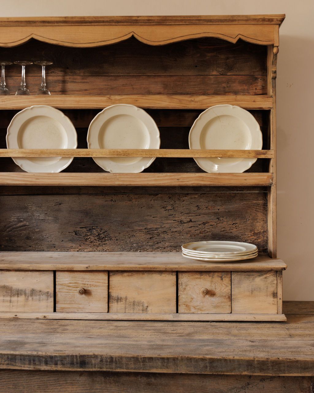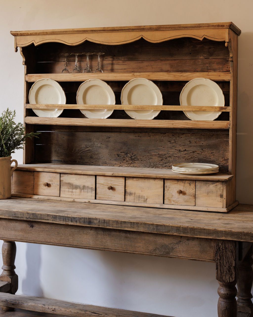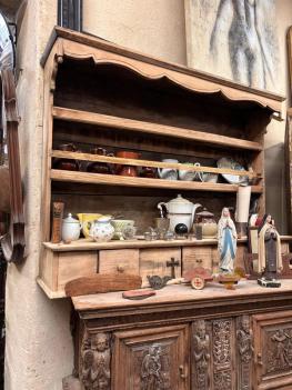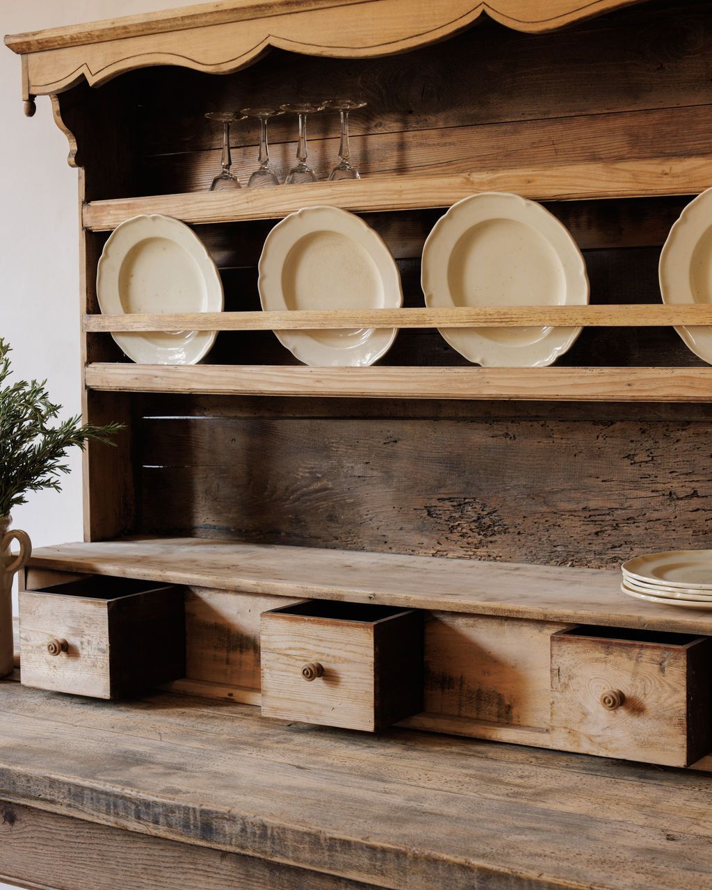 Built for plates, pitchers, and the rhythm of a French farmhouse kitchen. Found in Vauvert and dating to the early 20th century, this pine hutch was designed for daily use, with open shelving for display and four small drawers for linens or utensils. The scalloped trim and softly worn surfaces speak to its long life at the center of a busy home. Once filled with crockery and glassware within reach of the cook, it remains just as functional today. Sylvie likes it stocked with mismatched ceramics and bottles of wine, a quiet reminder that the best kitchens are always working ones. Table not included.