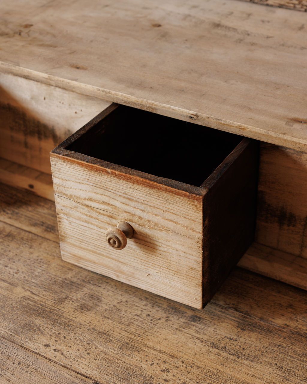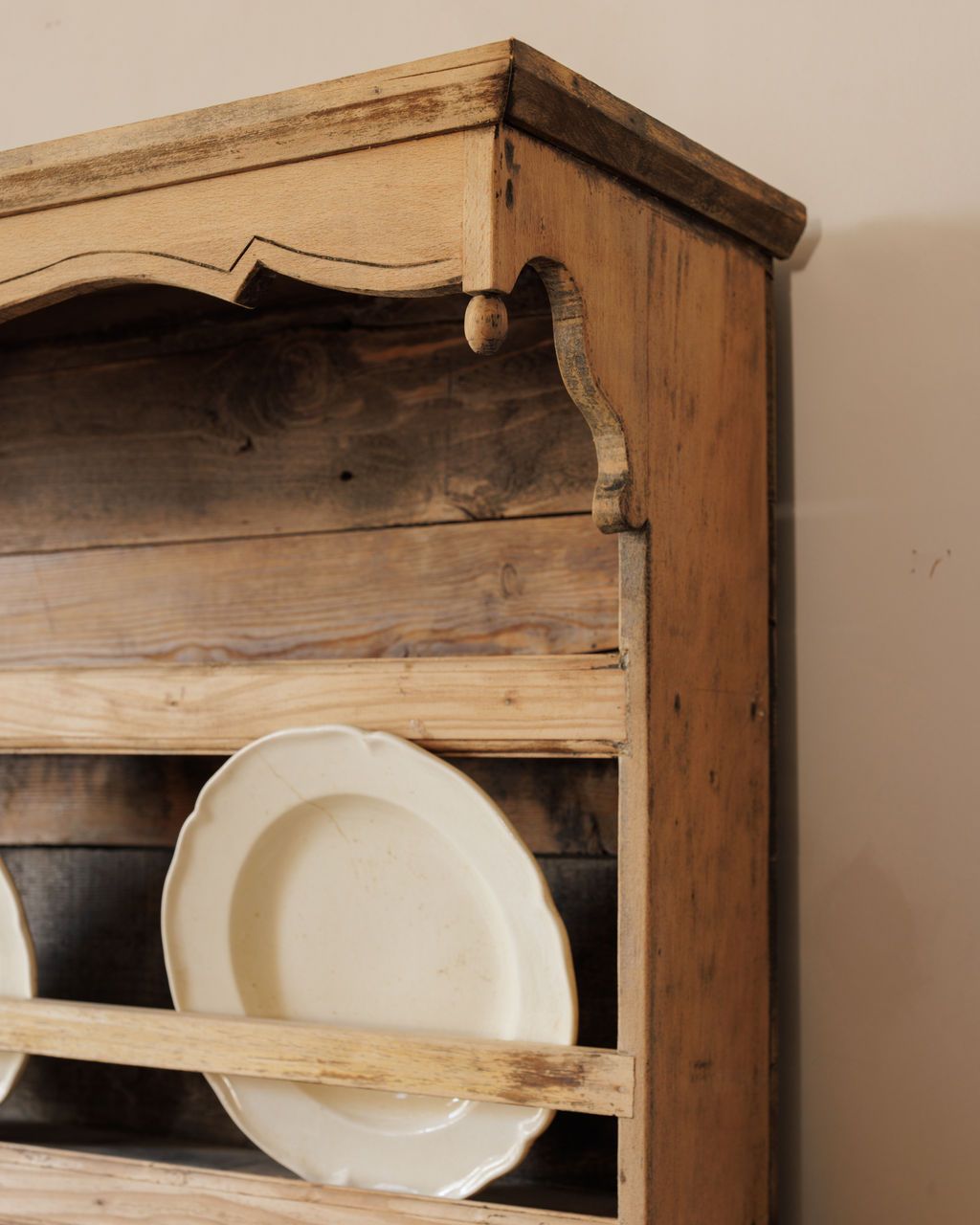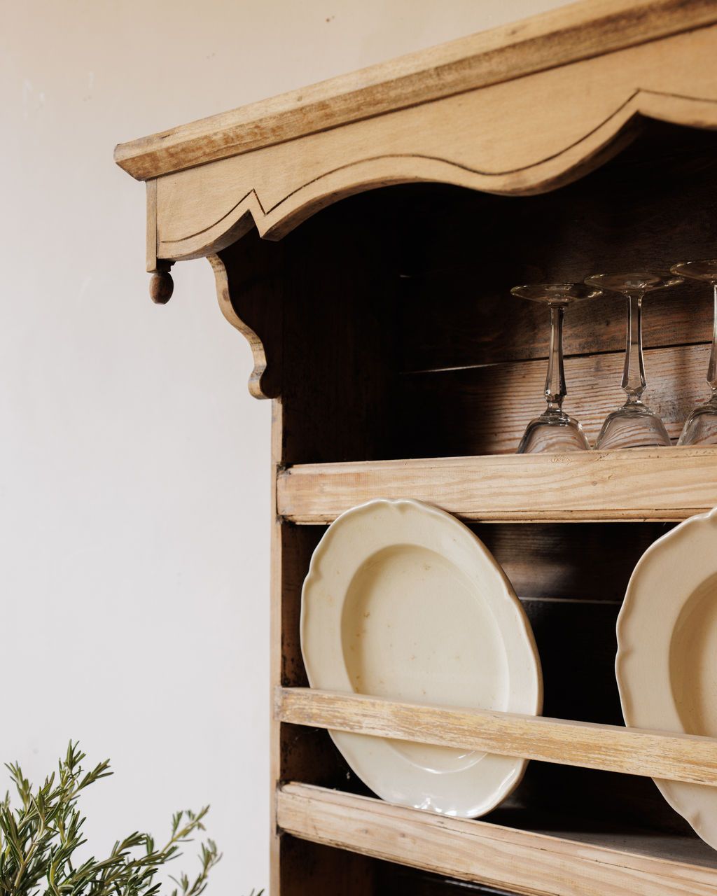 Built for plates, pitchers, and the rhythm of a French farmhouse kitchen. Found in Vauvert and dating to the early 20th century, this pine hutch was designed for daily use, with open shelving for display and four small drawers for linens or utensils. The scalloped trim and softly worn surfaces speak to its long life at the center of a busy home. Once filled with crockery and glassware within reach of the cook, it remains just as functional today. Sylvie likes it stocked with mismatched ceramics and bottles of wine, a quiet reminder that the best kitchens are always working ones. Table not included.